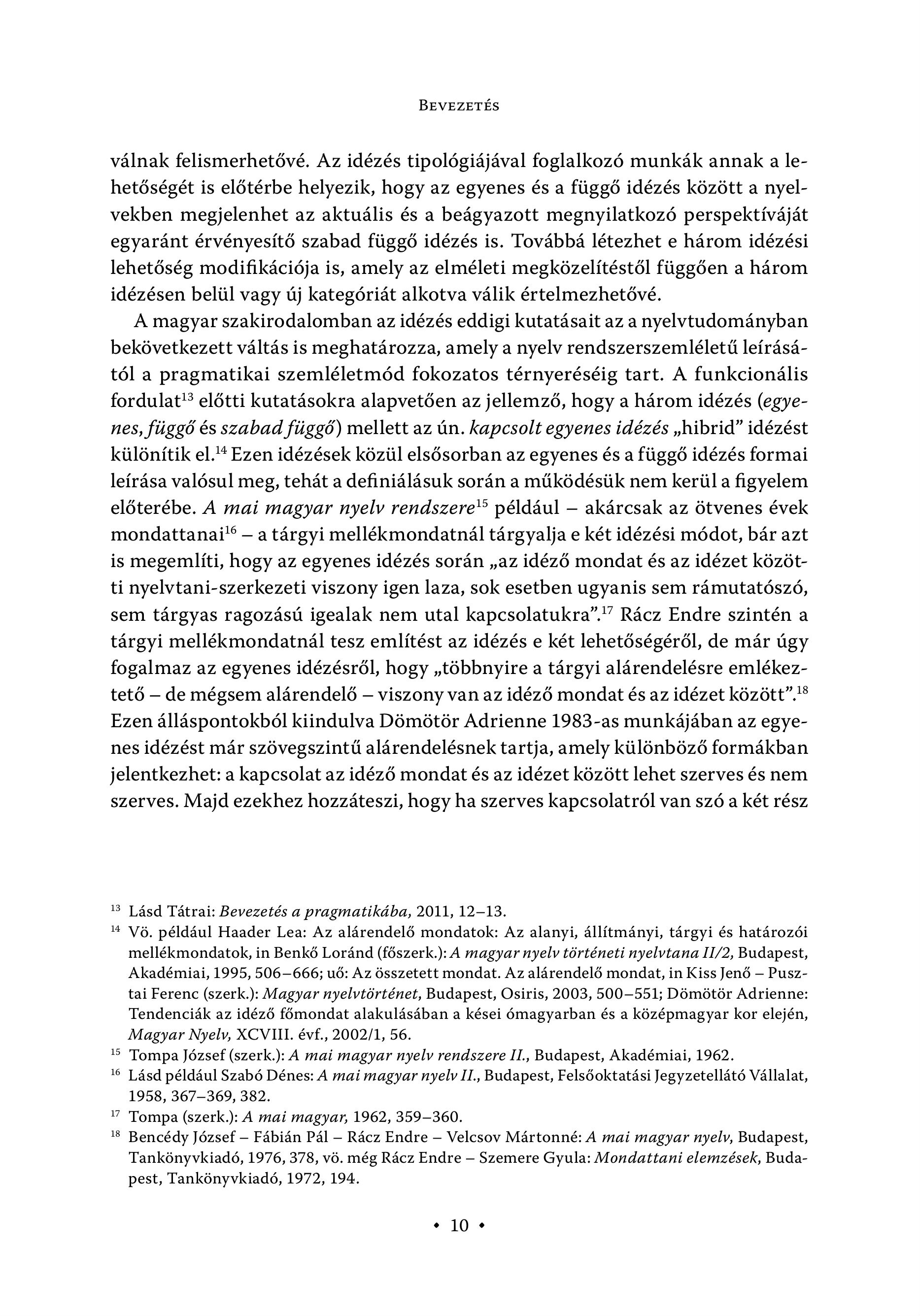 BEVEZETÉS válnak felismerhetővé. Az idézés tipológiájával foglalkozó munkák annak a lehetőségét is előtérbe helyezik, hogy az egyenes és a függő idézés között a nyelvekben megjelenhet az aktuális és a beágyazott megnyilatkozó perspektíváját egyaránt érvényesítő szabad függő idézés is. Továbbá létezhet e három idézési lehetőség modifikációja is, amely az elméleti megközelítéstől függően a három idézésen belül vagy új kategóriát alkotva válik értelmezhetővé. A magyar szakirodalomban az idézés eddigi kutatásait az a nyelvtudomänyban bekövetkezett váltás is meghatározza, amely a nyelv rendszerszemléletű leírásától a pragmatikai szemléletmód fokozatos térnyeréséig tart. A funkcionális fordulat? előtti kutatásokra alapvetően az jellemző, hogy a három idézés (egyenes, függő és szabad függő) mellett az ún. kapcsolt egyenes idézés , hibrid" idézést különítik el." Ezen idézések közül elsősorban az egyenes és a függő idézés formai leírása valósul meg, tehát a definiálásuk során a működésük nem kerül a figyelem előterébe. A mai magyar nyelv rendszere" például — akárcsak az ötvenes évek mondattanai’® — a tárgyi mellékmondatnál tárgyalja e két idézési módot, bár azt is megemlíti, hogy az egyenes idézés során , az idéző mondat és az idézet közötti nyelvtani-szerkezeti viszony igen laza, sok esetben ugyanis sem rámutatószó, sem tárgyas ragozású igealak nem utal kapcsolatukra". " Rácz Endre szintén a tárgyi mellékmondatnál tesz említést az idézés e két lehetőségéről, de már úgy fogalmaz az egyenes idézésről, hogy , többnyire a tárgyi alárendelésre emlékeztető — de mégsem alárendelő — viszony van az idéző mondat és az idézet között"."§ Ezen álláspontokból kiindulva Dömötör Adrienne 1983-as munkájában az egyenes idézést már szövegszintű alárendelésnek tartja, amely különböző formákban jelentkezhet: a kapcsolat az idéző mondat és az idézet között lehet szerves és nem szerves. Majd ezekhez hozzáteszi, hogy ha szerves kapcsolatról van szó a két rész 8 Lásd Tátrai: Bevezetés a pragmatikába, 2011, 12-13. 4 Vö. például Haader Lea: Az alárendelő mondatok: Az alanyi, állítmányi, tárgyi és határozói mellekmondatok, in Benkö Loränd (föszerk.): A magyar nyelv törteneti nyelvtana II/2, Budapest, Akadémiai, 1995, 506-666; u6: Az összetett mondat. Az alárendelő mondat, in Kiss Jenő — Pusztai Ferenc (szerk.): Magyar nyelvtörtenet, Budapest, Osiris, 2003, 500-551; Dömötör Adrienne: Tendenciák az idéző főmondat alakulásában a kései ómagyarban és a középmagyar kor elején, Magyar Nyelv, XCVIII. évf., 2002/1, 56. Tompa József (szerk.): A mai magyar nyelv rendszere II., Budapest, Akadémiai, 1962. Lásd például Szabó Dénes: A mai magyar nyelv II., Budapest, Felsőoktatási Jegyzetellátó Vállalat, 1958, 367-369, 382. 17 Tompa (szerk.): À mai magyar, 1962, 359-360. Bencédy Jézsef — Fabian Pal — Räcz Endre — Velcsov Martonné: A mai magyar nyelv, Budapest, Tankönyvkiadó, 1976, 378, vö. még Rácz Endre — Szemere Gyula: Mondattani elemzések, Budapest, Tankönyvkiadó, 1972, 194. = a = a +10 +