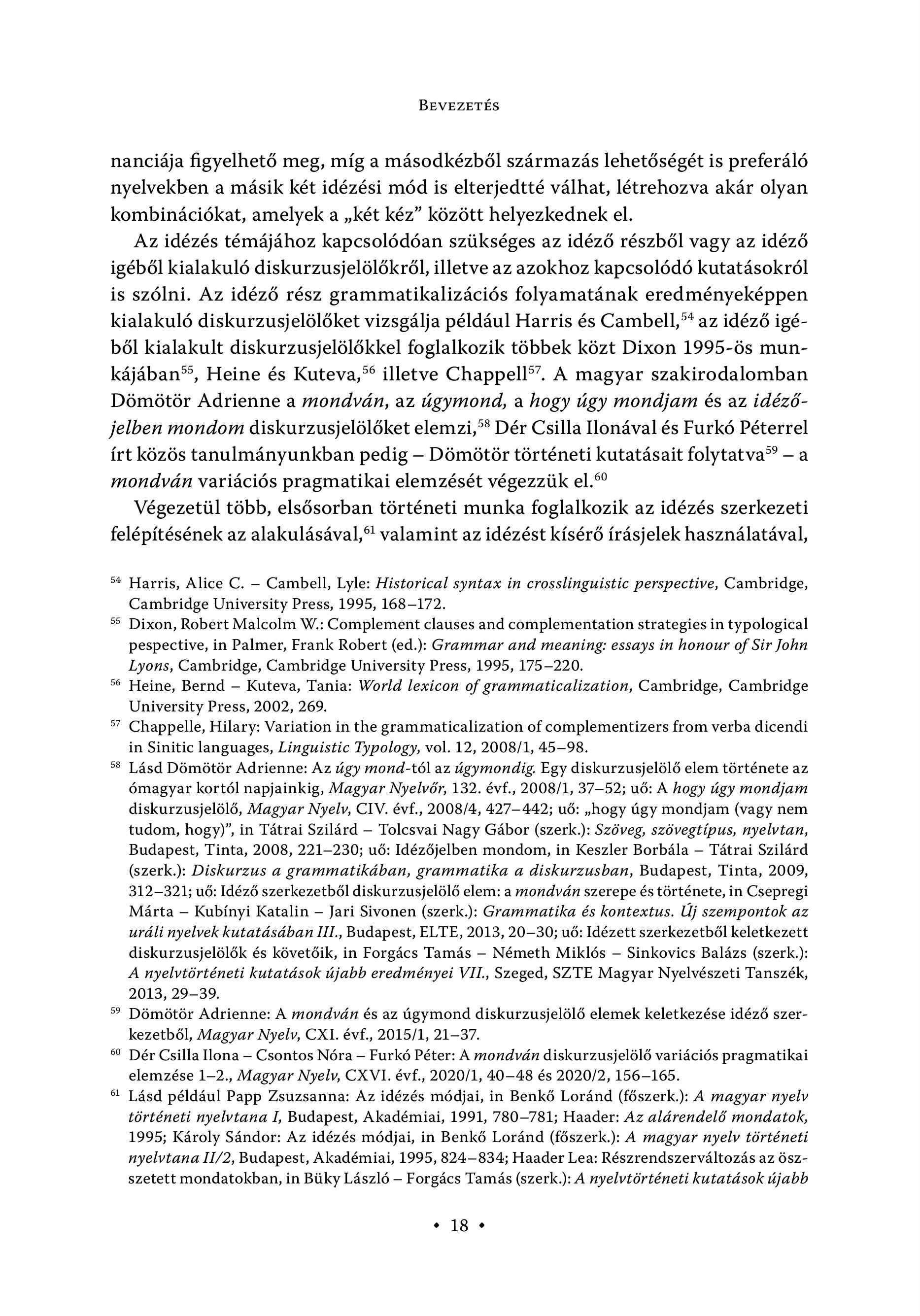 BEVEZETÉS nanciája figyelhető meg, míg a másodkézből származás lehetőségét is preferáló nyelvekben a másik két idézési mód is elterjedtté válhat, létrehozva akár olyan z kombinációkat, amelyek a , két kéz" között helyezkednek el. Az idézés témájához kapcsolódóan szükséges az idéző részből vagy az idéző igéből kialakuló diskurzusjelölőkről, illetve az azokhoz kapcsolódó kutatásokról is szólni. Az idéző rész grammatikalizációs folyamatának eredményeképpen kialakuló diskurzusjelölőket vizsgálja például Harris és Cambell,"" az idéző igéből kialakult diskurzusjelölőkkel foglalkozik többek közt Dixon 1995-ös munkäjäban”, Heine &s Kuteva,°® illetve Chappell’”. A magyar szakirodalomban Dömötör Adrienne a mondván, az úgymond, a hogy úgy mondjam és az idezöjelben mondom diskurzusjelölőket elemzi, ? Dér Csilla Ilonával és Furkó Péterrel írt közös tanulmányunkban pedig — Dömötör történeti kutatásait folytatva"? — a mondván variációs pragmatikai elemzését végezzük el." Végezetül több, elsősorban történeti munka foglalkozik az idézés szerkezeti wre felépítésének az alakulasaval,” valamint az idézést kísérő írásjelek használatával, 54 Harris, Alice C. — Cambell, Lyle: Historical syntax in crosslinguistic perspective, Cambridge, Cambridge University Press, 1995, 168—172. Dixon, Robert Malcolm W.: Complement clauses and complementation strategies in typological pespective, in Palmer, Frank Robert (ed.): Grammar and meaning: essays in honour of Sir John Lyons, Cambridge, Cambridge University Press, 1995, 175-220. Heine, Bernd — Kuteva, Tania: World lexicon of grammaticalization, Cambridge, Cambridge University Press, 2002, 269. Chappelle, Hilary: Variation in the grammaticalization of complementizers from verba dicendi in Sinitic languages, Linguistic Typology, vol. 12, 2008/1, 45-98. Lásd Dömötör Adrienne: Az ugy mond-tol az ugymondig. Egy diskurzusjelölő elem története az ómagyar kortól napjainkig, Magyar Nyelv6r, 132. évf., 2008/1, 37—52; uő: A hogy úgy mondjam diskurzusjelölö, Magyar Nyelv, CIV. évf., 2008/4, 427-442; ud: ,hogy igy mondjam (vagy nem tudom, hogy)", in Tátrai Szilárd — Tolcsvai Nagy Gábor (szerk.): Szöveg, szövegtípus, nyelvtan, Budapest, Tinta, 2008, 221-230; uö: Idezöjelben mondom, in Keszler Borbäla — Tátrai Szilárd (szerk.): Diskurzus a grammatikdban, grammatika a diskurzusban, Budapest, Tinta, 2009, 312-321; ud: Idéz6 szerkezetböl diskurzusjelölö elem: a mondván szerepe és története, in Csepregi Márta - Kubínyi Katalin — Jari Sivonen (szerk.): Grammatika és kontextus. Új szempontok az uráli nyelvek kutatásában III., Budapest, ELTE, 2013, 20-30; uő: Idézett szerkezetből keletkezett diskurzusjelölők és követőik, in Forgács Tamás — Németh Miklós - Sinkovics Balázs (szerk.): A nyelvtörténeti kutatások újabb eredményei VII., Szeged, SZTE Magyar Nyelvészeti Tanszék, 2013, 29-39. Dömötör Adrienne: A mondván és az úgymond diskurzusjelölő elemek keletkezése idéző szerkezetből, Magyar Nyelv, CXI. évf., 2015/1, 21—37. Dér Csilla Ilona — Csontos Nóra — Furkó Péter: A mondván diskurzusjelölő variációs pragmatikai elemzése 1—2., Magyar Nyelv, CXVI. évf., 2020/1, 40-48 és 2020/2, 156-165. Lásd például Papp Zsuzsanna: Az idézés módjai, in Benkő Loránd (főszerk.): A magyar nyelv történeti nyelvtana I, Budapest, Akadémiai, 1991, 780-781; Haader: Az alárendelő mondatok, 1995; Károly Sándor: Az idézés módjai, in Benkő Loránd (főszerk.): A magyar nyelv történeti nyelvtana II/2, Budapest, Akadémiai, 1995, 824-834; Haader Lea: Reszrendszervältozäs az öszszetett mondatokban, in Büky László — Forgács Tamás (szerk.): A nyelvtörténeti kutatások újabb 55 56 58 u © a S 6. +18 +
