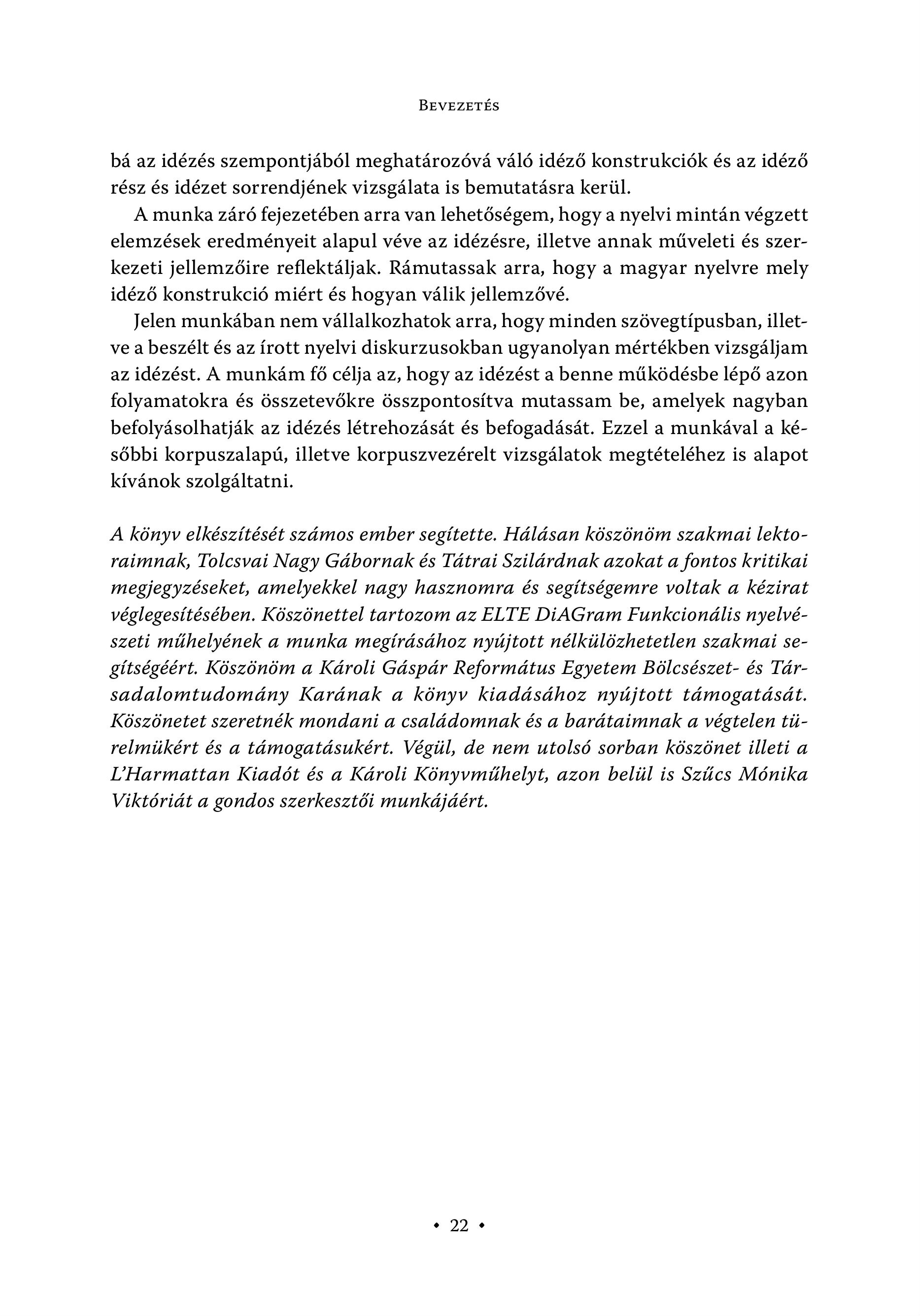 BEVEZETÉS sow sow bá az idézés szempontjából meghatározóvá váló idéző konstrukciók és az idéző rész és idézet sorrendjének vizsgálata is bemutatásra kerül. A munka záró fejezetében arra van lehetőségem, hogy a nyelvi mintán végzett elemzések eredményeit alapul véve az idézésre, illetve annak műveleti és szerkezeti jellemzőire reflektáljak. Rámutassak arra, hogy a magyar nyelvre mely idéző konstrukció miért és hogyan válik jellemzővé. Jelen munkában nem vállalkozhatok arra, hogy minden szövegtípusban, illetve a beszélt és az írott nyelvi diskurzusokban ugyanolyan mértékben vizsgáljam az idézést. A munkám fő célja az, hogy az idézést a benne működésbe lépő azon folyamatokra és összetevőkre összpontosítva mutassam be, amelyek nagyban befolyásolhatják az idézés létrehozását és befogadását. Ezzel a munkával a későbbi korpuszalapú, illetve korpuszvezérelt vizsgálatok megtételéhez is alapot kívánok szolgáltatni. A könyv elkészítését számos ember segítette. Hálásan köszönöm szakmai lektoraimnak, Tolcsvai Nagy Gábornak és Tátrai Szilárdnak azokat a fontos kritikai megjegyzéseket, amelyekkel nagy hasznomra és segítségemre voltak a kézirat véglegesítésében. Köszönettel tartozom az ELTE DiAGram Funkcionális nyelvészeti műhelyének a munka megírásához nyújtott nélkülözhetetlen szakmai segítségéért. Köszönöm a Károli Gáspár Református Egyetem Bölcsészet- és Társadalomtudomány Karának a könyv kiadásához nyújtott támogatását. Köszönetet szeretnék mondani a családomnak és a barátaimnak a végtelen türelmükért és a támogatásukért. Végül, de nem utolsó sorban köszönet illeti a LHarmattan Kiadót és a Károli Könyvműhelyt, azon belül is Szűcs Mónika Viktóriát a gondos szerkesztői munkájáért. «22 ¢