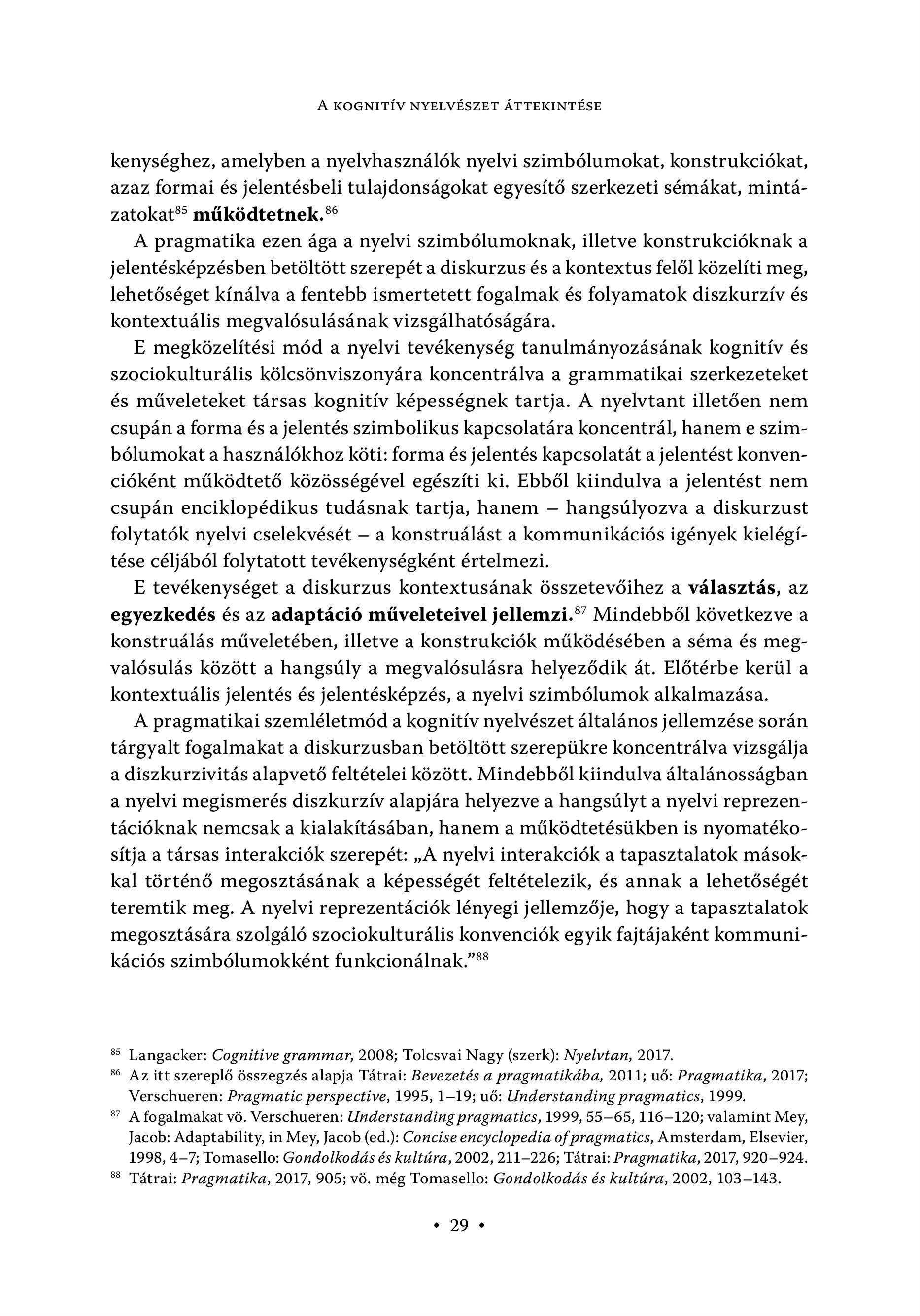 A KOGNITÍV NYELVÉSZET ÁTTEKINTÉSE kenységhez, amelyben a nyelvhasználók nyelvi szimbólumokat, konstrukciókat, azaz formai és jelentésbeli tulajdonságokat egyesítő szerkezeti sémákat, mintázatokat? működtetnek." A pragmatika ezen ága a nyelvi szimbólumoknak, illetve konstrukcióknak a jelentésképzésben betöltött szerepét a diskurzus és a kontextus felől közelíti meg, lehetőséget kínálva a fentebb ismertetett fogalmak és folyamatok diszkurzív és kontextuális megvalósulásának vizsgálhatóságára. E megközelítési mód a nyelvi tevékenység tanulmányozásának kognitív és szociokulturális kölcsönviszonyára koncentrálva a grammatikai szerkezeteket és műveleteket társas kognitív képességnek tartja. A nyelvtant illetően nem csupán a forma és a jelentés szimbolikus kapcsolatára koncentrál, hanem e szimbólumokat a használókhoz köti: forma és jelentés kapcsolatát a jelentést konvencióként működtető közösségével egészíti ki. Ebből kiindulva a jelentést nem csupán enciklopédikus tudásnak tartja, hanem — hangsúlyozva a diskurzust folytatók nyelvi cselekvését — a konstruálást a kommunikációs igények kielégitése céljából folytatott tevékenységként értelmezi. E tevékenységet a diskurzus kontextusának összetevőihez a választás, az egyezkedés és az adaptáció műveleteivel jellemzi." Mindebből következve a konstruálás műveletében, illetve a konstrukciók működésében a séma és megvalósulás között a hangsúly a megvalósulásra helyeződik át. Előtérbe kerül a kontextuális jelentés és jelentésképzés, a nyelvi szimbólumok alkalmazása. A pragmatikai szemléletmód a kognitív nyelvészet általános jellemzése során tárgyalt fogalmakat a diskurzusban betöltött szerepükre koncentrálva vizsgálja a diszkurzivitás alapvető feltételei között. Mindebből kiindulva általánosságban a nyelvi megismerés diszkurzív alapjára helyezve a hangsúlyt a nyelvi reprezentációknak nemcsak a kialakításában, hanem a működtetésükben is nyomatékositja a társas interakciók szerepét: , A nyelvi interakciók a tapasztalatok mäsokkal történő megosztásának a képességét feltételezik, és annak a lehetőségét teremtik meg. A nyelvi reprezentációk lényegi jellemzője, hogy a tapasztalatok megosztására szolgáló szociokulturális konvenciók egyik fajtájaként kommunikäciös szimbölumokkent funkcionälnak.”?® 85 Langacker: Cognitive grammar, 2008; Tolcsvai Nagy (szerk): Nyelvtan, 2017. 86 Az itt szereplő összegzés alapja Tátrai: Bevezetés a pragmatikába, 2011; uő: Pragmatika, 2017; Verschueren: Pragmatic perspective, 1995, 1-19; uö: Understanding pragmatics, 1999. #7 Afogalmakat vö. Verschueren: Understanding pragmatics, 1999, 55-65, 116-120; valamint Mey, Jacob: Adaptability, in Mey, Jacob (ed.): Concise encyclopedia ofpragmatics, Amsterdam, Elsevier, 1998, 4-7; Tomasello: Gondolkodäs és kultuüra, 2002, 211-226; Tätrai: Pragmatika, 2017, 920-924. # Tâtrai: Pragmatika, 2017, 905; vô. még Tomasello: Gondolkodäs és kultüra, 2002, 103-143. «29 +