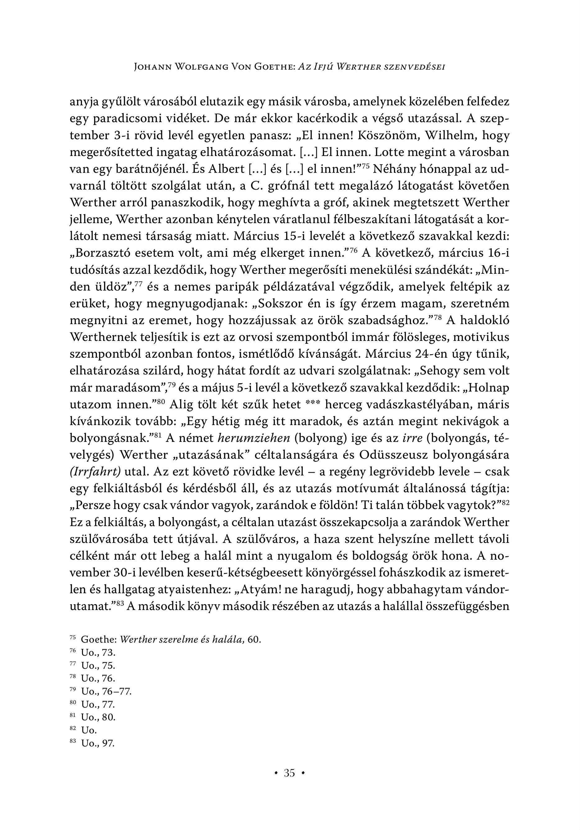 JOHANN WOLFGANG VON GOETHE: AZ IFJU WERTHER SZENVEDESEI anyja gyülölt värosäböl elutazik egy mäsik värosba, amelynek közeleben felfedez egy paradicsomi videket. De mär ekkor kacerkodik a vegsö utazässal. A szeptember 3-i rövid level egyetlen panasz: „El innen! Köszönöm, Wilhelm, hogy megerősítetted ingatag elhatározásomat. [...] El innen. Lotte megint a városban van egy barátnőjénél. És Albert [...] és [...] el innen!" Néhány hónappal az udvarnál töltött szolgálat után, a C. grófnál tett megalázó látogatást követően Werther arról panaszkodik, hogy meghívta a gróf, akinek megtetszett Werther jelleme, Werther azonban kénytelen váratlanul félbeszakítani látogatását a korlátolt nemesi társaság miatt. Március 15-i levelét a következő szavakkal kezdi: s Borzasztó esetem volt, ami még elkerget innen."" A következő, március 16-i tudósítás azzal kezdődik, hogy Werther megerősíti menekülési szándékát: , Minden üldöz"," és a nemes paripák példázatával végződik, amelyek feltépik az erüket, hogy megnyugodjanak: , Sokszor én is így érzem magam, szeretném megnyitni az eremet, hogy hozzájussak az örök szabadsághoz."" A haldokló Werthernek teljesítik is ezt az orvosi szempontból immár fölösleges, motivikus szempontból azonban fontos, ismétlődő kívánságát. Március 24-én úgy tűnik, elhatározása szilárd, hogy hátat fordít az udvari szolgálatnak: , Sehogy sem volt már maradásom"," és a május 5-i levél a következő szavakkal kezdődik: , Holnap utazom innen." Alig tölt két szűk hetet """ herceg vadäszkastelyäban, märis kívánkozik tovább: , Egy hétig még itt maradok, és aztán megint nekivágok a bolyongásnak."" A német herumziehen (bolyong) ige és az irre (bolyongás, tévelygés) Werther , utazásának" céltalanságára és Odüsszeusz bolyongására (Irrfahrt) utal. Az ezt követő rövidke levél — a regény legrövidebb levele — csak egy felkiáltásból és kérdésből áll, és az utazás motívumát általánossá tágítja: s Persze hogy csak vándor vagyok, zarándok e földön! Ti talán többek vagytok?"?? Ez a felkiáltás, a bolyongást, a céltalan utazást összekapcsolja a zarándok Werther szülővárosába tett útjával. A szülőváros, a haza szent helyszíne mellett távoli célként már ott lebeg a halál mint a nyugalom és boldogság örök hona. A november 30-i levélben keserű-kétségbeesett könyörgéssel fohászkodik az ismeretlen és hallgatag atyaistenhez: , Atyám! ne haragudj, hogy abbahagytam vándorutamat." A második könyv második részében az utazás a halállal összefüggésben 75 Goethe: Werther szerelme és halála, 60. 76 Uo., 73. 77 Uo., 75. 78 Uo., 76. 79 Uo., 76—77. 80 Uo., 77. 51 Uo., 80. 8 Uo. 83 Uo., 97.