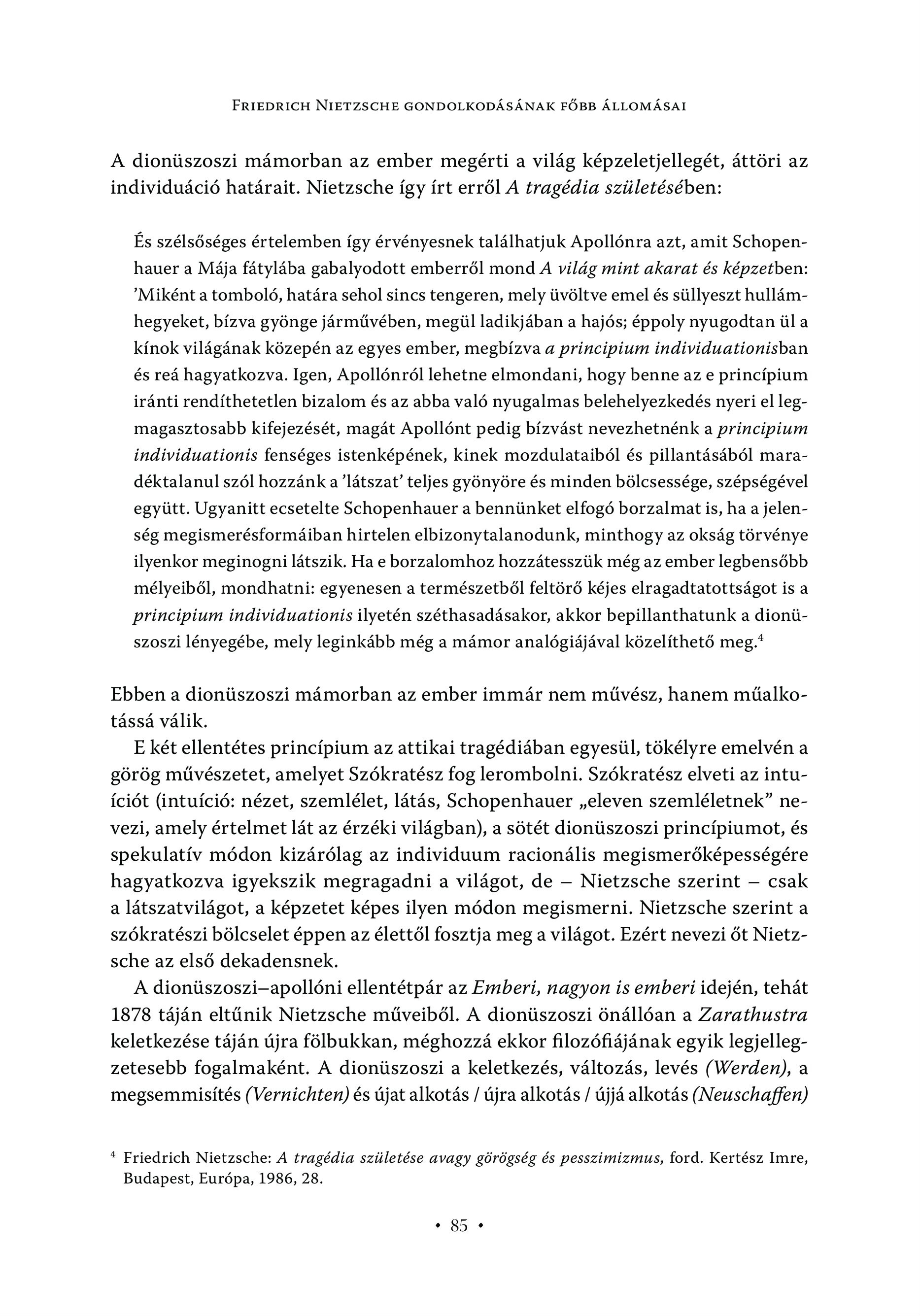 FRIEDRICH NIETZSCHE GONDOLKODÁSÁNAK FŐBB ÁLLOMÁSAI A dionüszoszi mámorban az ember megérti a világ képzeletjellegét, áttöri az individuáció határait. Nietzsche így írt erről A tragédia születésében: És szélsőséges értelemben így érvényesnek találhatjuk Apollónra azt, amit Schopenhauer a Mája fátylába gabalyodott emberről mond A világ mint akarat és képzetben: "Miként a tomboló, határa sehol sincs tengeren, mely üvöltve emel és süllyeszt hullámhegyeket, bízva gyönge járművében, megül ladikjában a hajós; éppoly nyugodtan ül a kínok világának közepén az egyes ember, megbízva a principium individuationisban és reá hagyatkozva. Igen, Apollónról lehetne elmondani, hogy benne az e princípium iránti rendíthetetlen bizalom és az abba való nyugalmas belehelyezkedés nyeri el legmagasztosabb kifejezését, magát Apollónt pedig bízvást nevezhetnénk a principium individuationis fenséges istenképének, kinek mozdulataiból és pillantásából maradéktalanul szól hozzánk a látszat" teljes gyönyöre és minden bölcsessége, szépségével együtt. Ugyanitt ecsetelte Schopenhauer a bennünket elfogó borzalmat is, ha a jelenség megismerésformáiban hirtelen elbizonytalanodunk, minthogy az okság törvénye ilyenkor meginogni látszik. Ha e borzalomhoz hozzátesszük még az ember legbensőbb mélyeiből, mondhatni: egyenesen a természetből feltörő kéjes elragadtatottságot is a principium individuationis ilyetén széthasadasakor, akkor bepillanthatunk a dionüszoszi lényegébe, mely leginkább még a mámor analógiájával közelíthető meg." Ebben a dionüszoszi mámorban az ember immár nem művész, hanem műalkotássá válik. E két ellentétes princípium az attikai tragédiában egyesül, tökélyre emelvén a görög művészetet, amelyet Szókratész fog lerombolni. Szókratész elveti az intuíciót (intuíció: nézet, szemlélet, látás, Schopenhauer , eleven szemléletnek" nevezi, amely értelmet lát az érzéki világban), a sötét dionüszoszi princípiumot, és spekulatív módon kizárólag az individuum racionális megismerőképességére hagyatkozva igyekszik megragadni a világot, de — Nietzsche szerint — csak a látszatvilágot, a képzetet képes ilyen módon megismerni. Nietzsche szerint a szókratészi bölcselet éppen az élettől fosztja meg a világot. Ezért nevezi őt Nietzsche az első dekadensnek. A dionüszoszi—apollóni ellentétpár az Emberi, nagyon is emberi idején, tehát 1878 táján eltűnik Nietzsche műveiből. A dionüszoszi önállóan a Zarathustra keletkezése táján újra fölbukkan, méghozzá ekkor filozófiájának egyik legjellegzetesebb fogalmaként. A dionüszoszi a keletkezés, változás, levés (Werden), a megsemmisítés ( Vernichten) és újat alkotás / újra alkotás / újjá alkotás (Neuschaffen) * Friedrich Nietzsche: A tragédia születése avagy görögség és pesszimizmus, ford. Kertész Imre, Budapest, Európa, 1986, 28.