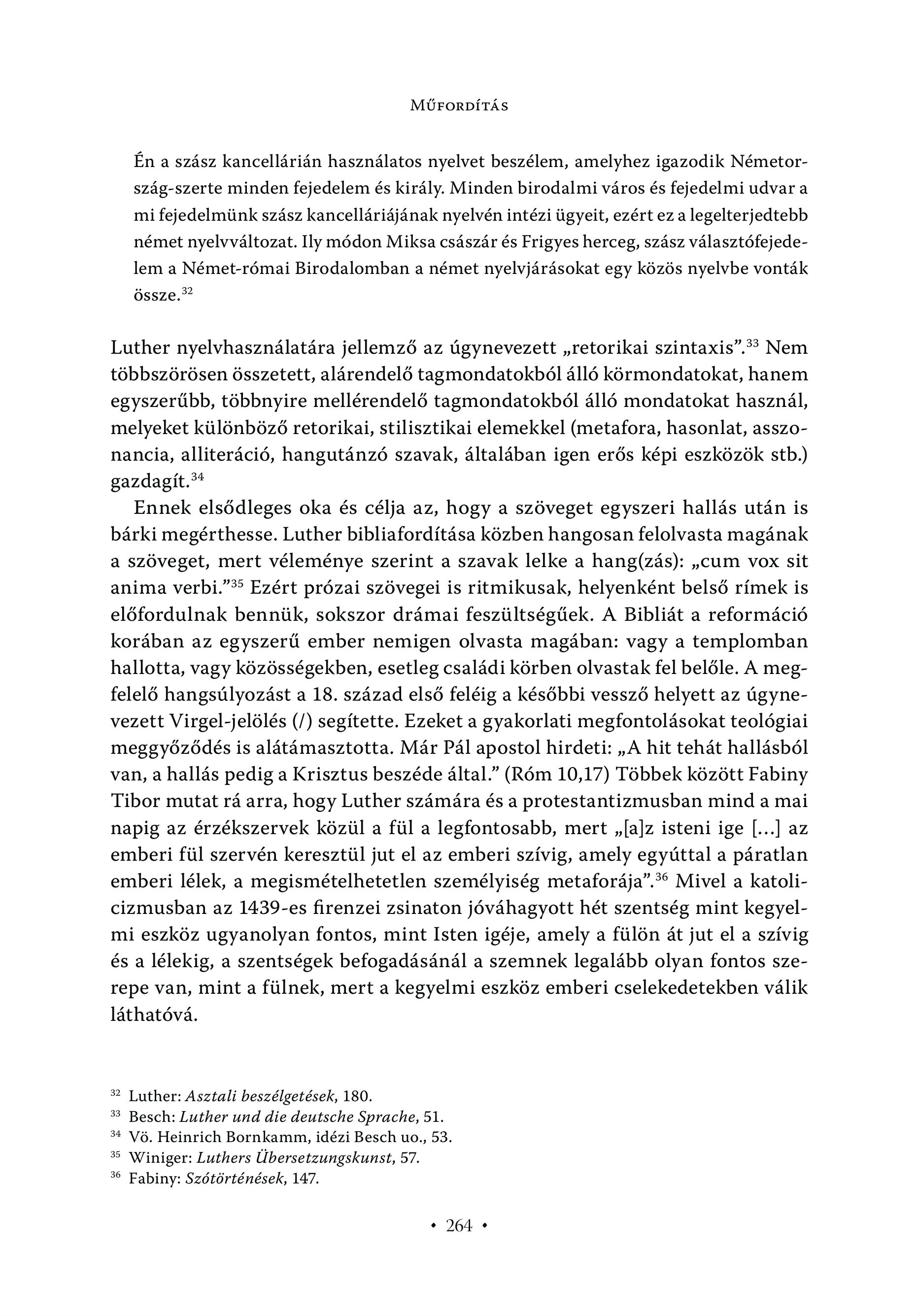 MŰEFORDÍTÁS Én a szász kancellárián használatos nyelvet beszélem, amelyhez igazodik Németország-szerte minden fejedelem és király. Minden birodalmi város és fejedelmi udvar a mi fejedelmünk szász kancelláriájának nyelvén intézi ügyeit, ezért ez a legelterjedtebb német nyelvváltozat. Ily módon Miksa császár és Frigyes herceg, szász választófejedelem a Német-római Birodalomban a német nyelvjárásokat egy közös nyelvbe vonták össze.?? Luther nyelvhasznälatära jellemző az úgynevezett , retorikai szintaxis".? Nem többszörösen összetett, alárendelő tagmondatokból álló körmondatokat, hanem egyszerűbb, többnyire mellérendelő tagmondatokból álló mondatokat használ, melyeket különböző retorikai, stilisztikai elemekkel (metafora, hasonlat, asszonancia, alliteráció, hangutánzó szavak, általában igen erős képi eszközök stb.) gazdagit.** Ennek elsődleges oka és célja az, hogy a szöveget egyszeri hallás után is bárki megérthesse. Luther bibliafordítása közben hangosan felolvasta magának a szöveget, mert véleménye szerint a szavak lelke a hang(zás): ,cum vox sit anima verbi."? Ezért prózai szövegei is ritmikusak, helyenként belső rímek is előfordulnak bennük, sokszor drámai feszültségűek. A Bibliát a reformáció korában az egyszerű ember nemigen olvasta magában: vagy a templomban hallotta, vagy közösségekben, esetleg családi körben olvastak fel belőle. A megfelelő hangsúlyozást a 18. század első feléig a későbbi vessző helyett az úgynevezett Virgel-jelölés (/) segítette. Ezeket a gyakorlati megfontolásokat teológiai meggyőződés is alátámasztotta. Már Pál apostol hirdeti: , A hit tehát hallásból van, a hallás pedig a Krisztus beszéde által." (Róm 10,17) Többek között Fabiny Tibor mutat rá arra, hogy Luther számára és a protestantizmusban mind a mai napig az érzékszervek közül a fül a legfontosabb, mert ,[alz isteni ige [...] az emberi fül szervén keresztül jut el az emberi szívig, amely egyúttal a páratlan emberi lélek, a megismételhetetlen személyiség metaforája"." Mivel a katolicizmusban az 1439-es firenzei zsinaton jóváhagyott hét szentség mint kegyelmi eszköz ugyanolyan fontos, mint Isten igéje, amely a fülön át jut el a szívig és a lélekig, a szentségek befogadásánál a szemnek legalább olyan fontos szerepe van, mint a fülnek, mert a kegyelmi eszköz emberi cselekedetekben válik láthatóvá. 32 Luther: Asztali beszélgetések, 180. 33 Besch: Luther und die deutsche Sprache, 51. 34 V6. Heinrich Bornkamm, idézi Besch uo., 53. Winiger: Luthers Ubersetzungskunst, 57. 3% Fabiny: Szôtorténések, 147. 35 + 264 +