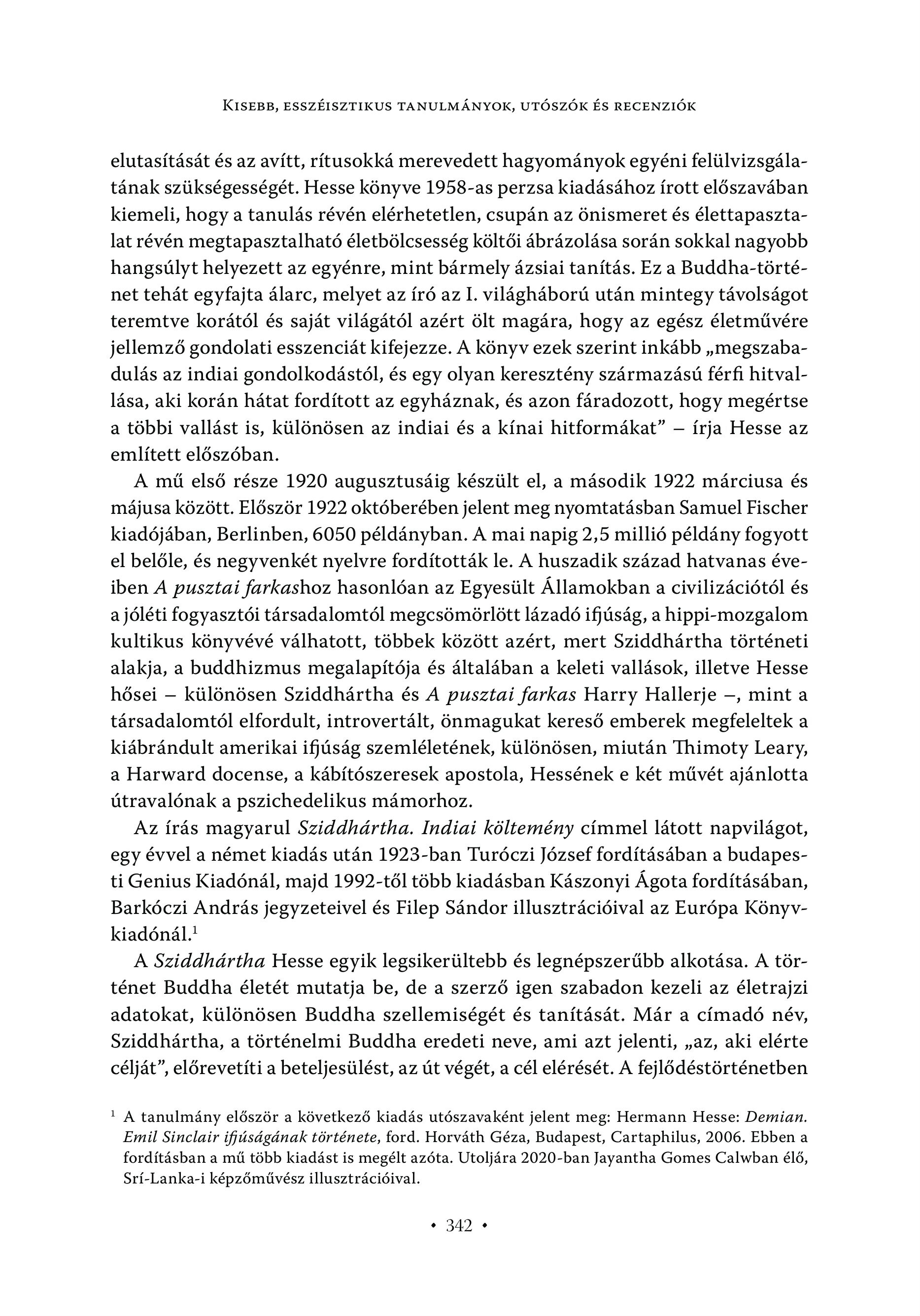 KISEBB, ESSZÉISZTIKUS TANULMÁNYOK, UTÓSZÓK ÉS RECENZIÓK elutasítását és az avítt, rítusokká merevedett hagyományok egyéni felülvizsgálatának szükségességét. Hesse könyve 1958-as perzsa kiadásához írott előszavában kiemeli, hogy a tanulás révén elérhetetlen, csupán az önismeret és élettapasztalat révén megtapasztalható életbölcsesség költői ábrázolása során sokkal nagyobb hangsúlyt helyezett az egyénre, mint bármely ázsiai tanítás. Ez a Buddha-történet tehát egyfajta álarc, melyet az író az I. világháború után mintegy távolságot teremtve korától és saját világától azért ölt magára, hogy az egész életművére jellemző gondolati esszenciát kifejezze. A könyv ezek szerint inkább , megszabadulás az indiai gondolkodástól, és egy olyan keresztény származású férfi hitvallása, aki korán hátat fordított az egyháznak, és azon fáradozott, hogy megértse a többi vallást is, különösen az indiai és a kínai hitformákat" — írja Hesse az említett előszóban. A mű első része 1920 augusztusáig készült el, a második 1922 márciusa és májusa között. Először 1922 októberében jelent meg nyomtatásban Samuel Fischer kiadójában, Berlinben, 6050 példányban. A mai napig 2,5 millió példány fogyott el belőle, és negyvenkét nyelvre fordították le. A huszadik század hatvanas éveiben A pusztai farkashoz hasonlóan az Egyesült Államokban a civilizációtól és a jóléti fogyasztói társadalomtól megcsömörlött lázadó ifjúság, a hippi-mozgalom kultikus könyvévé válhatott, többek között azért, mert Sziddhártha történeti alakja, a buddhizmus megalapítója és általában a keleti vallások, illetve Hesse hősei — különösen Sziddhártha és A pusztai farkas Harry Hallerje —, mint a társadalomtól elfordult, introvertált, önmagukat kereső emberek megfeleltek a kiábrándult amerikai ifjúság szemléletének, különösen, miután Ihimoty Leary, a Harward docense, a kábítószeresek apostola, Hessének e két művét ajánlotta útravalónak a pszichedelikus mámorhoz. Az írás magyarul Sziddhártha. Indiai költemény címmel látott napvilágot, egy évvel a német kiadás után 1923-ban Turóczi József fordításában a budapesti Genius Kiadónál, majd 1992-től több kiadásban Kászonyi Ágota fordításában, Barkóczi András jegyzeteivel és Filep Sándor illusztrációival az Európa Könyvkiadónál." A Sziddhártha Hesse egyik legsikerültebb és legnépszerűbb alkotása. A történet Buddha életét mutatja be, de a szerző igen szabadon kezeli az életrajzi adatokat, különösen Buddha szellemiségét és tanítását. Már a címadó név, Sziddhártha, a történelmi Buddha eredeti neve, ami azt jelenti, , az, aki elérte célját", előrevetíti a beteljesülést, az út végét, a cél elérését. A fejlődéstörténetben ! A tanulmány először a következő kiadás utószavaként jelent meg: Hermann Hesse: Demian. Emil Sinclair ifjúságának története, ford. Horváth Géza, Budapest, Cartaphilus, 2006. Ebben a fordításban a mű több kiadást is megélt azóta. Utoljára 2020-ban Jayantha Gomes Calwban élő, Srí-Lanka-i képzőművész illusztrációival. + 342 +