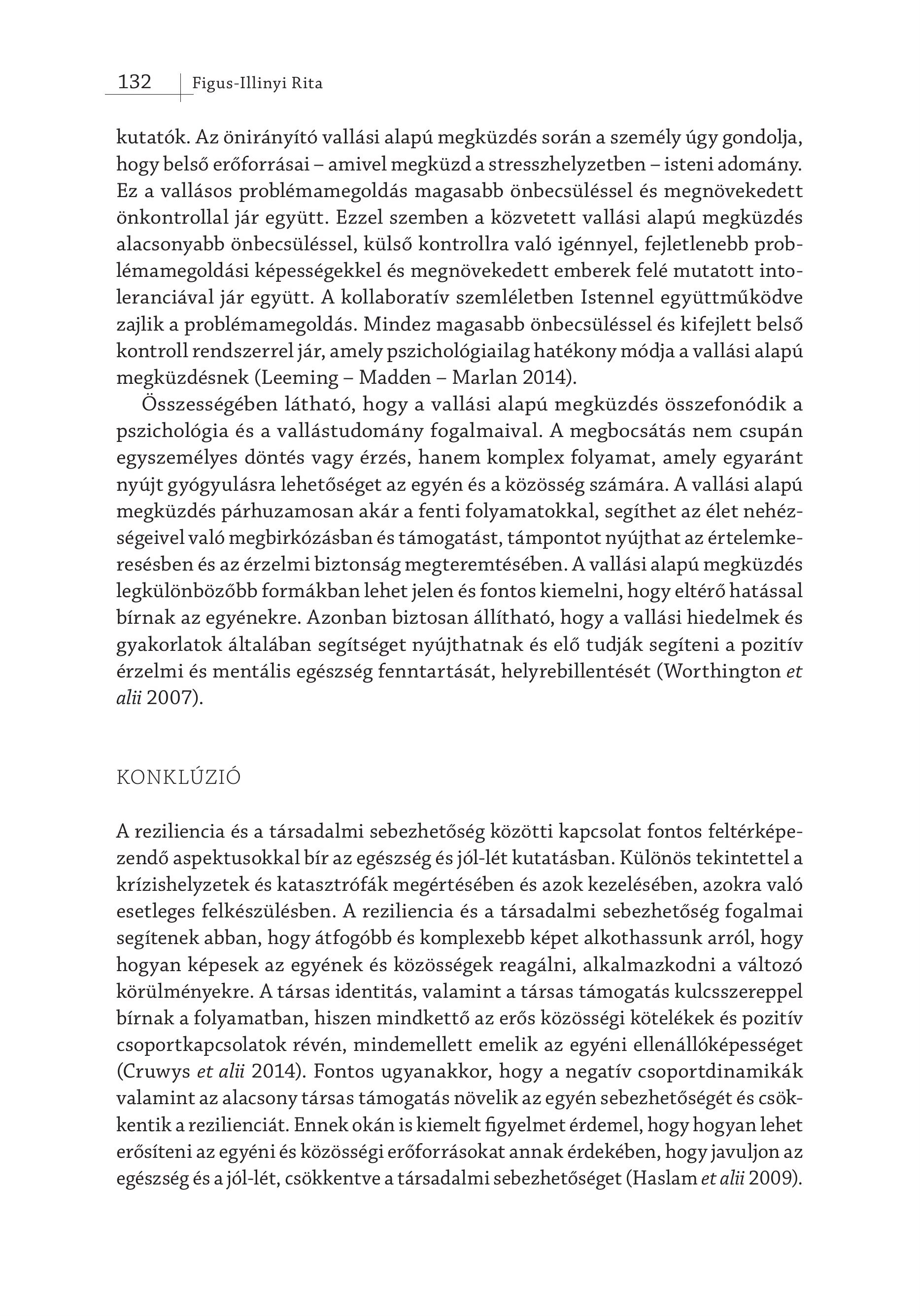 132 Figus-Illinyi Rita kutatók. Az önirányító vallási alapú megküzdés során a személy úgy gondolja, hogy belső erőforrásai - amivel megküzd a stresszhelyzetben — isteni adomány. Ez a vallásos problémamegoldás magasabb önbecsüléssel és megnövekedett önkontrollal jár együtt. Ezzel szemben a közvetett vallási alapú megküzdés alacsonyabb önbecsüléssel, külső kontrollra való igénnyel, fejletlenebb problémamegoldási képességekkel és megnövekedett emberek felé mutatott intoleranciával jár együtt. A kollaboratív szemléletben Istennel együttműködve zajlik a problémamegoldás. Mindez magasabb önbecsüléssel és kifejlett belső kontroll rendszerrel jár, amely pszichológiailag hatékony módja a vallási alapú megküzdesnek (Leeming - Madden - Marlan 2014). Összességében látható, hogy a vallási alapú megküzdés összefonódik a pszichológia és a vallástudomány fogalmaival. A megbocsátás nem csupán egyszemélyes döntés vagy érzés, hanem komplex folyamat, amely egyaránt nyújt gyógyulásra lehetőséget az egyén és a közösség számára. A vallási alapú megküzdés párhuzamosan akár a fenti folyamatokkal, segíthet az élet nehézségeivel való megbirkózásban és támogatást, támpontot nyújthat az értelemkeresésben és az érzelmi biztonság megteremtésében. A vallási alapú megküzdés legkülönbözőbb formákban lehet jelen és fontos kiemelni, hogy eltérő hatással bírnak az egyénekre. Azonban biztosan állítható, hogy a vallási hiedelmek és gyakorlatok általában segítséget nyújthatnak és elő tudják segíteni a pozitív érzelmi és mentális egészség fenntartását, helyrebillentését (Worthington et alii 2007). KONKLUZIO A reziliencia és a társadalmi sebezhetőség közötti kapcsolat fontos feltérképezendő aspektusokkal bír az egészség és jól-lét kutatásban. Különös tekintettel a krízishelyzetek és katasztrófák megértésében és azok kezelésében, azokra való esetleges felkészülésben. A reziliencia és a társadalmi sebezhetőség fogalmai segítenek abban, hogy átfogóbb és komplexebb képet alkothassunk arról, hogy hogyan képesek az egyének és közösségek reagálni, alkalmazkodni a változó körülményekre. A társas identitás, valamint a társas támogatás kulcsszereppel bírnak a folyamatban, hiszen mindkettő az erős közösségi kötelékek és pozitív csoportkapcsolatok révén, mindemellett emelik az egyéni ellenállóképességet (Cruwys et alii 2014). Fontos ugyanakkor, hogy a negatív csoportdinamikák valamint az alacsony társas támogatás növelik az egyén sebezhetőségét és csökkentik a rezilienciat. Ennek okan is kiemelt figyelmet érdemel, hogy hogyan lehet erősíteni az egyéni és közösségi erőforrásokat annak érdekében, hogy javuljon az egészség és a jól-lét, csökkentve a társadalmi sebezhetőséget (Haslam et alii 2009).
