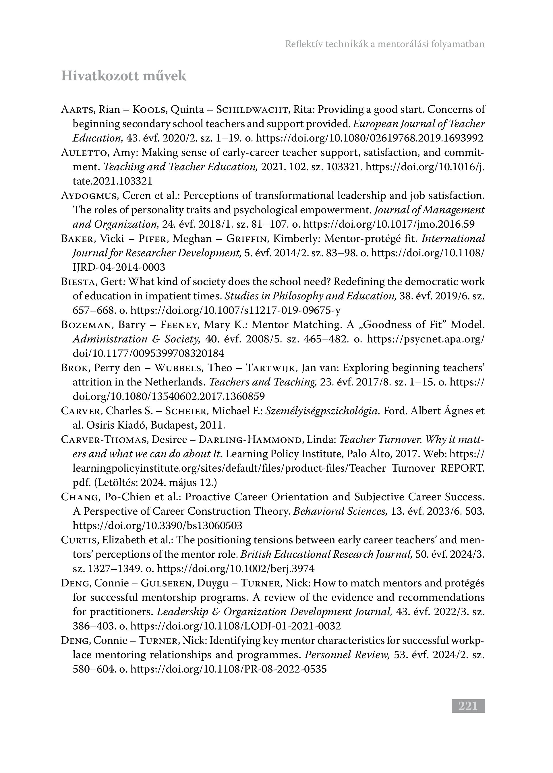 AARTS, Rian — KooLs, Ouinta — SCHILDWACHT, Rita: Providing a good start. Concerns of beginning secondary school teachers and support provided. European Journal of Teacher Education, 43. évf. 2020/2. sz. 1-19. o. https://doi.org/10.1080/02619768.2019.1693992 AULETTO, Amy: Making sense of early-career teacher support, satisfaction, and commitment. Teaching and Teacher Education, 2021. 102. sz. 103321. https://doi.org/10.1016/j. tate.2021.103321 AYDOGMUS, Ceren et al.: Perceptions of transformational leadership and job satisfaction. The roles of personality traits and psychological empowerment. Journal of Management and Organization, 24. évf. 2018/1. sz. 81-107. o. https://doi.org/10.1017/jmo.2016.59 BAKER, Vicki — PIFER, Meghan — GRIFFIN, Kimberly: Mentor-protégé fit. International Journal for Researcher Development, 5. évf. 2014/2. sz. 83-98. o. https://doi.org/10.1108/ IJRD-04-2014-0003 BIESTA, Gert: What kind of society does the school need? Redefining the democratic work of education in impatient times. Studies in Philosophy and Education, 38. évf. 2019/6. sz. 657-668. o. https://doi.org/10.1007/s11217-019-09675-y BOZEMAN, Barry — FEENEY, Mary K.: Mentor Matching. A ,,Goodness of Fit” Model. Administration & Society, 40. évf. 2008/5. sz. 465-482. o. https://psycnet.apa.org/ doi/10.1177/0095399708320184 BRoK, Perry den - WUBBELS, Theo — TARTWIJK, Jan van: Exploring beginning teachers’ attrition in the Netherlands. Teachers and Teaching, 23. évf. 2017/8. sz. 1-15. o. https:// doi.org/10.1080/13540602.2017.1360859 Carver, Charles S. — SCHEIER, Michael F.: Személyiségpszicholdgia. Ford. Albert Agnes et al. Osiris Kiadó, Budapest, 2011. CARVER-THOMAS, Desiree — DARLING-HAMMOND, Linda: Teacher Turnover. Why it matters and what we can do about It. Learning Policy Institute, Palo Alto, 2017. Web: https:// learningpolicyinstitute.org/sites/default/files/product-files/Teacher_Turnover_REPORT. pdf. (Letöltés: 2024. május 12.) CHANG, Po-Chien et al.: Proactive Career Orientation and Subjective Career Success. A Perspective of Career Construction Theory. Behavioral Sciences, 13. évf. 2023/6. 503. https://doi.org/10.3390/bs13060503 CURTIS, Elizabeth et al.: The positioning tensions between early career teachers" and mentors’ perceptions of the mentor role. British Educational Research Journal, 50. évf. 2024/3. sz. 1327-1349. o. https://doi.org/10.1002/berj.3974 DENG, Connie — GULSEREN, Duygu — TURNER, Nick: How to match mentors and protégés for successful mentorship programs. A review of the evidence and recommendations for practitioners. Leadership & Organization Development Journal, 43. évf. 2022/3. sz. 386-403. o. https://doi.org/10.1108/LODJ-01-2021-0032 DENG, Connie — TURNER, Nick: Identifying key mentor characteristics for successful workplace mentoring relationships and programmes. Personnel Review, 53. évf. 2024/2. sz. 580-604. o. https://doi.org/10.1108/PR-08-2022-0535