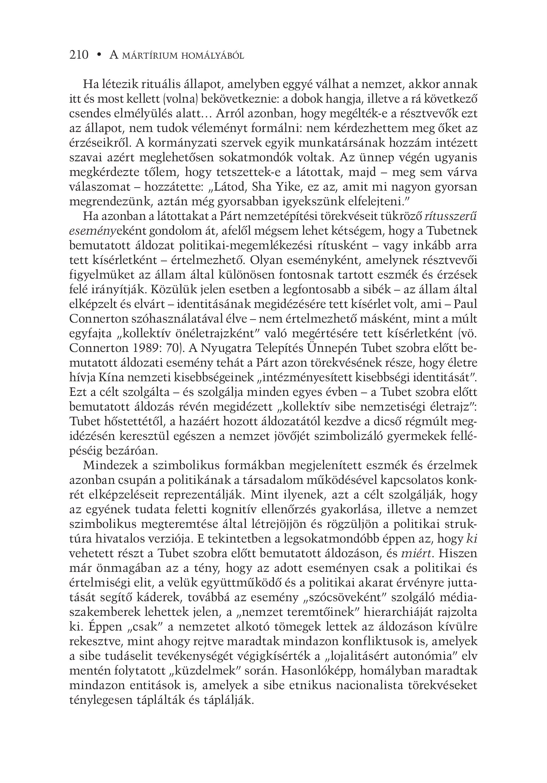 210 " A MÁRTÍRIUM HOMÁLYÁBÓL Ha létezik rituális állapot, amelyben eggyé válhat a nemzet, akkor annak itt és most kellett (volna) bekövetkeznie: a dobok hangja, illetve a rá következő csendes elmélyülés alatt... Arról azonban, hogy megélték-e a résztvevők ezt az állapot, nem tudok véleményt formálni: nem kérdezhettem meg őket az érzéseikről. A kormányzati szervek egyik munkatársának hozzám intézett szavai azért meglehetősen sokatmondók voltak. Az ünnep végén ugyanis megkérdezte tőlem, hogy tetszettek-e a látottak, majd — meg sem várva válaszomat — hozzátette: , Látod, Sha Yike, ez az, amit mi nagyon gyorsan megrendezünk, aztán még gyorsabban igyekszünk elfelejteni." Ha azonban a látottakat a Párt nemzetépítési törekvéseit tükröző rítusszerű eseményeként gondolom át, afelől mégsem lehet kétségem, hogy a Tubetnek bemutatott áldozat politikai-megemlékezési rítusként — vagy inkább arra tett kísérletként — értelmezhető. Olyan eseményként, amelynek résztvevői figyelmüket az állam által különösen fontosnak tartott eszmék és érzések felé irányítják. Közülük jelen esetben a legfontosabb a sibék — az állam által elképzelt és elvárt — identitásának megidézésére tett kísérlet volt, ami — Paul Connerton szóhasználatával élve — nem értelmezhető másként, mint a múlt egyfajta , kollektív önéletrajzként" való megértésére tett kísérletként (vö. Connerton 1989: 70). A Nyugatra Telepítés Ünnepén Tubet szobra előtt bemutatott áldozati esemény tehát a Párt azon törekvésének része, hogy életre hívja Kína nemzeti kisebbségeinek , intézményesített kisebbségi identitását". Ezt a célt szolgálta — és szolgálja minden egyes évben — a Tubet szobra előtt bemutatott áldozás révén megidézett , kollektív sibe nemzetiségi életrajz": Tubet hőstettétől, a hazáért hozott áldozatától kezdve a dicső régmúlt megidézésén keresztül egészen a nemzet jövőjét szimbolizáló gyermekek fellépéséig bezáróan. Mindezek a szimbolikus formákban megjelenített eszmék és érzelmek azonban csupán a politikának a társadalom működésével kapcsolatos konkrét elképzeléseit reprezentálják. Mint ilyenek, azt a célt szolgálják, hogy az egyének tudata feletti kognitív ellenőrzés gyakorlása, illetve a nemzet szimbolikus megteremtése által létrejöjjön és rögzüljön a politikai struktúra hivatalos verziója. E tekintetben a leggyokatmondóbb éppen az, hogy ki vehetett részt a Tubet szobra előtt bemutatott áldozáson, és miért. Hiszen már önmagában az a tény, hogy az adott eseményen csak a politikai és értelmiségi elit, a velük együttműködő és a politikai akarat érvényre juttatását segítő káderek, továbbá az esemény , szócsöveként" szolgáló médiaszakemberek lehettek jelen, a , nemzet teremtőinek" hierarchiáját rajzolta ki. Éppen ,csak" a nemzetet alkotó tömegek lettek az áldozáson kívülre rekesztve, mint ahogy rejtve maradtak mindazon konfliktusok is, amelyek a sibe tudáselit tevékenységét végigkísérték a , lojalitásért autonómia" elv mentén folytatott , küzdelmek" során. Hasonlóképp, homályban maradtak mindazon entitások is, amelyek a sibe etnikus nacionalista törekvéseket ténylegesen táplálták és táplálják.