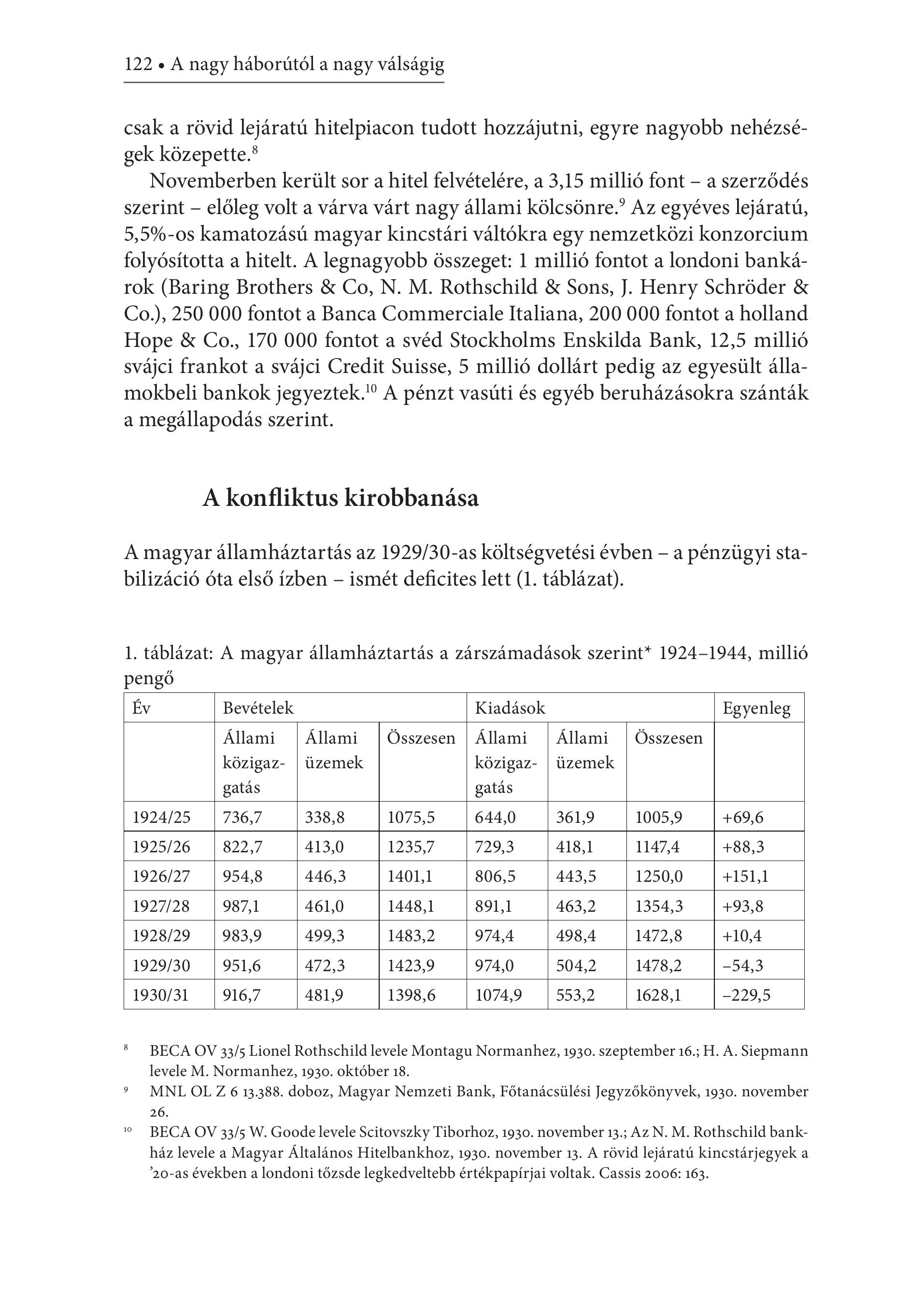122 e A nagy háborútól a nagy válságig csak a rövid lejáratú hitelpiacon tudott hozzájutni, egyre nagyobb nehézségek közepette.° Novemberben került sor a hitel felvételére, a 3,15 millió font — a szerződés szerint - előleg volt a várva várt nagy állami kölcsönre.? Az egyéves lejáratú, 5,599-os kamatozású magyar kincstári váltókra egy nemzetközi konzorcium folyósította a hitelt. A legnagyobb összeget: 1 millió fontot a londoni bankárok (Baring Brothers g Co, N. M. Rothschild g Sons, J. Henry Schröder g Co.), 250 000 fontot a Banca Commerciale Italiana, 200 000 fontot a holland Hope g Co., 170 000 fontot a svéd Stockholms Enskilda Bank, 12,5 millió svájci frankot a svájci Credit Suisse, 5 millió dollárt pedig az egyesült államokbeli bankok jegyeztek." A pénzt vasúti és egyéb beruházásokra szánták a megállapodás szerint. A konfliktus kirobbanása A magyar államháztartás az 1929/30-as költségvetési évben - a pénzügyi stabilizáció óta első ízben - ismét deficites lett (1. táblázat). 1. táblázat: A magyar államháztartás a zárszámadások szerint" 1924-1944, millió pengő Év Bevételek Kiadások Egyenleg Állami | Allami | Osszesen | Allami | Allami | Osszesen közigaz- | üzemek közigaz- | üzemek gatäs gatás 1924/25 736,7 338,8 1075,5 644,0 361,9 1005,9 +69,6 1925/26 822,7 413,0 1235,7 729,3 418,1 1147,4 +88,3 1926/27 954,8 446,3 1401,1 806,5 443,5 1250,0 +151,1 1927/28 987,1 461,0 1448,1 891,1 463,2 1354,3 +93,8 1928/29 983,9 499,3 1483,2 974,4 498,4 1472,8 +10,4 1929/30 951,6 472,3 1423,9 974,0 504,2 1478,2 -54,3 1930/31 916,7 481,9 1398,6 1074,9 553,2 1628,1 -229,5 BECA OV 33/5 Lionel Rothschild levele Montagu Normanhez, 1930. szeptember 16.; H. A. Siepmann levele M. Normanhez, 1930. oktöber 18. ° MNLOLZ 6 13.388. doboz, Magyar Nemzeti Bank, Főtanácsülési Jegyzőkönyvek, 1930. november 26. © BECA OV 33/5 W. Goode levele Scitovszky Tiborhoz, 1930. november 13.; Az N. M. Rothschild bankház levele a Magyar Általános Hitelbankhoz, 1930. november 13. A rövid lejáratú kincstárjegyek a "20-as években a londoni tőzsde legkedveltebb értékpapírjai voltak. Cassis 2006: 163.