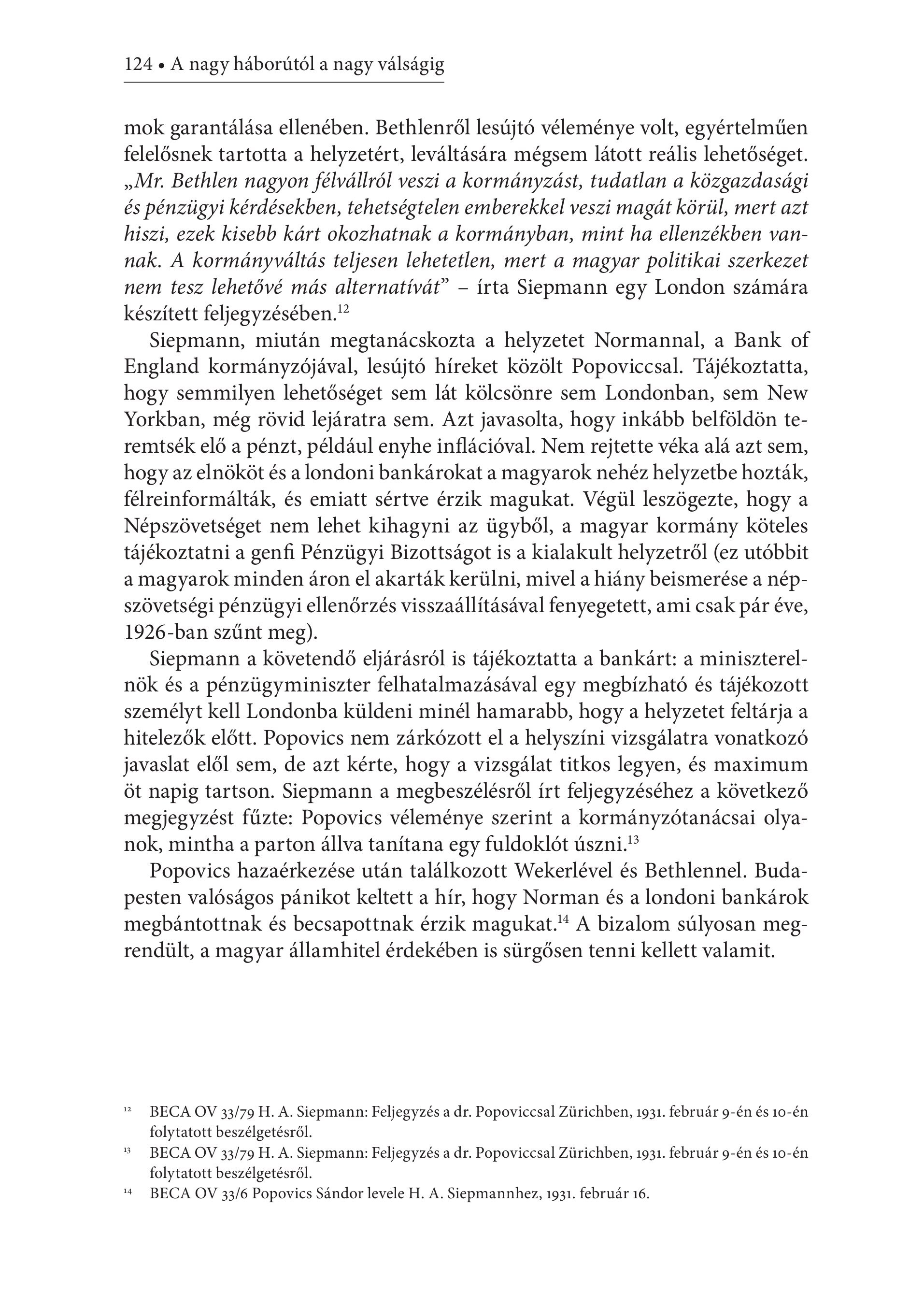124 e A nagy háborútól a nagy válságig mok garantálása ellenében. Bethlenről lesújtó véleménye volt, egyértelműen felelősnek tartotta a helyzetért, leváltására mégsem látott reális lehetőséget. , Mr. Bethlen nagyon félvállról veszi a kormányzást, tudatlan a közgazdasági és pénzügyi kérdésekben, tehetségtelen emberekkel veszi magát körül, mert azt hiszi, ezek kisebb kárt okozhatnak a kormányban, mint ha ellenzékben vannak. A kormányváltás teljesen lehetetlen, mert a magyar politikai szerkezet nem tesz lehetővé más alternatívát" — irta Siepmann egy London szamara készített feljegyzésében." Siepmann, miután megtanácskozta a helyzetet Normannal, a Bank of England kormányzójával, lesújtó híreket közölt Popoviccsal. Tájékoztatta, hogy semmilyen lehetőséget sem lát kölcsönre sem Londonban, sem New Yorkban, még rövid lejáratra sem. Azt javasolta, hogy inkább belföldön teremtsék elő a pénzt, például enyhe inflációval. Nem rejtette véka alá azt sem, hogy az elnököt és a londoni bankárokat a magyarok nehéz helyzetbe hozták, félreinformálták, és emiatt sértve érzik magukat. Végül leszögezte, hogy a Népszövetséget nem lehet kihagyni az ügyből, a magyar kormány köteles tájékoztatni a genfi Pénzügyi Bizottságot is a kialakult helyzetről (ez utóbbit a magyarok minden áron el akarták kerülni, mivel a hiány beismerése a népszövetségi pénzügyi ellenőrzés visszaállításával fenyegetett, ami csak pár éve, 1926-ban szűnt meg). Siepmann a követendő eljárásról is tájékoztatta a bankárt: a miniszterelnök és a pénzügyminiszter felhatalmazásával egy megbízható és tájékozott személyt kell Londonba küldeni minél hamarabb, hogy a helyzetet feltárja a hitelezők előtt. Popovics nem zárkózott el a helyszíni vizsgálatra vonatkozó javaslat elől sem, de azt kérte, hogy a vizsgálat titkos legyen, és maximum öt napig tartson. Siepmann a megbeszélésről írt feljegyzéséhez a következő megjegyzést fűzte: Popovics véleménye szerint a kormányzótanácsai olyanok, mintha a parton állva tanítana egy fuldoklót úszni." Popovics hazaérkezése után találkozott Wekerlével és Bethlennel. Budapesten valóságos pánikot keltett a hír, hogy Norman és a londoni bankárok megbántottnak és becsapottnak érzik magukat." A bizalom súlyosan megrendült, a magyar államhitel érdekében is sürgősen tenni kellett valamit. 2 BECA OV 33/79 H. A. Siepmann: Feljegyzés a dr. Popoviccsal Zürichben, 1931. február 9-én és 10-én folytatott beszélgetésről. 5 BECA OV 33/79 H. A. Siepmann: Feljegyzés a dr. Popoviccsal Zürichben, 1931. februar 9-én és 10-én folytatott beszélgetésről. 4 BECA OV 33/6 Popovics Sandor levele H. A. Siepmannhez, 1931. februar 16.