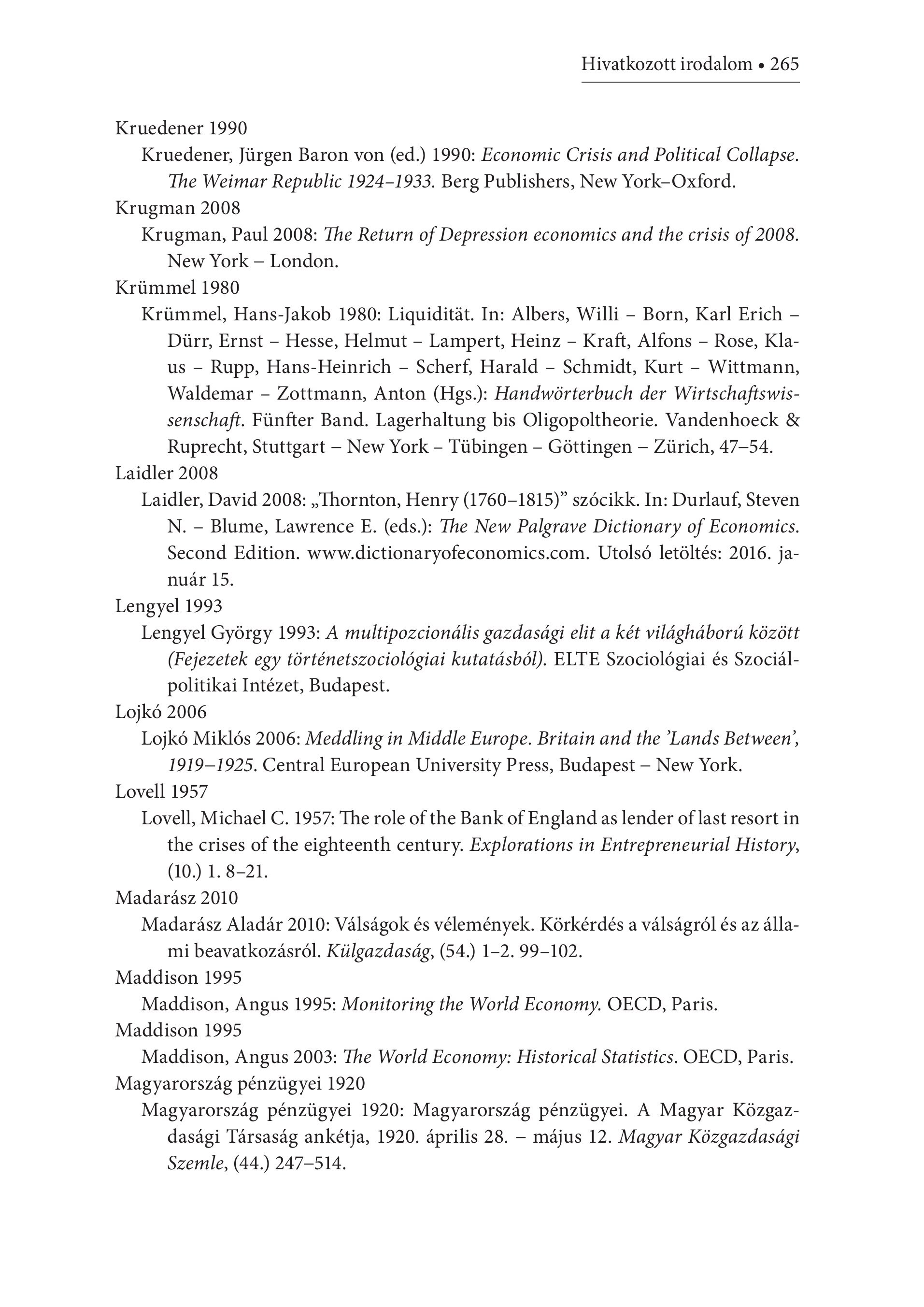 Hivatkozott irodalom e 265 Kruedener 1990 Kruedener, Jürgen Baron von (ed.) 1990: Economic Crisis and Political Collapse. The Weimar Republic 1924-1933. Berg Publishers, New York-Oxford. Krugman 2008 Krugman, Paul 2008: The Return of Depression economics and the crisis of 2008. New York - London. Krümmel 1980 Krümmel, Hans-Jakob 1980: Liquidität. In: Albers, Willi - Born, Karl Erich Dürr, Ernst - Hesse, Helmut - Lampert, Heinz - Kraft, Alfons - Rose, Klaus - Rupp, Hans-Heinrich - Scherf, Harald - Schmidt, Kurt - Wittmann, Waldemar - Zottmann, Anton (Hgs.): Handwörterbuch der Wirtschaftswissenschaft. Fünfter Band. Lagerhaltung bis Oligopoltheorie. Vandenhoeck & Ruprecht, Stuttgart - New York - Tübingen - Göttingen — Zürich, 47-54. Laidler 2008 Laidler, David 2008: „Ihornton, Henry (1760-1815)” szöcikk. In: Durlauf, Steven N. - Blume, Lawrence E. (eds.): The New Palgrave Dictionary of Economics. Second Edition. www.dictionaryofeconomics.com. Utolsö letöltes: 2016. január 15. Lengyel 1993 Lengyel György 1993: A multipozcionális gazdasági elit a két világháború között (Fejezetek egy történetszociológiai kutatásból). ELTE Szociológiai és Szociálpolitikai Intézet, Budapest. Lojkó 2006 Lojkó Miklós 2006: Meddling in Middle Europe. Britain and the Lands Between, 1919-1925. Central European University Press, Budapest — New York. Lovell 1957 Lovell, Michael C. 1957: The role of the Bank of England as lender of last resort in the crises of the eighteenth century. Explorations in Entrepreneurial History, (10.) 1. 8-21. Madarasz 2010 Madarász Aladár 2010: Válságok és vélemények. Körkérdés a válságról és az állami beavatkozásról. Külgazdaság, (54.) 1-2. 99-102. Maddison 1995 Maddison, Angus 1995: Monitoring the World Economy. OECD, Paris. Maddison 1995 Maddison, Angus 2003: The World Economy: Historical Statistics. OECD, Paris. Magyarország pénzügyei 1920 Magyarország pénzügyei 1920: Magyarország pénzügyei. A Magyar Közgazdasági Társaság ankétja, 1920. április 28. — május 12. Magyar Közgazdasági Szemle, (44.) 247—514.