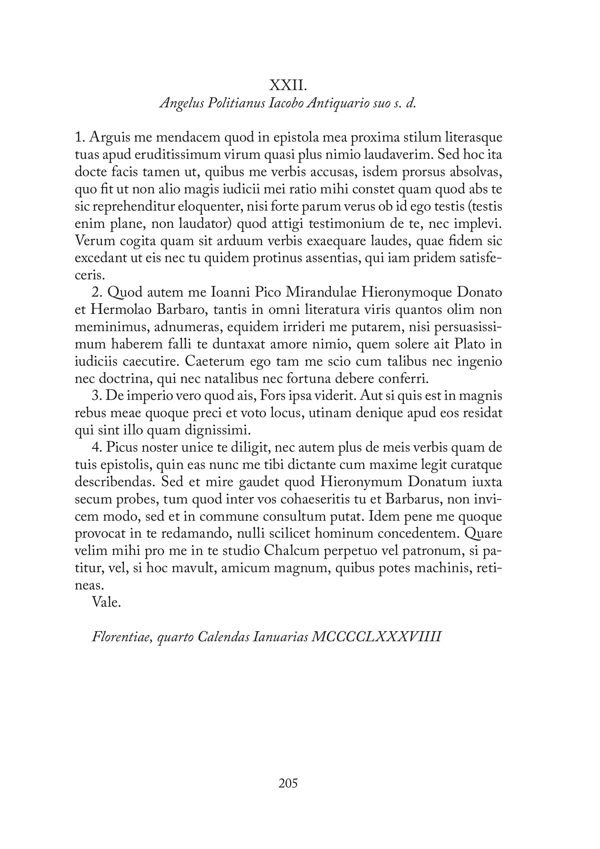 XXII. Angelus Politianus Iacobo Antiquario suo s. d. 1. Arguis me mendacem quod in epistola mea proxima stilum literasque tuas apud eruditissimum virum quasi plus nimio laudaverim. Sed hoc ita docte facis tamen ut, quibus me verbis accusas, isdem prorsus absolvas, quo fit ut non alio magis iudicii mei ratio mihi constet quam quod abs te sic reprehenditur eloquenter, nisi forte parum verus ob id ego testis (testis enim plane, non laudator) quod attigi testimonium de te, nec implevi. Verum cogita quam sit arduum verbis exaequare laudes, quae fidem sic excedant ut eis nec tu quidem protinus assentias, qui iam pridem satisfeceris. 2. Quod autem me Ioanni Pico Mirandulae Hieronymoque Donato et Hermolao Barbaro, tantis in omni literatura viris quantos olim non meminimus, adnumeras, equidem irrideri me putarem, nisi persuasissimum haberem falli te duntaxat amore nimio, quem solere ait Plato in iudiciis caecutire. Caeterum ego tam me scio cum talibus nec ingenio nec doctrina, qui nec natalibus nec fortuna debere conferri. 3. De imperio vero quod ais, Fors ipsa viderit. Aut si quis est in magnis rebus meae quoque preci et voto locus, utinam denique apud eos residat qui sint illo quam dignissimi. 4. Picus noster unice te diligit, nec autem plus de meis verbis quam de tuis epistolis, quin eas nunc me tibi dictante cum maxime legit curatque describendas. Sed et mire gaudet quod Hieronymum Donatum iuxta secum probes, tum quod inter vos cohaeseritis tu et Barbarus, non invicem modo, sed et in commune consultum putat. Idem pene me quoque provocat in te redamando, nulli scilicet hominum concedentem. Quare velim mihi pro me in te studio Chalcum perpetuo vel patronum, si patitur, vel, si hoc mavult, amicum magnum, quibus potes machinis, retineas. Vale. Florentiae, quarto Calendas Ianuarias MCCCCLXXXVIII 205