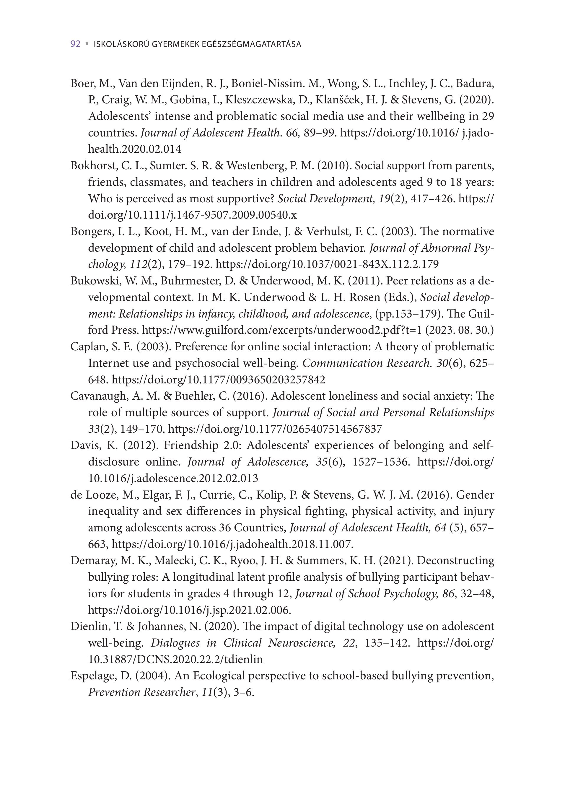 92 = ISKOLÁSKORÚ GYERMEKEK EGÉSZSÉGMAGATARTÁSA Boer, M., Van den Eijnden, R. J., Boniel-Nissim. M., Wong, S. L., Inchley, J. C., Badura, P, Craig, W. M., Gobina, I., Kleszczewska, D., Klans¢ek, H. J. & Stevens, G. (2020). Adolescents’ intense and problematic social media use and their wellbeing in 29 countries. Journal of Adolescent Health. 66, 89-99. https://doi.org/10.1016/ j.jadohealth.2020.02.014 Bokhorst, C. L., Sumter. S. R. & Westenberg, P. M. (2010). Social support from parents, friends, classmates, and teachers in children and adolescents aged 9 to 18 years: Who is perceived as most supportive? Social Development, 19(2), 417-426. https:// doi.org/10.1111/j.1467-9507.2009.00540.x Bongers, I. L., Koot, H. M. van der Ende, J. & Verhulst, E C. (2003). The normative development of child and adolescent problem behavior. Journal of Abnormal Psychology, 112(2), 179-192. https://doi.org/10.1037/0021-843X.112.2.179 Bukowski, W. M., Buhrmester, D. & Underwood, M. K. (2011). Peer relations as a developmental context. In M. K. Underwood & L. H. Rosen (Eds.), Social development: Relationships in infancy, childhood, and adolescence, (pp.153-179). The Guilford Press. https://www.guilford.com/excerpts/underwood2.pdf?t=1 (2023. 08. 30.) Caplan, S. E. (2003). Preference for online social interaction: A theory of problematic Internet use and psychosocial well-being. Communication Research. 30(6), 625648. https://doi.org/10.1177/0093650203257842 Cavanaugh, A. M. & Buehler, C. (2016). Adolescent loneliness and social anxiety: The role of multiple sources of support. Journal of Social and Personal Relationships 33(2), 149-170. https://doi.org/10.1177/02654075 14567837 Davis, K. (2012). Friendship 2.0: Adolescents’ experiences of belonging and selfdisclosure online. Journal of Adolescence, 35(6), 1527-1536. https://doi.org/ 10.1016/j.adolescence.2012.02.013 de Looze, M., Elgar, F. J., Currie, C., Kolip, P. & Stevens, G. W. J. M. (2016). Gender inequality and sex differences in physical fighting, physical activity, and injury among adolescents across 36 Countries, Journal of Adolescent Health, 64 (5), 657663, https://doi.org/10.1016/j.jadohealth.2018.11.007. Demaray, M. K., Malecki, C. K., Ryoo, J. H. & Summers, K. H. (2021). Deconstructing bullying roles: A longitudinal latent profile analysis of bullying participant behaviors for students in grades 4 through 12, Journal of School Psychology, 86, 32-48, https://doi.org/10.1016/j.jsp.2021.02.006. Dienlin, T. & Johannes, N. (2020). The impact of digital technology use on adolescent well-being. Dialogues in Clinical Neuroscience, 22, 135-142. https://doi.org/ 10.31887/DCNS.2020.22.2/tdienlin Espelage, D. (2004). An Ecological perspective to school-based bullying prevention, Prevention Researcher, 11(3), 3-6.