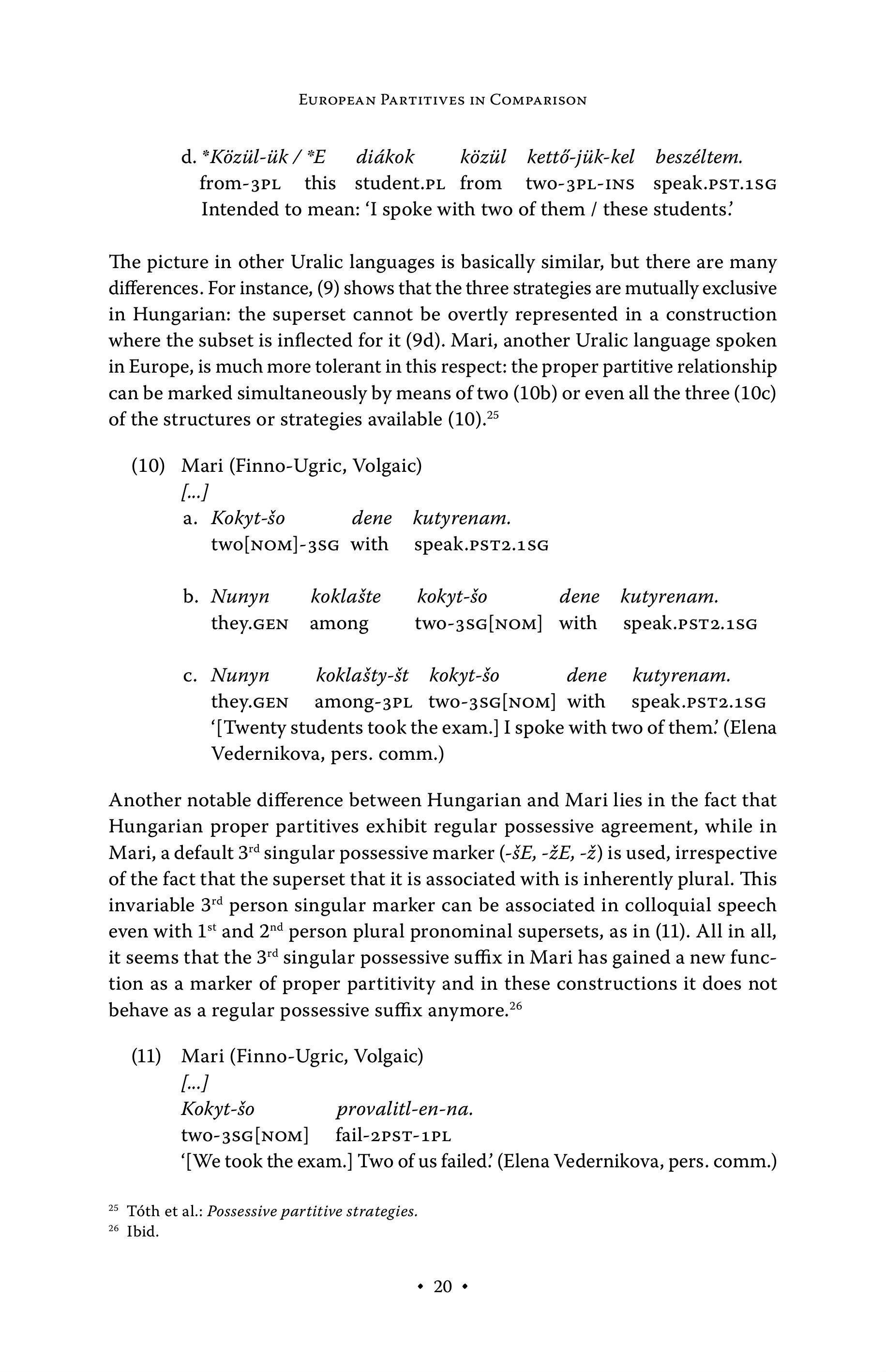 EUROPEAN PARTITIVES IN COMPARISON d.*Közül-ük/*E — diákok közül kettő-jük-kel beszéltem. from-3PL this student.pL Írom two-3PL-INS speak.PST.1SG Intended to mean: ‘I spoke with two of them / these students? The picture in other Uralic languages is basically similar, but there are many differences. For instance, (9) shows that the three strategies are mutually exclusive in Hungarian: the superset cannot be overtly represented in a construction where the subset is inflected for it (9d). Mari, another Uralic language spoken in Europe, is much more tolerant in this respect: the proper partitive relationship can be marked simultaneously by means of two (10b) or even all the three (10c) of the structures or strategies available (10). (10) Mari (Finno-Ugric, Volgaic) [..] a. Kokyt-so dene kutyrenam. two[noM]-3sG with speak.psT2.1sG b. Nunyn koklaste kokyt-$o dene kutyrenam. they.GEN among two-3SG[NOM] with speak.psT2.1sG c. Nunyn koklasty-st kokyt-so dene kutyrenam. they.GEN among-3PL two-3SG[NOM] with speak.PST2.15G ‘[Twenty students took the exam.] I spoke with two of them? (Elena Vedernikova, pers. comm.) Another notable difference between Hungarian and Mari lies in the fact that Hungarian proper partitives exhibit regular possessive agreement, while in Mari, a default 3" singular possessive marker (-SE, -ZE, -Z) is used, irrespective of the fact that the superset that it is associated with is inherently plural. This invariable 3" person singular marker can be associated in colloquial speech even with 1‘ and 2" person plural pronominal supersets, as in (11). All in all, it seems that the 3" singular possessive suffix in Mari has gained a new function as a marker of proper partitivity and in these constructions it does not behave as a regular possessive suffix anymore.”° (11) Mari (Finno-Ugric, Volgaic) [...] Kokyt-so provalitl-en-na. two-3SG[NOM] fail-2PST-1PL ‘[We took the exam.] Two of us failed! (Elena Vedernikova, pers. comm.) > Töth et al.: Possessive partitive strategies. 26 Ibid. + 20 +