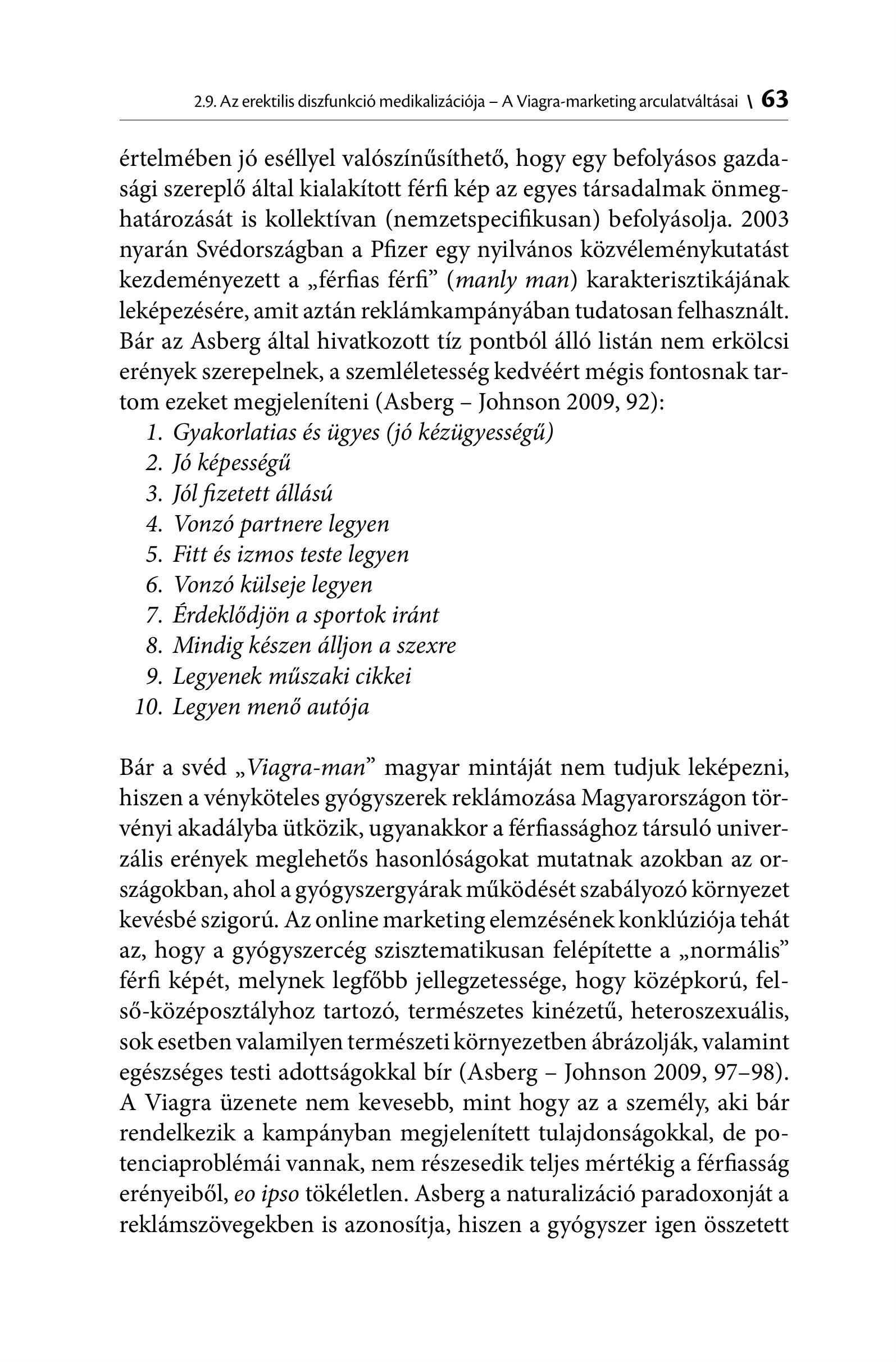 2.9. Az erektilis diszfunkciö medikalizäciöja - A Viagra-marketing arculatvältäsai \ 63 értelmében jó eséllyel valószínűsíthető, hogy egy befolyásos gazdasági szereplő által kialakított férfi kép az egyes társadalmak önmeghatározását is kollektívan (nemzetspecifikusan) befolyásolja. 2003 nyarán Svédországban a Pfizer egy nyilvános közvéleménykutatást kezdeményezett a , férfias férfi" (manly man) karakterisztikájának leképezésére, amit aztán reklámkampányában tudatosan felhasznált. Bár az Asberg által hivatkozott tíz pontból álló listán nem erkölcsi erények szerepelnek, a szemléletesség kedvéért mégis fontosnak tartom ezeket megjeleníteni (Asberg - Johnson 2009, 92): 1. Gyakorlatias és ügyes (jó kézügyességű) . Jó képességű . Jól fizetett állású . Vonzó partnere legyen . Fitt és izmos teste legyen . Vonzó külseje legyen . Érdeklődjön a sportok iránt . Mindig készen álljon a szexre . Legyenek műszaki cikkei . Legyen menő autója SANA AA WH ha oO Bär a sved „Viagra-man” magyar mintäjät nem tudjuk leképezni, hiszen a vényköteles gyógyszerek reklámozása Magyarországon törvényi akadályba ütközik, ugyanakkor a férfiassághoz társuló univerzális erények meglehetős hasonlóságokat mutatnak azokban az országokban, ahol a gyógyszergyárak működését szabályozó környezet kevésbé szigorú. Az online marketing elemzésének konklúziója tehát az, hogy a gyógyszercég szisztematikusan felépítette a , normális" férfi képét, melynek legfőbb jellegzetessége, hogy középkorú, felső-középosztályhoz tartozó, természetes kinézetű, heteroszexuális, sok esetben valamilyen természeti környezetben ábrázolják, valamint egészséges testi adottságokkal bír (Asberg - Johnson 2009, 97-98). A Viagra üzenete nem kevesebb, mint hogy az a személy, aki bár rendelkezik a kampányban megjelenített tulajdonságokkal, de potenciaproblémái vannak, nem részesedik teljes mértékig a férfiasság erényeiből, eo ipso tökéletlen. Asberg a naturalizáció paradoxonját a reklámszövegekben is azonosítja, hiszen a gyógyszer igen összetett
