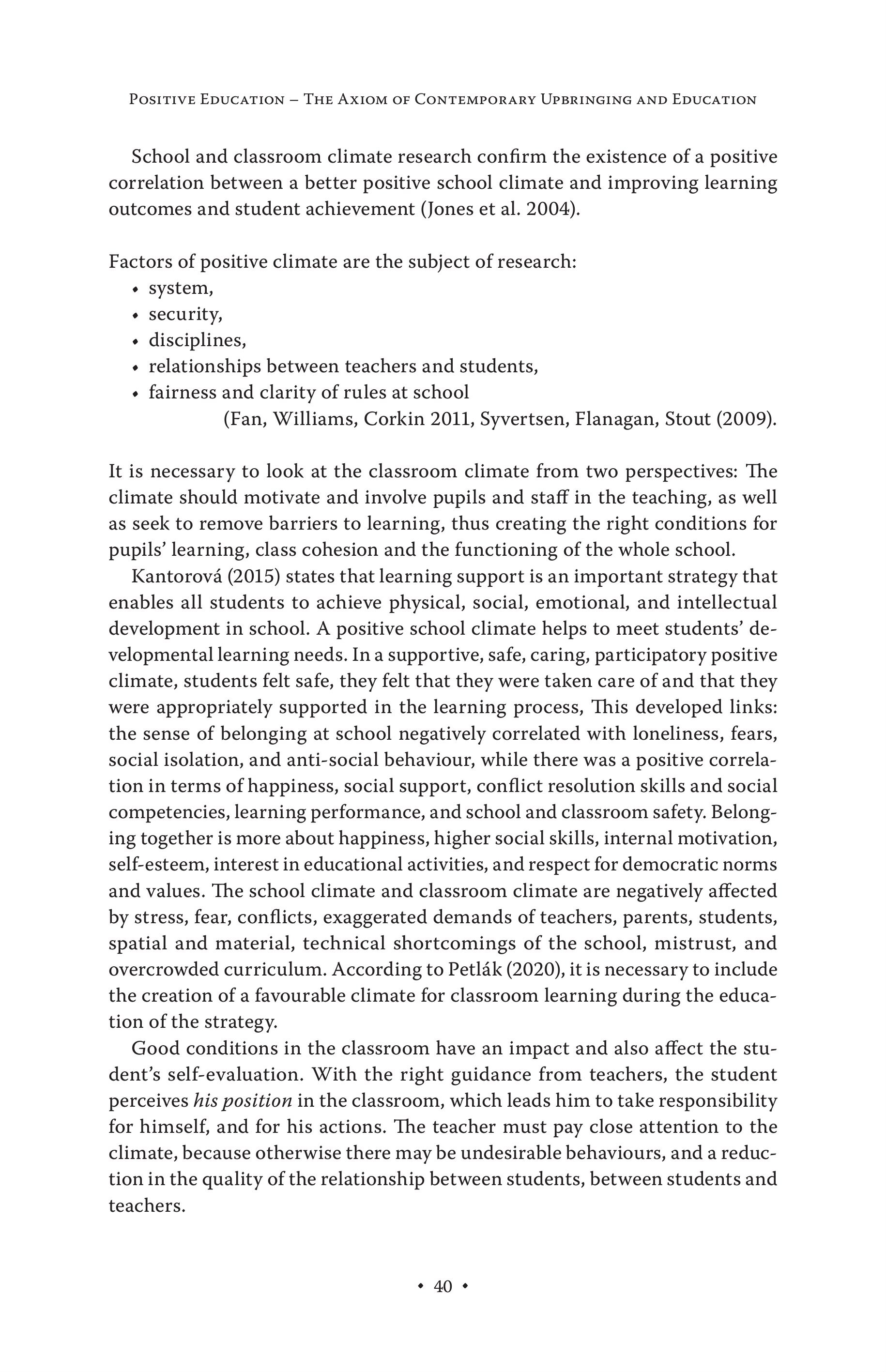 POSITIVE EDUCATION — THE AXIOM OF CONTEMPORARY UPBRINGING AND EDUCATION School and classroom climate research confirm the existence of a positive correlation between a better positive school climate and improving learning outcomes and student achievement (Jones et al. 2004). Factors of positive climate are the subject of research: + system, + security, + disciplines, + relationships between teachers and students, ¢ fairness and clarity of rules at school (Fan, Williams, Corkin 2011, Syvertsen, Flanagan, Stout (2009). It is necessary to look at the classroom climate from two perspectives: The climate should motivate and involve pupils and staff in the teaching, as well as seek to remove barriers to learning, thus creating the right conditions for pupils’ learning, class cohesion and the functioning of the whole school. Kantorova (2015) states that learning support is an important strategy that enables all students to achieve physical, social, emotional, and intellectual development in school. A positive school climate helps to meet students’ developmental learning needs. Ina supportive, safe, caring, participatory positive climate, students felt safe, they felt that they were taken care of and that they were appropriately supported in the learning process, This developed links: the sense of belonging at school negatively correlated with loneliness, fears, social isolation, and anti-social behaviour, while there was a positive correlation in terms of happiness, social support, conflict resolution skills and social competencies, learning performance, and school and classroom safety. Belonging together is more about happiness, higher social skills, internal motivation, self-esteem, interest in educational activities, and respect for democratic norms and values. The school climate and classroom climate are negatively affected by stress, fear, conflicts, exaggerated demands of teachers, parents, students, spatial and material, technical shortcomings of the school, mistrust, and overcrowded curriculum. According to Petlak (2020), it is necessary to include the creation of a favourable climate for classroom learning during the education of the strategy. Good conditions in the classroom have an impact and also affect the student’s self-evaluation. With the right guidance from teachers, the student perceives his position in the classroom, which leads him to take responsibility for himself, and for his actions. The teacher must pay close attention to the climate, because otherwise there may be undesirable behaviours, and a reduction in the quality of the relationship between students, between students and teachers. + 40 +