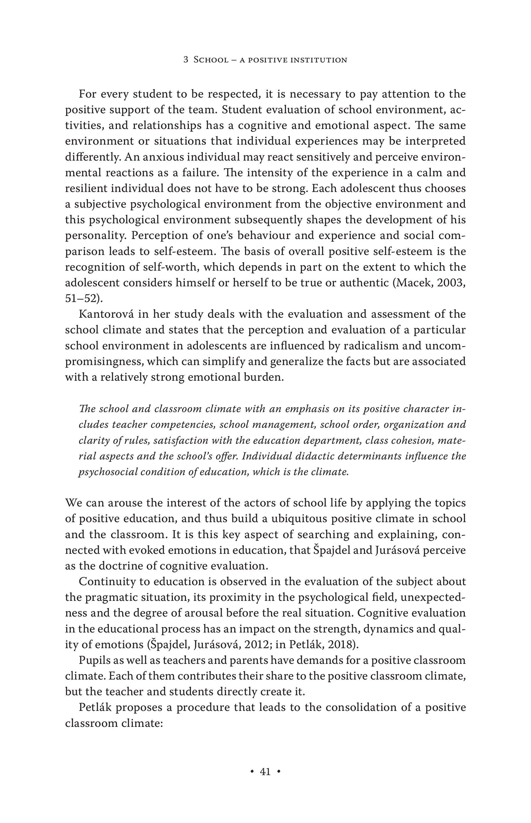 3 SCHOOL — A POSITIVE INSTITUTION For every student to be respected, it is necessary to pay attention to the positive support of the team. Student evaluation of school environment, activities, and relationships has a cognitive and emotional aspect. The same environment or situations that individual experiences may be interpreted differently. An anxious individual may react sensitively and perceive environmental reactions as a failure. The intensity of the experience in a calm and resilient individual does not have to be strong. Each adolescent thus chooses a subjective psychological environment from the objective environment and this psychological environment subsequently shapes the development of his personality. Perception of one’s behaviour and experience and social comparison leads to self-esteem. The basis of overall positive self-esteem is the recognition of self-worth, which depends in part on the extent to which the adolescent considers himself or herself to be true or authentic (Macek, 2003, 51-52). Kantorova in her study deals with the evaluation and assessment of the school climate and states that the perception and evaluation of a particular school environment in adolescents are influenced by radicalism and uncompromisingness, which can simplify and generalize the facts but are associated with a relatively strong emotional burden. The school and classroom climate with an emphasis on its positive character includes teacher competencies, school management, school order, organization and clarity of rules, satisfaction with the education department, class cohesion, material aspects and the school’s offer. Individual didactic determinants influence the psychosocial condition of education, which is the climate. We can arouse the interest of the actors of school life by applying the topics of positive education, and thus build a ubiquitous positive climate in school and the classroom. It is this key aspect of searching and explaining, connected with evoked emotions in education, that Spajdel and Jurasova perceive as the doctrine of cognitive evaluation. Continuity to education is observed in the evaluation of the subject about the pragmatic situation, its proximity in the psychological field, unexpectedness and the degree of arousal before the real situation. Cognitive evaluation in the educational process has an impact on the strength, dynamics and quality of emotions (Spajdel, Juräsovä, 2012; in Petläk, 2018). Pupils as well as teachers and parents have demands for a positive classroom climate. Each ofthem contributes their share to the positive classroom climate, but the teacher and students directly create it. Petläk proposes a procedure that leads to the consolidation of a positive classroom climate: +41 »
