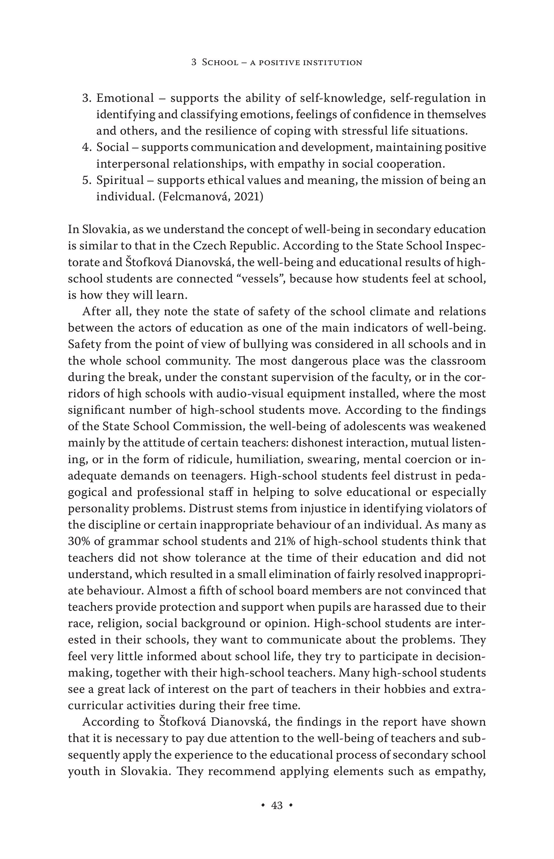 3 SCHOOL — A POSITIVE INSTITUTION 3. Emotional — supports the ability of self-knowledge, self-regulation in identifying and classifying emotions, feelings of confidence in themselves and others, and the resilience of coping with stressful life situations. 4. Social — supports communication and development, maintaining positive interpersonal relationships, with empathy in social cooperation. 5. Spiritual — supports ethical values and meaning, the mission of being an individual. (Felcmanova, 2021) In Slovakia, as we understand the concept of well-being in secondary education is similar to that in the Czech Republic. According to the State School Inspectorate and Stofkova Dianovska, the well-being and educational results of highschool students are connected “vessels”, because how students feel at school, is how they will learn. After all, they note the state of safety of the school climate and relations between the actors of education as one of the main indicators of well-being. Safety from the point of view of bullying was considered in all schools and in the whole school community. The most dangerous place was the classroom during the break, under the constant supervision of the faculty, or in the corridors of high schools with audio-visual equipment installed, where the most significant number of high-school students move. According to the findings of the State School Commission, the well-being of adolescents was weakened mainly by the attitude of certain teachers: dishonest interaction, mutual listening, or in the form of ridicule, humiliation, swearing, mental coercion or inadequate demands on teenagers. High-school students feel distrust in pedagogical and professional staff in helping to solve educational or especially personality problems. Distrust stems from injustice in identifying violators of the discipline or certain inappropriate behaviour of an individual. As many as 30% of grammar school students and 21% of high-school students think that teachers did not show tolerance at the time of their education and did not understand, which resulted in a small elimination of fairly resolved inappropriate behaviour. Almost a fifth of school board members are not convinced that teachers provide protection and support when pupils are harassed due to their race, religion, social background or opinion. High-school students are interested in their schools, they want to communicate about the problems. They feel very little informed about school life, they try to participate in decisionmaking, together with their high-school teachers. Many high-school students see a great lack of interest on the part of teachers in their hobbies and extracurricular activities during their free time. According to Stofkové Dianovska, the findings in the report have shown that it is necessary to pay due attention to the well-being of teachers and subsequently apply the experience to the educational process of secondary school youth in Slovakia. They recommend applying elements such as empathy, «43 ¢