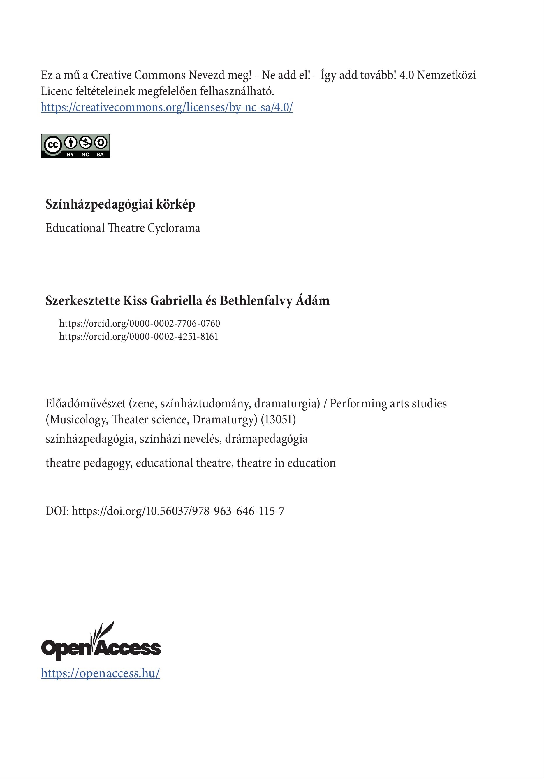 Ez a mű a Creative Commons Nevezd meg! - Ne add el! - Így add tovább! 4.0 Nemzetközi Licenc feltételeinek megfelelően felhasználható. https://creativecommons.org/licenses/by-nc-sa/4.0/ CHE Szinhäzpedagôgiai kôrkép Educational Theatre Cyclorama Szerkesztette Kiss Gabriella és Bethlenfalvy Ádám https://orcid.org/0000-0002-7706-0760 https://orcid.org/0000-0002-4251-8161 Előadóművészet (zene, színháztudomány, dramaturgia) / Performing arts studies (Musicology, Iheater science, Dramaturgy) (13051) szinhazpedagogia, szinhazi nevelés, dramapedagégia theatre pedagogy, educational theatre, theatre in education DOI: https://doi.org/10.56037/978-963-646-115-7 Open/Âccess https://openaccess.hu/