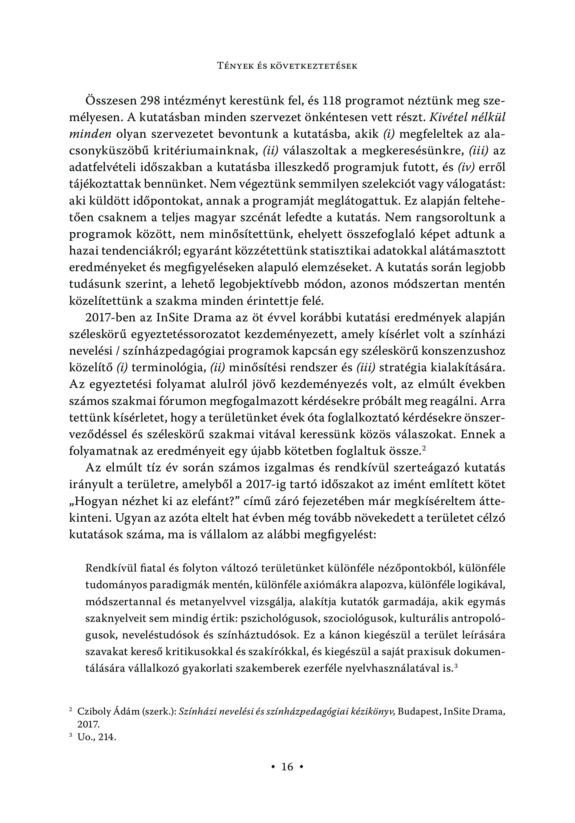TÉNYEK ÉS KÖVETKEZTETÉSEK Összesen 298 intézményt kerestünk fel, és 118 programot néztünk meg személyesen. A kutatásban minden szervezet önkéntesen vett részt. Kivétel nélkül minden olyan szervezetet bevontunk a kutatásba, akik (i) megfeleltek az alacsonyküszöbű kritériumainknak, (ii) válaszoltak a megkeresésünkre, (iii) az adatfelvételi időszakban a kutatásba illeszkedő programjuk futott, és (iv) erröl tájékoztattak bennünket. Nem végeztünk semmilyen szelekciót vagy válogatást: aki küldött időpontokat, annak a programját meglátogattuk. Ez alapján feltehetően csaknem a teljes magyar szcénát lefedte a kutatás. Nem rangsoroltunk a programok között, nem minősítettünk, ehelyett összefoglaló képet adtunk a hazai tendenciákról; egyaránt közzétettünk statisztikai adatokkal alátámasztott eredményeket és megfigyeléseken alapuló elemzéseket. A kutatás során legjobb tudásunk szerint, a lehető legobjektívebb módon, azonos módszertan mentén közelítettünk a szakma minden érintettje felé. 2017-ben az InSite Drama az öt évvel korábbi kutatási eredmények alapján széleskörű egyeztetéssorozatot kezdeményezett, amely kísérlet volt a színházi nevelési / színházpedagógiai programok kapcsán egy széleskörű konszenzushoz közelítő (i) terminológia, (ii) minősítési rendszer és (iii) stratégia kialakítására. Az egyeztetési folyamat alulról jövő kezdeményezés volt, az elmúlt években számos szakmai fórumon megfogalmazott kérdésekre próbált meg reagálni. Arra tettünk kísérletet, hogy a területünket évek óta foglalkoztató kérdésekre önszerveződéssel és széleskörű szakmai vitával keressünk közös válaszokat. Ennek a folyamatnak az eredményeit egy újabb kötetben foglaltuk össze.? Az elmúlt tíz év során számos izgalmas és rendkívül szerteágazó kutatás irányult a területre, amelyből a 2017-ig tartó időszakot az imént említett kötet »Hogyan nézhet ki az elefánt?" című záró fejezetében már megkíséreltem áttekinteni. Ugyan az azóta eltelt hat évben még tovább növekedett a területet célzó kutatások száma, ma is vállalom az alábbi megfigyelést: Rendkívül fiatal és folyton változó területünket különféle nézőpontokból, különféle tudományos paradigmák mentén, különféle axiómákra alapozva, különféle logikával, módszertannal és metanyelvvel vizsgálja, alakítja kutatók garmadája, akik egymás szaknyelveit sem mindig értik: pszichológusok, szociológusok, kulturális antropológusok, neveléstudósok és színháztudósok. Ez a kánon kiegészül a terület leírására szavakat kereső kritikusokkal és szakírókkal, és kiegészül a saját praxisuk dokumentálására vállalkozó gyakorlati szakemberek ezerféle nyelvhasználatával is.? ? Cziboly Ádám (szerk.): Színházi nevelési és színházpedagógiai kézikönyv, Budapest, InSite Drama, 2017. 3 Uo., 214. +16 +