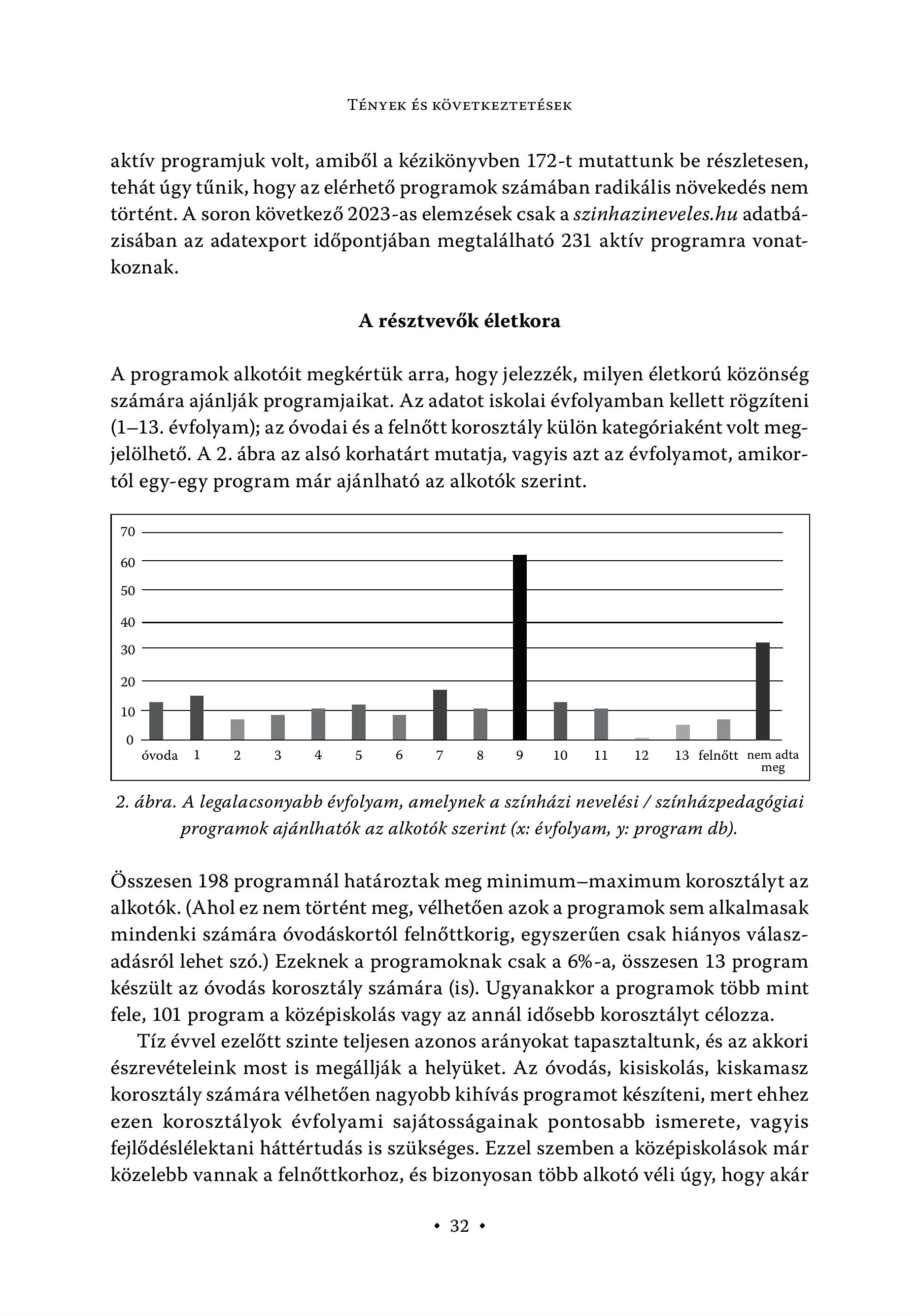 TÉNYEK ÉS KÖVETKEZTETÉSEK aktív programjuk volt, amiből a kézikönyvben 172-t mutattunk be részletesen, tehát úgy tűnik, hogy az elérhető programok számában radikális növekedés nem történt. A soron következő 2023-as elemzések csak a szinhazineveles.hu adatbázisában az adatexport időpontjában megtalálható 231 aktív programra vonatkoznak. A résztvevők életkora A programok alkotóit megkértük arra, hogy jelezzék, milyen életkorú közönség számára ajánlják programjaikat. Az adatot iskolai évfolyamban kellett rögzíteni (1-13. évfolyam); az óvodai és a felnőtt korosztály külön kategóriaként volt megjelölhető. A 2. ábra az alsó korhatárt mutatja, vagyis azt az évfolyamot, amikortól egy-egy program már ajánlható az alkotók szerint. 70 60 50 40 30 20 10 0 óvoda 1 2 3 4 5 6 7 8 9 10 11 12 13 felnőtt nem adta meg 2. ábra. A legalacsonyabb évfolyam, amelynek a színházi nevelési / színházpedagógiai programok ajánlhatók az alkotók szerint (x: évfolyam, y: program db). Összesen 198 programnál hatéroztak meg minimum—maximum korosztályt az alkotók. (Ahol ez nem történt meg, vélhetően azok a programok sem alkalmasak mindenki számára óvodáskortól felnőttkorig, egyszerűen csak hiányos válaszadásról lehet szó.) Ezeknek a programoknak csak a 696-a, összesen 13 program készült az óvodás korosztály számára (is). Ugyanakkor a programok több mint fele, 101 program a középiskolás vagy az annál idősebb korosztályt célozza. Tíz évvel ezelőtt szinte teljesen azonos arányokat tapasztaltunk, és az akkori észrevételeink most is megállják a helyüket. Az óvodás, kisiskolás, kiskamasz korosztály számára vélhetően nagyobb kihívás programot készíteni, mert ehhez ezen korosztályok évfolyami sajátosságainak pontosabb ismerete, vagyis fejlődéslélektani háttértudás is szükséges. Ezzel szemben a középiskolások már közelebb vannak a felnőttkorhoz, és bizonyosan több alkotó véli úgy, hogy akár .32 +