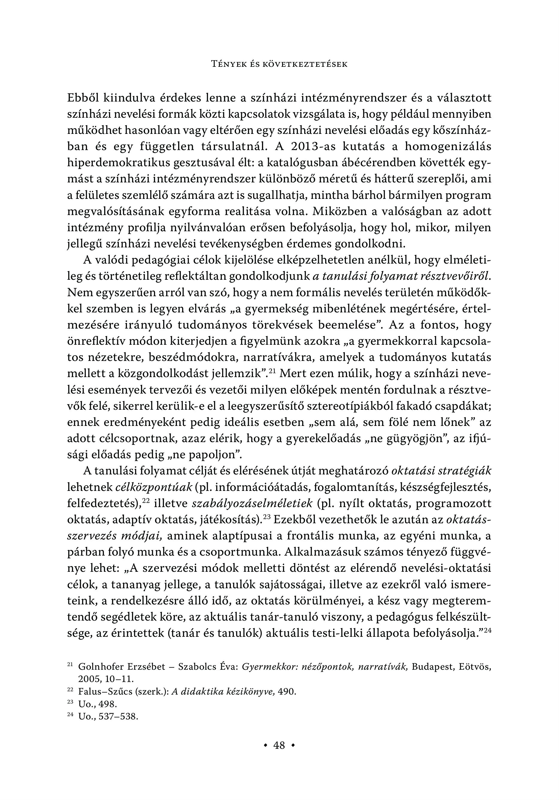 TÉNYEK ÉS KÖVETKEZTETÉSEK Ebből kiindulva érdekes lenne a színházi intézményrendszer és a választott színházi nevelési formák közti kapcsolatok vizsgálata is, hogy például mennyiben működhet hasonlóan vagy eltérően egy színházi nevelési előadás egy kőszínházban és egy független társulatnál. A 2013-as kutatás a homogenizálás hiperdemokratikus gesztusával élt: a katalógusban ábécérendben követték egymást a színházi intézményrendszer különböző méretű és hátterű szereplői, ami a felületes szemlélő számára azt is sugallhatja, mintha bárhol bármilyen program megvalósításának egyforma realitása volna. Miközben a valóságban az adott intézmény profilja nyilvánvalóan erősen befolyásolja, hogy hol, mikor, milyen jellegű színházi nevelési tevékenységben érdemes gondolkodni. A valódi pedagógiai célok kijelölése elképzelhetetlen anélkül, hogy elméletileg és történetileg reflektáltan gondolkodjunk a tanulási folyamat résztvevőiről. Nem egyszerűen arról van szó, hogy a nem formális nevelés területén működőkkel szemben is legyen elvárás , a gyermekség mibenlétének megértésére, értelmezésére irányuló tudományos törekvések beemelése". Az a fontos, hogy önreflektív módon kiterjedjen a figyelmünk azokra , a gyermekkorral kapcsolatos nézetekre, beszédmódokra, narratívákra, amelyek a tudományos kutatás mellett a közgondolkodást jellemzik". Mert ezen múlik, hogy a színházi nevelési események tervezői és vezetői milyen előképek mentén fordulnak a résztvevők felé, sikerrel kerülik-e el a leegyszerűsítő sztereotípiákból fakadó csapdákat; ennek eredményeként pedig ideális esetben , sem alá, sem fölé nem lőnek"? az adott célcsoportnak, azaz elérik, hogy a gyerekelöadäs „ne gügyögjön”, az ifjüsági előadás pedig „ne papoljon”. A tanulási folyamat célját és elérésének útját meghatározó oktatási stratégiák lehetnek célközpontúak (pl. információátadás, fogalomtanítás, készségfejlesztés, felfedeztetés),?? illetve szabályozáselméletiek (pl. nyílt oktatás, programozott oktatás, adaptív oktatás, játékosítás).? Ezekből vezethetők le azután az oktatásszervezés módjai, aminek alaptípusai a frontális munka, az egyéni munka, a párban folyó munka és a csoportmunka. Alkalmazásuk számos tényező függvénye lehet: , A szervezési módok melletti döntést az elérendő nevelési-oktatási célok, a tananyag jellege, a tanulók sajátosságai, illetve az ezekről való ismereteink, a rendelkezésre álló idő, az oktatás körülményei, a kész vagy megteremtendő segédletek köre, az aktuális tanár-tanuló viszony, a pedagógus felkészültsége, az érintettek (tanár és tanulók) aktuális testi-lelki állapota befolyásolja." 21 Golnhofer Erzsébet — Szabolcs Éva: Gyermekkor: nézőpontok, narratívák, Budapest, Eötvös, 2005, 10-11. 22 Falus-Szücs (szerk.): A didaktika kézikönyve, 490. 23 Uo., 498. 24 Uo., 537-538. « 48 +