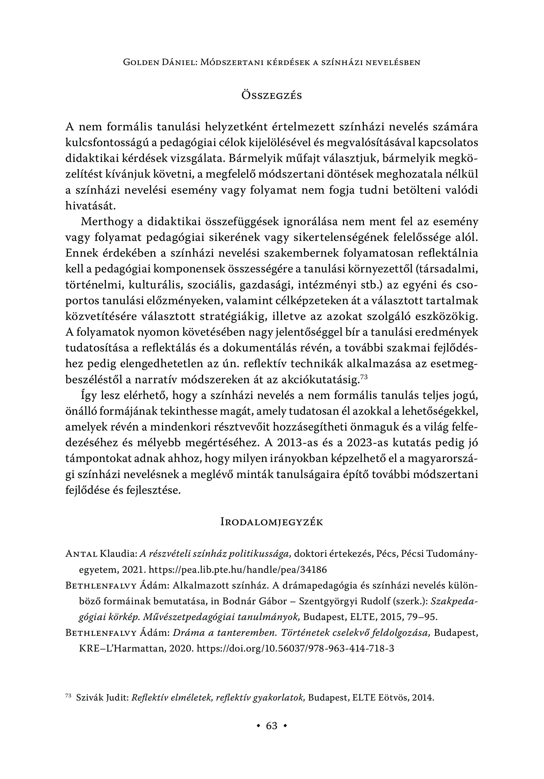 GOLDEN DÁNIEL: MÓDSZERTANI KÉRDÉSEK A SZÍNHÁZI NEVELÉSBEN ÖSSZEGZÉS A nem formális tanulási helyzetként értelmezett színházi nevelés számára kulcsfontosságú a pedagógiai célok kijelölésével és megvalósításával kapcsolatos didaktikai kérdések vizsgálata. Bármelyik műfajt választjuk, bármelyik megközelítést kívánjuk követni, a megfelelő módszertani döntések meghozatala nélkül a színházi nevelési esemény vagy folyamat nem fogja tudni betölteni valódi hivatását. Merthogy a didaktikai összefüggések ignorálása nem ment fel az esemény vagy folyamat pedagógiai sikerének vagy sikertelenségének felelőssége alól. Ennek érdekében a színházi nevelési szakembernek folyamatosan reflektálnia kell a pedagógiai komponensek összességére a tanulási környezettől (társadalmi, történelmi, kulturális, szociális, gazdasági, intézményi stb.) az egyéni és csoportos tanulási előzményeken, valamint célképzeteken át a választott tartalmak közvetítésére választott stratégiákig, illetve az azokat szolgáló eszközökig. A folyamatok nyomon követésében nagy jelentőséggel bír a tanulási eredmények tudatosítása a reflektálás és a dokumentálás révén, a további szakmai fejlődéshez pedig elengedhetetlen az ún. reflektív technikák alkalmazása az esetmegbeszéléstől a narratív módszereken át az akciókutatásig."? Így lesz elérhető, hogy a színházi nevelés a nem formális tanulás teljes jogú, önálló formájának tekinthesse magát, amely tudatosan él azokkal a lehetőségekkel, amelyek révén a mindenkori résztvevőit hozzásegítheti önmaguk és a világ felfedezéséhez és mélyebb megértéséhez. A 2013-as és a 2023-as kutatás pedig jó támpontokat adnak ahhoz, hogy milyen irányokban képzelhető el a magyarországi színházi nevelésnek a meglévő minták tanulságaira építő további módszertani fejlődése és fejlesztése. IRODALOMJEGYZÉK ANTAL Klaudia: A részvételi színház politikussága, doktori értekezés, Pécs, Pécsi Tudományegyetem, 2021. https://pea.lib.pte.hu/handle/pea/34186 BETHLENFALVY Ádám: Alkalmazott színház. A drámapedagógia és színházi nevelés különböző formáinak bemutatása, in Bodnár Gábor — Szentgyôrgyi Rudolf (szerk.): Szakpedagögiai körkep. Müveszetpedagögiai tanulmanyok, Budapest, ELTE, 2015, 79-95. BETHLENFALvVY Ádám: Dráma a tanteremben. Történetek cselekvő feldolgozása, Budapest, KRE-L’Harmattan, 2020. https://doi.org/10.56037/978-963-414-718-3 73 Sziväk Judit: Reflektiv elmeletek, reflektiv gyakorlatok, Budapest, ELTE Eötvös, 2014. .63 +