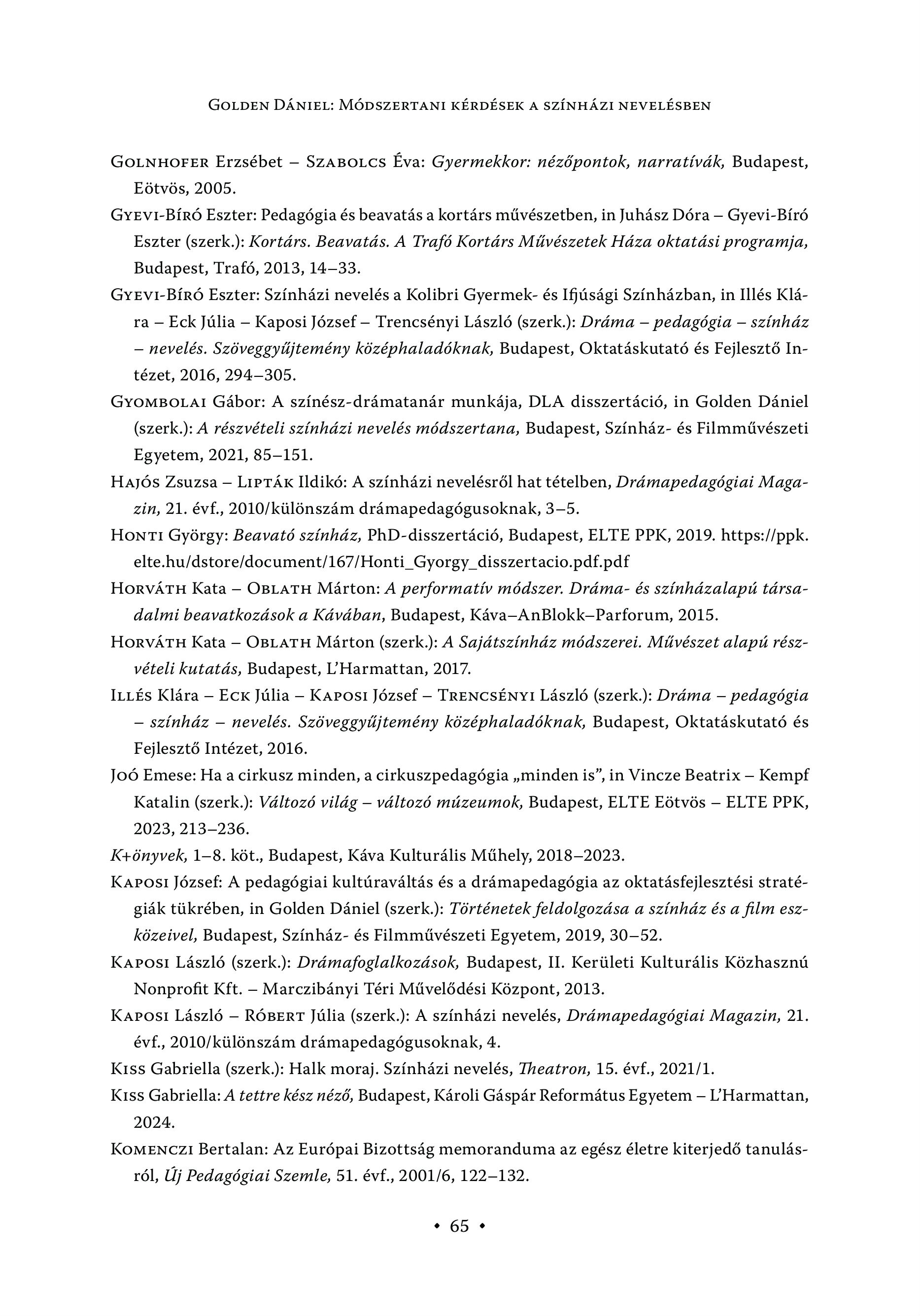 GOLDEN DÁNIEL: MÓDSZERTANI KÉRDÉSEK A SZÍNHÁZI NEVELÉSBEN GOLNHOFER Erzsébet — SZABOLCS Éva: Gyermekkor: nézőpontok, narratívák, Budapest, Eötvös, 2005. GYEVI-BÍRÓ Eszter: Pedagógia és beavatás a kortárs művészetben, in Juhász Dóra — Gyevi-Bíró Eszter (szerk.): Kortárs. Beavatás. A Trafó Kortárs Művészetek Háza oktatási programja, Budapest, Trafó, 2013, 14—33. GYEVI-BÍRÓ Eszter: Színházi nevelés a Kolibri Gyermek- és Ifjúsági Színházban, in Illés Klára — Eck Júlia — Kaposi József — Trencsényi László (szerk.): Dráma — pedagógia — színház — nevelés. Szöveggyűjtemény középhaladóknak, Budapest, Oktatáskutató és Fejlesztő Intezet, 2016, 294-305. GYOMBOLAI Gábor: A színész-drámatanár munkája, DLA disszertáció, in Golden Dániel (szerk.): A részvételi színházi nevelés módszertana, Budapest, Színház- és Filmművészeti Egyetem, 2021, 85-151. Hajós Zsuzsa — LIPTÁK Ildikó: A színházi nevelésről hat tételben, Drámapedagógiai Magazin, 21. évf., 2010/különszám drámapedagógusoknak, 3—5. HONTI György: Beavató színház, PhD-disszertáció, Budapest, ELTE PPK, 2019. https://ppk. elte.hu/dstore/document/167/Honti_Gyorgy_disszertacio.pdf.pdf HORVÁTH Kata — OBLATH Márton: A performatív módszer. Dráma- és színházalapú társadalmi beavatkozasok a Kavaban, Budapest, Käva-AnBlokk-Parforum, 2015. HORVÁTH Kata — OBLATH Marton (szerk.): A Sajdtszinhdz módszerei. Művészet alapú részvételi kutatás, Budapest, LHarmattan, 2017. ILLÉS Klára — Eck Júlia — KApPosIi József — TRENCSÉNYI László (szerk.): Dráma — pedagógia — színház — nevelés. Szöveggyűjtemény középhaladóknak, Budapest, Oktatáskutató és Fejlesztő Intézet, 2016. Joó Emese: Ha a cirkusz minden, a cirkuszpedagógia , minden is", in Vincze Beatrix — Kempf Katalin (szerk.): Változó világ — változó múzeumok, Budapest, ELTE Eötvös — ELTE PPK, 2023, 213—236. K+önyvek, 1-8. köt., Budapest, Käva Kulturälis Mühely, 2018-2023. Kaposı Jözsef: A pedagögiai kulttravaltas és a drämapedagögia az oktatäsfejlesztesi strategiák tükrében, in Golden Dániel (szerk.): Történetek feldolgozása a színház és a film eszközeivel, Budapest, Színház- és Filmművészeti Egyetem, 2019, 30—52. Kaposı Läszlö (szerk.): Drámafoglalkozások, Budapest, II. Kerületi Kulturális Közhasznú Nonprofit Kft. — Marczibányi Téri Művelődési Központ, 2013. Kaposı Läszlö — RÓBERT Júlia (szerk.): A színházi nevelés, Drámapedagógiai Magazin, 21. évf., 2010/különszám drámapedagógusoknak, 4. Kiss Gabriella (szerk.): Halk moraj. Színházi nevelés, Iheatron, 15. évf., 2021/1. Kiss Gabriella: A tettre kész néző, Budapest, Károli Gáspár Református Egyetem — LHarmattan, 2024. KOMENCZI Bertalan: Az Európai Bizottság memoranduma az egész életre kiterjedő tanulásról, Új Pedagógiai Szemle, 51. évf., 2001/6, 122—132. +65 +