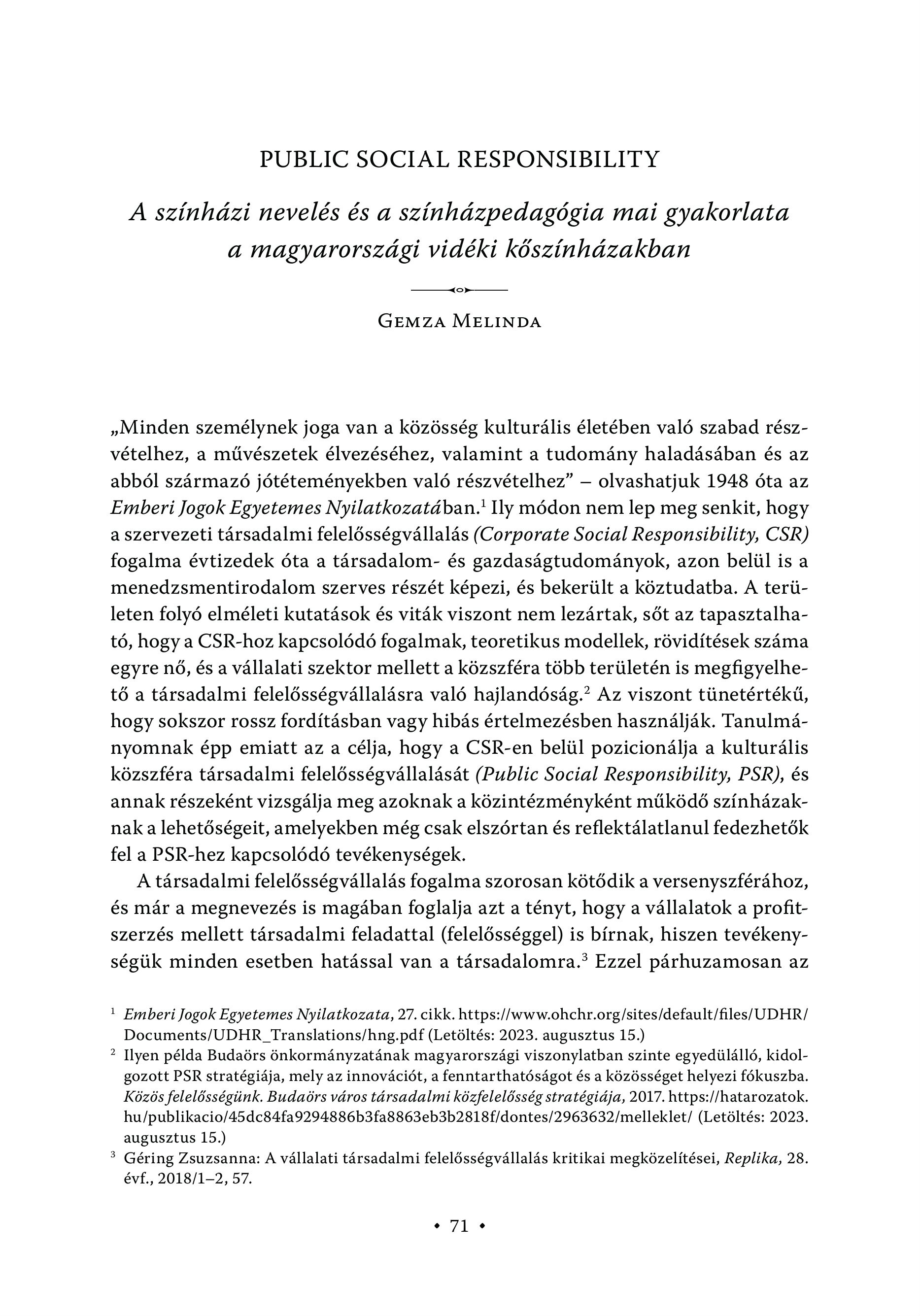 PUBLIC SOCIAL RESPONSIBILITY A színházi nevelés és a színházpedagógia mai gyakorlata a magyarországi vidéki kőszínházakban ——— 93 GEMZA MELINDA ,sMinden személynek joga van a közösség kulturális életében való szabad részvételhez, a művészetek élvezéséhez, valamint a tudomány haladásában és az abból származó jótéteményekben való részvételhez" — olvashatjuk 1948 óta az Emberi Jogok Egyetemes Nyilatkozatában." Ily módon nem lep meg senkit, hogy a szervezeti társadalmi felelősségvállalás (Corporate Social Responsibility, CSR) fogalma évtizedek óta a társadalom- és gazdaságtudományok, azon belül is a menedzsmentirodalom szerves részét képezi, és bekerült a köztudatba. A területen folyó elméleti kutatások és viták viszont nem lezártak, sőt az tapasztalható, hogy a CSR-hoz kapcsolódó fogalmak, teoretikus modellek, rövidítések száma egyre nő, és a vállalati szektor mellett a közszféra több területén is megfigyelhető a társadalmi felelősségvállalásra való hajlandóság.? Az viszont tünetértékű, hogy sokszor rossz fordításban vagy hibás értelmezésben használják. Tanulmányomnak épp emiatt az a célja, hogy a CSR-en belül pozicionálja a kulturális közszféra társadalmi felelősségvállalását (Public Social Responsibility, PSR), és annak részeként vizsgálja meg azoknak a közintézményként működő színházaknak a lehetőségeit, amelyekben még csak elszórtan és reflektálatlanul fedezhetők fel a PSR-hez kapcsolódó tevékenységek. A társadalmi felelősségvállalás fogalma szorosan kötődik a versenyszférához, és már a megnevezés is magában foglalja azt a tényt, hogy a vállalatok a profitszerzés mellett társadalmi feladattal (felelősséggel) is bírnak, hiszen tevékenységük minden esetben hatással van a társadalomra.? Ezzel párhuzamosan az Emberi Jogok Egyetemes Nyilatkozata, 27. cikk. https://www.ohchr.org/sites/default/files/ UDHR/ Documents/UDHR_Translations/hng.pdf (Letöltes: 2023. augusztus 15.) Ilyen pelda Budaörs önkormänyzatänak magyarorszägi viszonylatban szinte egyedülällö, kidol19 gozott PSR stratégiája, mely az innovációt, a fenntarthatóságot és a közösséget helyezi fókuszba. Közös felelősségünk. Budaörs város társadalmi közfelelősség stratégiája, 2017. https://hatarozatok. hu/publikacio/45dc84fa9294886b3fa8863eb3b2818f/dontes/2963632/melleklet/ (Letöltés: 2023. augusztus 15.) Géring Zsuzsanna: A vállalati társadalmi felelősségvállalás kritikai megközelítései, Replika, 28. evf., 2018/1-2, 57. w + 71°