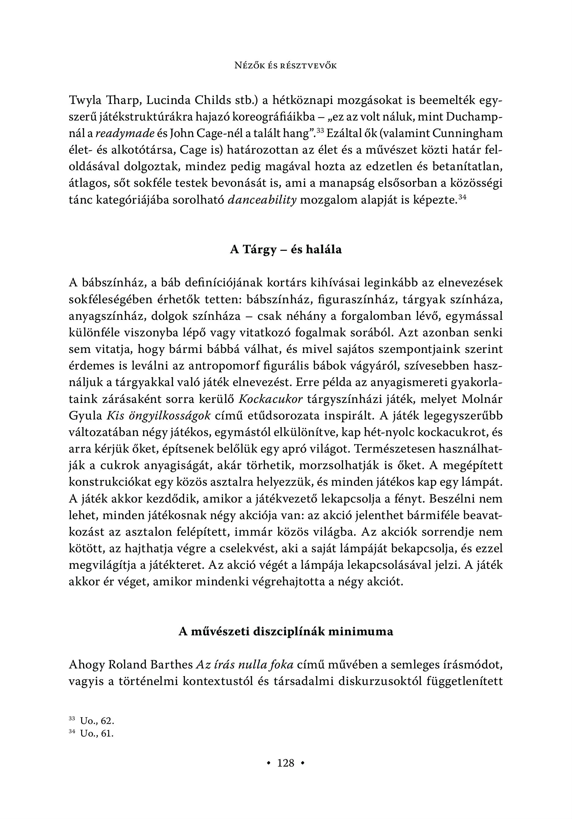NÉZŐK ÉS RÉSZTVEVŐK Twyla Iharp, Lucinda Childs stb.) a hétköznapi mozgásokat is beemelték egyszerü jätekstruktüräkra hajazö koreogräfiäikba - „ez az volt näluk, mint Duchampnäla readymade és John Cage-nel a talält hang”. Ezáltal ők (valamint Cunningham élet- és alkotótársa, Cage is) határozottan az élet és a művészet közti határ feloldásával dolgoztak, mindez pedig magával hozta az edzetlen és betanítatlan, átlagos, sőt sokféle testek bevonását is, ami a manapság elsősorban a közösségi tánc kategóriájába sorolható danceability mozgalom alapját is képezte." A Tárgy - és halála A bábszínház, a báb definíciójának kortárs kihívásai leginkább az elnevezések sokféleségében érhetők tetten: bábszínház, figuraszínház, tárgyak színháza, anyagszínház, dolgok színháza — csak néhány a forgalomban lévő, egymással különféle viszonyba lépő vagy vitatkozó fogalmak sorából. Azt azonban senki sem vitatja, hogy bármi bábbá válhat, és mivel sajátos szempontjaink szerint érdemes is leválni az antropomorf figurális bábok vágyáról, szívesebben használjuk a tárgyakkal való játék elnevezést. Erre példa az anyagismereti gyakorlataink zárásaként sorra kerülő Kockacukor tárgyszínházi játék, melyet Molnár Gyula Kis öngyilkosságok című etűdsorozata inspirált. A játék legegyszerűbb változatában négy játékos, egymástól elkülönítve, kap hét-nyolc kockacukrot, és arra kérjük őket, építsenek belőlük egy apró világot. Természetesen használhatják a cukrok anyagiságát, akár törhetik, morzsolhatják is őket. A megépített konstrukciókat egy közös asztalra helyezzük, és minden játékos kap egy lámpát. A játék akkor kezdődik, amikor a játékvezető lekapcsolja a fényt. Beszélni nem lehet, minden játékosnak négy akciója van: az akció jelenthet bármiféle beavatkozást az asztalon felépített, immár közös világba. Az akciók sorrendje nem kötött, az hajthatja végre a cselekvést, aki a saját lámpáját bekapcsolja, és ezzel megvilágítja a játékteret. Az akció végét a lámpája lekapcsolásával jelzi. A játék akkor ér véget, amikor mindenki végrehajtotta a négy akciót. A művészeti diszciplínák minimuma Ahogy Roland Barthes Az írás nulla foka című művében a semleges írásmódot, vagyis a történelmi kontextustól és társadalmi diskurzusoktól függetlenített 33 Uo., 62. 34 Uo., 61. + 128 +