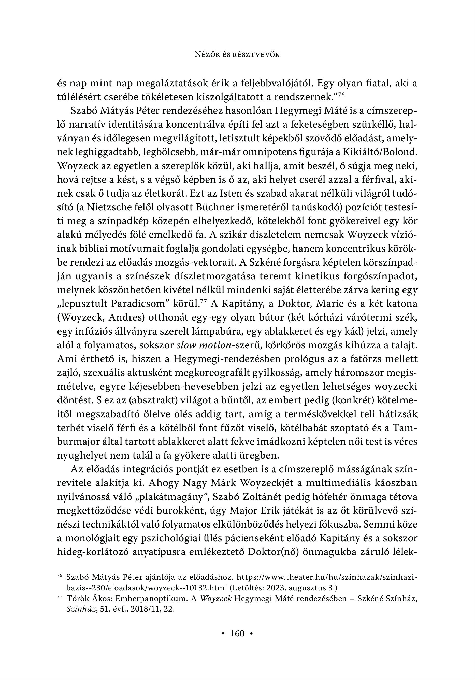 NÉZŐK ÉS RÉSZTVEVŐK és nap mint nap megaláztatások érik a feljebbvalójától. Egy olyan fiatal, aki a túlélésért cserébe tökéletesen kiszolgáltatott a rendszernek.""" Szabó Mátyás Péter rendezéséhez hasonlóan Hegymegi Máté is a címszereplő narratív identitására koncentrálva építi fel azt a feketeségben szürkéllő, halványan és időlegesen megvilágított, letisztult képekből szövődő előadást, amelynek leghiggadtabb, legbölcsebb, már-már omnipotens figurája a Kikiáltó/Bolond. Woyzeck az egyetlen a szereplők közül, aki hallja, amit beszél, ő súgja meg neki, hová rejtse a kést, s a végső képben is ő az, aki helyet cserél azzal a férfival, akinek csak ő tudja az életkorát. Ezt az Isten és szabad akarat nélküli világról tudósító (a Nietzsche felől olvasott Büchner ismeretéről tanúskodó) pozíciót testesíti meg a színpadkép közepén elhelyezkedő, kötelekből font gyökereivel egy kör alakú mélyedés fölé emelkedő fa. A szikár díszletelem nemcsak Woyzeck vízióinak bibliai motívumait foglalja gondolati egységbe, hanem koncentrikus körökbe rendezi az előadás mozgás-vektorait. A Szkéné forgásra képtelen körszínpadján ugyanis a színészek díszletmozgatása teremt kinetikus forgószínpadot, melynek köszönhetően kivétel nélkül mindenki saját életterébe zárva kering egy ,lepusztult Paradicsom" körül." A Kapitány, a Doktor, Marie és a két katona (Woyzeck, Andres) otthonát egy-egy olyan bútor (két kórházi várótermi szék, egy infúziós állványra szerelt lámpabúra, egy ablakkeret és egy kád) jelzi, amely alól a folyamatos, sokszor slow motion-szerű, körkörös mozgás kihúzza a talajt. Ami érthető is, hiszen a Hegymegi-rendezésben prológus az a fatörzs mellett zajló, szexuális aktusként megkoreografált gyilkosság, amely háromszor megismételve, egyre kéjesebben-hevesebben jelzi az egyetlen lehetséges woyzecki döntést. S ez az (absztrakt) világot a bűntől, az embert pedig (konkrét) kötelmeitől megszabadító ölelve ölés addig tart, amíg a terméskövekkel teli hátizsák terhét viselő férfi és a kötélből font fűzőt viselő, kötélbabát szoptató és a Tamburmajor által tartott ablakkeret alatt fekve imádkozni képtelen női test is véres nyughelyet nem talál a fa gyökere alatti üregben. Az előadás integrációs pontját ez esetben is a címszereplő másságának színrevitele alakítja ki. Ahogy Nagy Márk Woyzeckjét a multimediális káoszban nyilvánossá váló ,plakátmagány", Szabó Zoltánét pedig hófehér önmaga tétova megkettőződése védi burokként, úgy Major Erik játékát is az őt körülvevő színészi technikáktól való folyamatos elkülönböződés helyezi fókuszba. Semmi köze a monológjait egy pszichológiai ülés pácienseként előadó Kapitány és a sokszor hideg-korlátozó anyatípusra emlékeztető Doktor(nő) önmagukba záruló lélek76 Szabó Mátyás Péter ajánlója az előadáshoz. https://www.theater.hu/hu/szinhazak/szinhazibazis--230/eloadasok/woyzeck--10132.html (Letöltes: 2023. augusztus 3.) 77 Török Ákos: Emberpanoptikum. A Woyzeck Hegymegi Máté rendezésében — Szkéné Színház, Szinhäz, 51. évf., 2018/11, 22. + 160 +