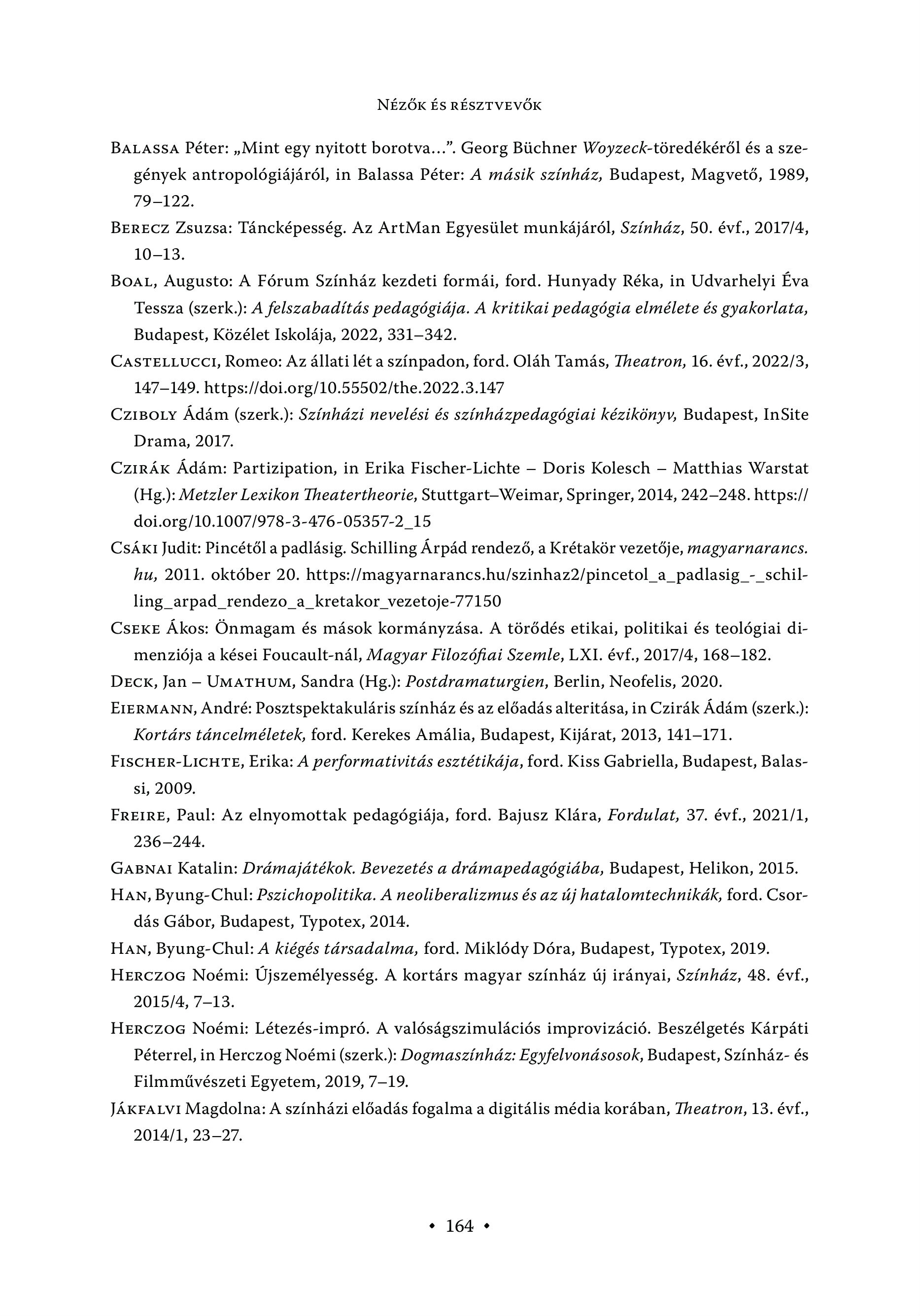 NÉZŐK ÉS RÉSZTVEVŐK BALASSA Péter: , Mint egy nyitott borotva...". Georg Büchner Woyzeck-töredékéről és a szegények antropológiájáról, in Balassa Péter: A másik színház, Budapest, Magvető, 1989, 79-122. BERECZ Zsuzsa: Tänckepesseg. Az ArtMan Egyesület munkäjäröl, Szinhaz, 50. evf., 2017/4, 10-13. BoAL, Augusto: A Förum Szinhäz kezdeti formäi, ford. Hunyady Reka, in Udvarhelyi Eva Tessza (szerk.): A felszabadítás pedagógiája. A kritikai pedagógia elmélete és gyakorlata, Budapest, Közélet Iskolája, 2022, 331—342. CASTELLUCCI, Romeo: Az állati lét a színpadon, ford. Oláh Tamás, Iheatron, 16. évf., 2022/3, 147-149. https://doi.org/10.55502/the.2022.3.147 CzısoLy Ádám (szerk.): Szinhdzi nevelési és szinhdzpedagégiai kézikonyv, Budapest, InSite Drama, 2017. CZIRÁK Ádám: Partizipation, in Erika Fischer-Lichte — Doris Kolesch — Matthias Warstat (Hg.): Metzler Lexikon Theatertheorie, Stuttgart-Weimar, Springer, 2014, 242-248. https:// doi.org/10.1007/978-3-476-05357-2_15 CSÁKI Judit: Pincétől a padlásig. Schilling Árpád rendező, a Krétakör vezetője, magyarnarancs. hu, 2011. október 20. https://magyarnarancs.hu/szinhaz2/pincetol a padlasig - schilling arpad rendezo a kretakor vezetoje-77150 CSEKE Ákos: Önmagam és mások kormányzása. A törődés etikai, politikai és teológiai dimenziója a kései Foucault-nál, Magyar Filozófiai Szemle, LXI. évf., 2017/4, 168—182. Deck, Jan - UMATHUM, Sandra (Hg.): Postdramaturgien, Berlin, Neofelis, 2020. EIERMANN, André: Posztspektakuläris szinhäz es az elöadäs alteritäsa, in Cziräk Ädäm (szerk.): Kortars tancelmeletek, ford. Kerekes Amälia, Budapest, Kijärat, 2013, 141-171. FISCHER-LICHTE, Erika: A performativitas esztetikaja, ford. Kiss Gabriella, Budapest, Balassi, 2009. FREIRE, Paul: Az elnyomottak pedagögiäja, ford. Bajusz Klära, Fordulat, 37. evf., 2021/1, 236-244. GaBNAI Katalin: Dramajatekok. Bevezetés a dramapedagögiaba, Budapest, Helikon, 2015. Han, Byung-Chul: Pszichopolitika. A neoliberalizmus és az uj hatalomtechnikdk, ford. Csordas Gabor, Budapest, Typotex, 2014. Han, Byung-Chul: A kiégés tarsadalma, ford. Miklódy Dóra, Budapest, Typotex, 2019. HERCczoG Noémi: Újszemélyesség. A kortárs magyar színház új irányai, Színház, 48. évf., 2015/4, 7-13. HERczoG Noémi: Létezés-impró. A valóságszimulációs improvizáció. Beszélgetés Kárpáti Péterrel, in Herczog Noémi (szerk.): Dogmaszínház: Egyfelvonásosok, Budapest, Színház- és Filmművészeti Egyetem, 2019, 7—19. JAKFALVI Magdolna: A színházi előadás fogalma a digitális média korában, Iheatron, 13. évf., 2014/1, 23—27. + 164 +