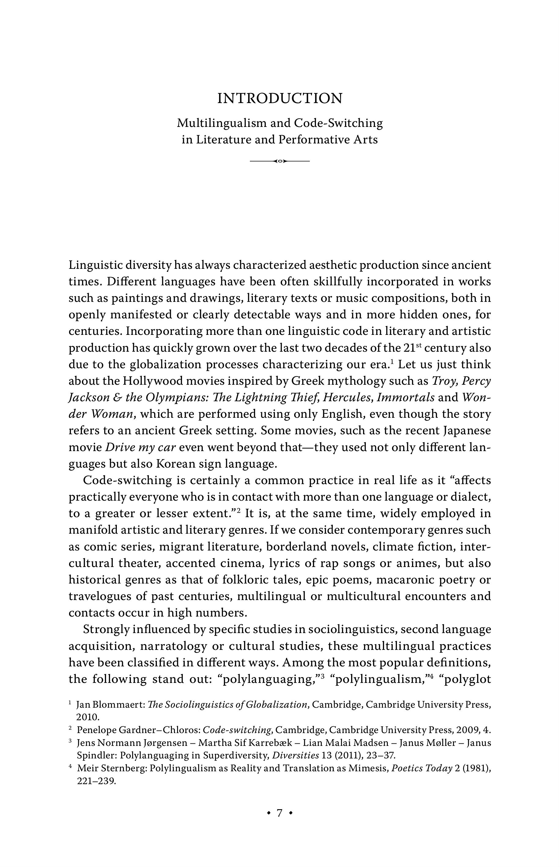 INTRODUCTION Multilingualism and Code-Switching in Literature and Performative Arts ——o— Linguistic diversity has always characterized aesthetic production since ancient times. Different languages have been often skillfully incorporated in works such as paintings and drawings, literary texts or music compositions, both in openly manifested or clearly detectable ways and in more hidden ones, for centuries. Incorporating more than one linguistic code in literary and artistic production has quickly grown over the last two decades of the 21" century also due to the globalization processes characterizing our era.’ Let us just think about the Hollywood movies inspired by Greek mythology such as Troy, Percy Jackson & the Olympians: The Lightning Thief, Hercules, Immortals and Wonder Woman, which are performed using only English, even though the story refers to an ancient Greek setting. Some movies, such as the recent Japanese movie Drive my car even went beyond that—they used not only different languages but also Korean sign language. Code-switching is certainly a common practice in real life as it “affects practically everyone who is in contact with more than one language or dialect, to a greater or lesser extent.”* It is, at the same time, widely employed in manifold artistic and literary genres. If we consider contemporary genres such as comic series, migrant literature, borderland novels, climate fiction, intercultural theater, accented cinema, lyrics of rap songs or animes, but also historical genres as that of folkloric tales, epic poems, macaronic poetry or travelogues of past centuries, multilingual or multicultural encounters and contacts occur in high numbers. Strongly influenced by specific studies in sociolinguistics, second language acquisition, narratology or cultural studies, these multilingual practices have been classified in different ways. Among the most popular definitions, the following stand out: “polylanguaging,” “polylingualism,” “polyglot 994 « ! Jan Blommaert: The Sociolinguistics of Globalization, Cambridge, Cambridge University Press, 2010. ? Penelope Gardner-Chloros: Code-switching, Cambridge, Cambridge University Press, 2009, 4. 3 Jens Normann Jorgensen — Martha Sif Karrebzek — Lian Malai Madsen - Janus Moller — Janus Spindler: Polylanguaging in Superdiversity, Diversities 13 (2011), 23-37. * Meir Sternberg: Polylingualism as Reality and Translation as Mimesis, Poetics Today 2 (1981), 221-239.