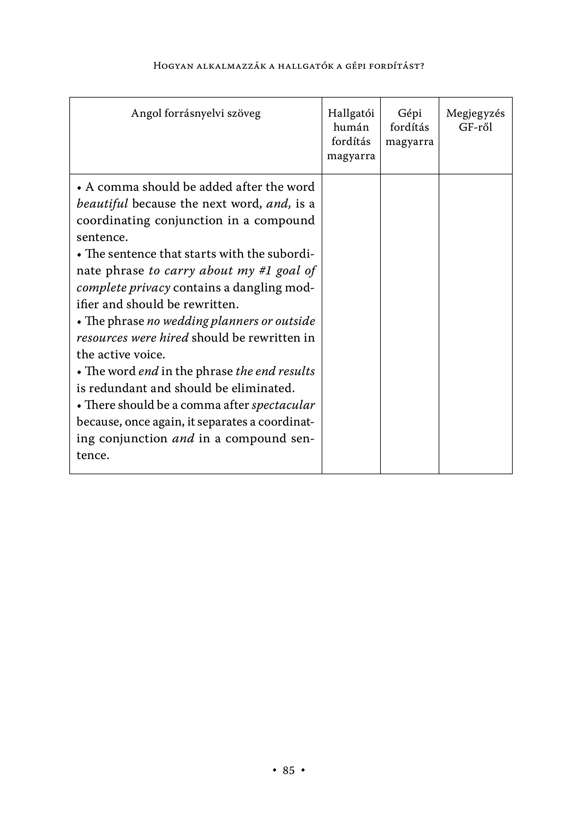 Angol forrásnyelvi szöveg Hallgatói humán fordítás magyarra Gépi fordítás magyarra Megjegyzés GF-ről s A comma should be added after the word beautiful because the next word, and, is a coordinating conjunction in a compound sentence. + Ihe sentence that starts with the subordinate phrase to carry about my #1 goal of complete privacy contains a dangling modifier and should be rewritten. + Ihe phrase no wedding planners or outside resources were hired should be rewritten in the active voice. + Ihe word end in the phrase the end results is redundant and should be eliminated. + There should be acomma after spectacular because, once again, itseparates a coordinating conjunction and in a compound sentence. .85 +