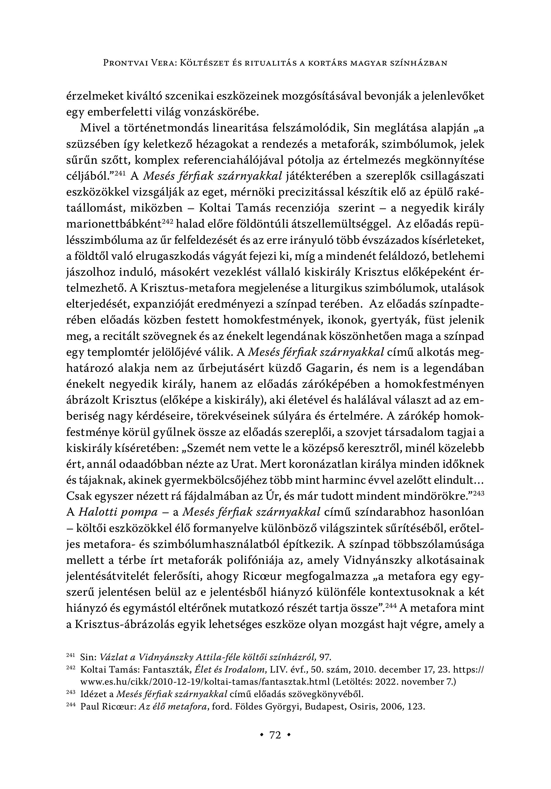 PRONTVAI VERA: KÖLTÉSZET ÉS RITUALITÁS A KORTÁRS MAGYAR SZÍNHÁZBAN érzelmeket kiváltó szcenikai eszközeinek mozgósításával bevonják a jelenlevőket egy emberfeletti világ vonzáskörébe. Mivel a történetmondás linearitása felszámolódik, Sin meglátása alapján ,a szüzsében így keletkező hézagokat a rendezés a metaforák, szimbólumok, jelek sűrűn szőtt, komplex referenciahálójával pótolja az értelmezés megkönnyítése céljából." A Mesés férfiak szárnyakkal játékterében a szereplők csillagászati eszközökkel vizsgálják az eget, mérnöki precizitással készítik elő az épülő rakétaállomást, miközben — Koltai Tamás recenziója szerint — a negyedik király marionettbábként?? halad előre földöntúli átszellemültséggel. Az előadás repülésszimbóluma az űr felfeldezését és az erre irányuló több évszázados kísérleteket, a földtől való elrugaszkodás vágyát fejezi ki, míg a mindenét feláldozó, betlehemi jászolhoz induló, másokért vezeklést vállaló kiskirály Krisztus előképeként értelmezhető. A Krisztus-metafora megjelenése a liturgikus szimbólumok, utalások elterjedését, expanzióját eredményezi a színpad terében. Az előadás színpadterében előadás közben festett homokfestmények, ikonok, gyertyák, füst jelenik meg, a recitált szövegnek és az énekelt legendának köszönhetően maga a színpad egy templomtér jelölőjévé válik. A Mesés férfiak szárnyakkal című alkotás meghatározó alakja nem az űrbejutásért küzdő Gagarin, és nem is a legendában énekelt negyedik király, hanem az előadás záróképében a homokfestményen ábrázolt Krisztus (előképe a kiskirály), aki életével és halálával választ ad az emberiség nagy kérdéseire, törekvéseinek súlyára és értelmére. A zárókép homokfestménye körül gyűlnek össze az előadás szereplői, a szovjet társadalom tagjai a kiskirály kíséretében: , Szemét nem vette le a középső keresztről, minél közelebb ért, annál odaadóbban nézte az Urat. Mert koronázatlan királya minden időknek és tájaknak, akinek gyermekbölcsőjéhez több mint harminc évvel azelőtt elindult... Csak egyszer nézett rá fájdalmában az Úr, és már tudott mindent mindörökre." A Halotti pompa - a Mesés férfiak szárnyakkal című színdarabhoz hasonlóan — költői eszközökkel élő formanyelve különböző világszintek sűrítéséből, erőteljes metafora- és szimbólumhasználatból építkezik. A színpad többszólamúsága mellett a térbe írt metaforák polifóniája az, amely Vidnyánszky alkotásainak jelentésátvitelét felerősíti, ahogy Ricoeur megfogalmazza ,a metafora egy egyszerű jelentésen belül az e jelentésből hiányzó különféle kontextusoknak a két hiányzó és egymástól eltérőnek mutatkozó részét tartja össze". A metafora mint a Krisztus-ábrázolás egyik lehetséges eszköze olyan mozgást hajt végre, amely a 41 Sin: Vázlat a Vidnyánszky Attila-féle költői színházról, 97. 242 Koltai Tamás: Fantaszták, Élet és Irodalom, LIV. évf., 50. szám, 2010. december 17, 23. https:// www.es.hu/cikk/2010-12-19/koltai-tamas/fantasztak.html (Letöltes: 2022. november 7.) 243 Idézet a Mesés férfiak szárnyakkal című előadás szövegkönyvéből. 244 Paul Ricoeur: Az élő metafora, ford. Földes Györgyi, Budapest, Osiris, 2006, 123. +. 72e