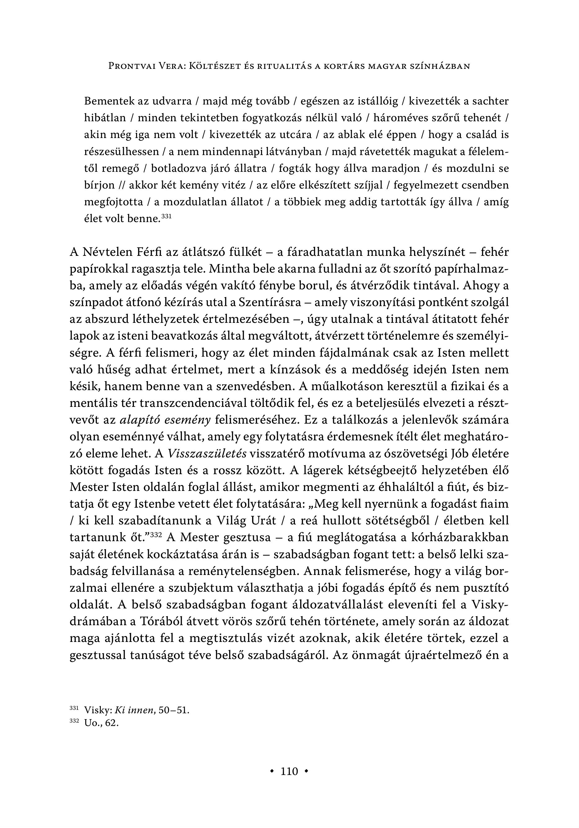 PRONTVAI VERA: KÖLTÉSZET ÉS RITUALITÁS A KORTÁRS MAGYAR SZÍNHÁZBAN Bementek az udvarra / majd még tovább / egészen az istállóig / kivezették a sachter hibátlan / minden tekintetben fogyatkozás nélkül való / hároméves szőrű tehenét / akin még iga nem volt / kivezették az utcára / az ablak elé éppen / hogy a család is részesülhessen / a nem mindennapi látványban / majd rávetették magukat a félelemtől remegő / botladozva járó állatra / fogták hogy állva maradjon / és mozdulni se bírjon // akkor két kemény vitéz / az előre elkészített szíjjal / fegyelmezett csendben megfojtotta / a mozdulatlan állatot / a többiek meg addig tartották így állva / amíg élet volt benne. A Névtelen Férfi az átlátszó fülkét — a fáradhatatlan munka helyszínét — fehér papírokkal ragasztja tele. Mintha bele akarna fulladni az őt szorító papírhalmazba, amely az előadás végén vakító fénybe borul, és átvérződik tintával. Ahogy a színpadot átfonó kézírás utal a Szentírásra — amely viszonyítási pontként szolgál az abszurd léthelyzetek értelmezésében -, úgy utalnak a tintával átitatott fehér lapok az isteni beavatkozás által megváltott, átvérzett történelemre és személyiségre. A férfi felismeri, hogy az élet minden fájdalmának csak az Isten mellett való hűség adhat értelmet, mert a kínzások és a meddőség idején Isten nem késik, hanem benne van a szenvedésben. A műalkotáson keresztül a fizikai és a mentális tér transzcendenciával töltődik fel, és ez a beteljesülés elvezeti a résztvevőt az alapító esemény felismeréséhez. Ez a találkozás a jelenlevők számára olyan eseménnyé válhat, amely egy folytatásra érdemesnek ítélt élet meghatározó eleme lehet. A Visszaszületés visszatérő motívuma az ószövetségi Jób életére kötött fogadás Isten és a rossz között. A lágerek kétségbeejtő helyzetében élő Mester Isten oldalán foglal állást, amikor megmenti az éhhaláltól a fiút, és biztatja őt egy Istenbe vetett élet folytatására: , Meg kell nyernünk a fogadást fiaim / ki kell szabadítanunk a Világ Urát / a reá hullott sötétségből / életben kell tartanunk őt."?? A Mester gesztusa — a fiú meglátogatása a kórházbarakkban saját életének kockáztatása árán is — szabadságban fogant tett: a belső lelki szabadság felvillanása a reménytelenségben. Annak felismerése, hogy a világ borzalmai ellenére a szubjektum választhatja a jóbi fogadás építő és nem pusztító oldalát. A belső szabadságban fogant áldozatvállalást eleveníti fel a Viskydrámában a Tórából átvett vörös szőrű tehén története, amely során az áldozat maga ajánlotta fel a megtisztulás vizét azoknak, akik életére törtek, ezzel a gesztussal tanúságot téve belső szabadságáról. Az önmagát újraértelmező én a 331 Visky: Ki innen, 50—51. 332 TJo., 62. s 110 "