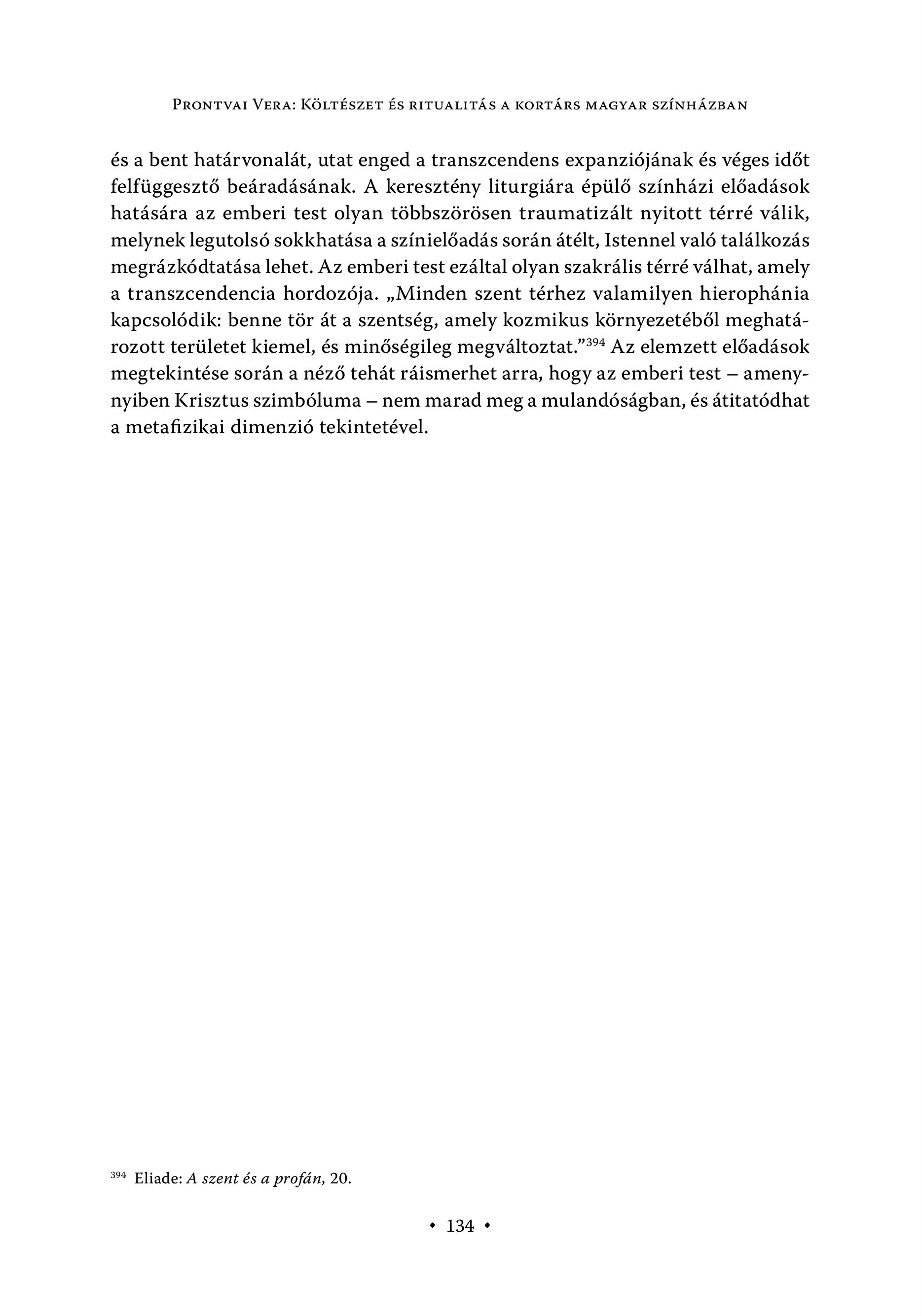 PRONTVAI VERA: KÖLTÉSZET ÉS RITUALITÁS A KORTÁRS MAGYAR SZÍNHÁZBAN és a bent határvonalát, utat enged a transzcendens expanziójának és véges időt felfüggesztő beáradásának. A keresztény liturgiára épülő színházi előadások hatására az emberi test olyan többszörösen traumatizált nyitott térré válik, melynek legutolsó sokkhatása a színielőadás során átélt, Istennel való találkozás megrázkódtatása lehet. Az emberi test ezáltal olyan szakrális térré válhat, amely a transzcendencia hordozója. , Minden szent térhez valamilyen hierophánia kapcsolódik: benne tör át a szentség, amely kozmikus környezetéből meghatározott területet kiemel, és minőségileg megváltoztat."?" Az elemzett előadások megtekintése során a néző tehát ráismerhet arra, hogy az emberi test — amenynyiben Krisztus szimbóluma — nem marad meg a mulandóságban, és átitatódhat a metafizikai dimenzió tekintetével. 394 Eliade: A szent és a profán, 20. s 134 +