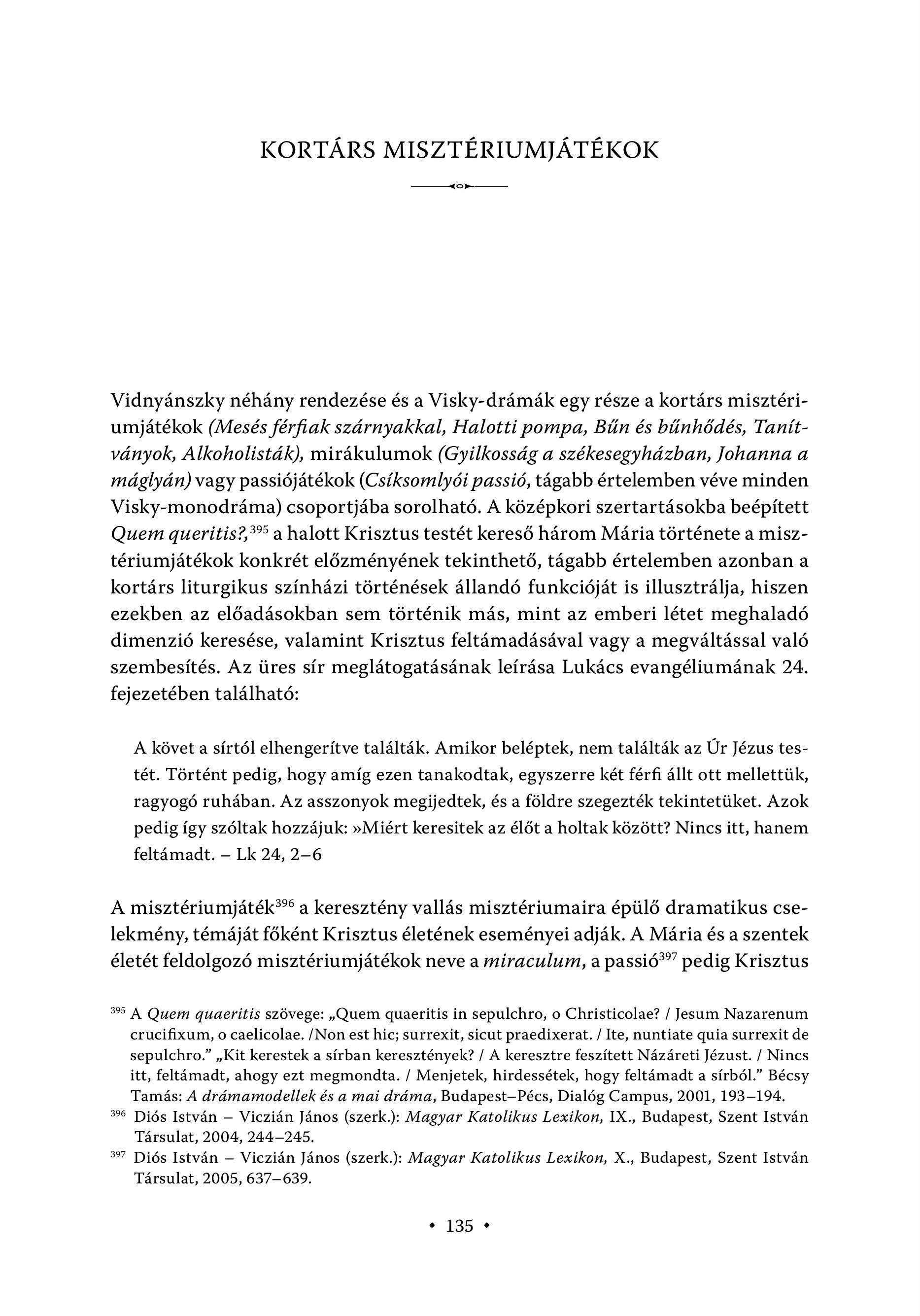 KORTÁRS MISZTÉRIUMJÁTÉKOK me Vidnyánszky néhány rendezése és a Visky-drámák egy része a kortárs misztériumjátékok (Mesés férfiak szárnyakkal, Halotti pompa, Bűn és bűnhődés, Tanítványok, Alkoholisták), mirákulumok (Gyilkosság a székesegyházban, Johanna a máglyán) vagy passiójátékok (Csíksomlyói passió, tágabb értelemben véve minden Visky-monodráma) csoportjába sorolható. A középkori szertartásokba beépített Quem queritis?,% a halott Krisztus testet kereső három Mária története a misztériumjátékok konkrét előzményének tekinthető, tágabb értelemben azonban a kortárs liturgikus színházi történések állandó funkcióját is illusztrálja, hiszen ezekben az előadásokban sem történik más, mint az emberi létet meghaladó dimenzió keresése, valamint Krisztus feltámadásával vagy a megváltással való szembesítés. Az üres sír meglátogatásának leírása Lukács evangéliumának 24. fejezetében található: A követ a sírtól elhengerítve találták. Amikor beléptek, nem találták az Úr Jézus testét. Történt pedig, hogy amíg ezen tanakodtak, egyszerre két férfi állt ott mellettük, ragyogó ruhában. Az asszonyok megijedtek, és a földre szegezték tekintetüket. Azok pedig így szóltak hozzájuk: sMiért keresitek az élőt a holtak között? Nincs itt, hanem feltámadt. — Lk 24, 2-6 A misztériumjáték?" a keresztény vallás misztériumaira épülő dramatikus cselekmény, témáját főként Krisztus életének eseményei adják. A Mária és a szentek életét feldolgozó misztériumjátékok neve a miraculum, a passió?" pedig Krisztus 35 A Quem quaeritis szovege: ,Quem quaeritis in sepulchro, o Christicolae? / Jesum Nazarenum crucifixum, 0 caelicolae. /Non est hic; surrexit, sicut praedixerat. / Ite, nuntiate quia surrexit de sepulchro.” „Kit kerestek a sírban keresztények? / A keresztre feszített Názáreti Jézust. / Nincs itt, feltámadt, ahogy ezt megmondta. / Menjetek, hirdessétek, hogy feltámadt a sírból." Bécsy Tamas: A drdmamodellek és a mai drama, Budapest—Pécs, Dial6g Campus, 2001, 193-194. 396 Diós István — Vicziän Janos (szerk.): Magyar Katolikus Lexikon, IX., Budapest, Szent Istvan Tärsulat, 2004, 244-245. #7 Dids Istvan — Viczián János (szerk.): Magyar Katolikus Lexikon, X., Budapest, Szent István Tarsulat, 2005, 637-639. * 135 +