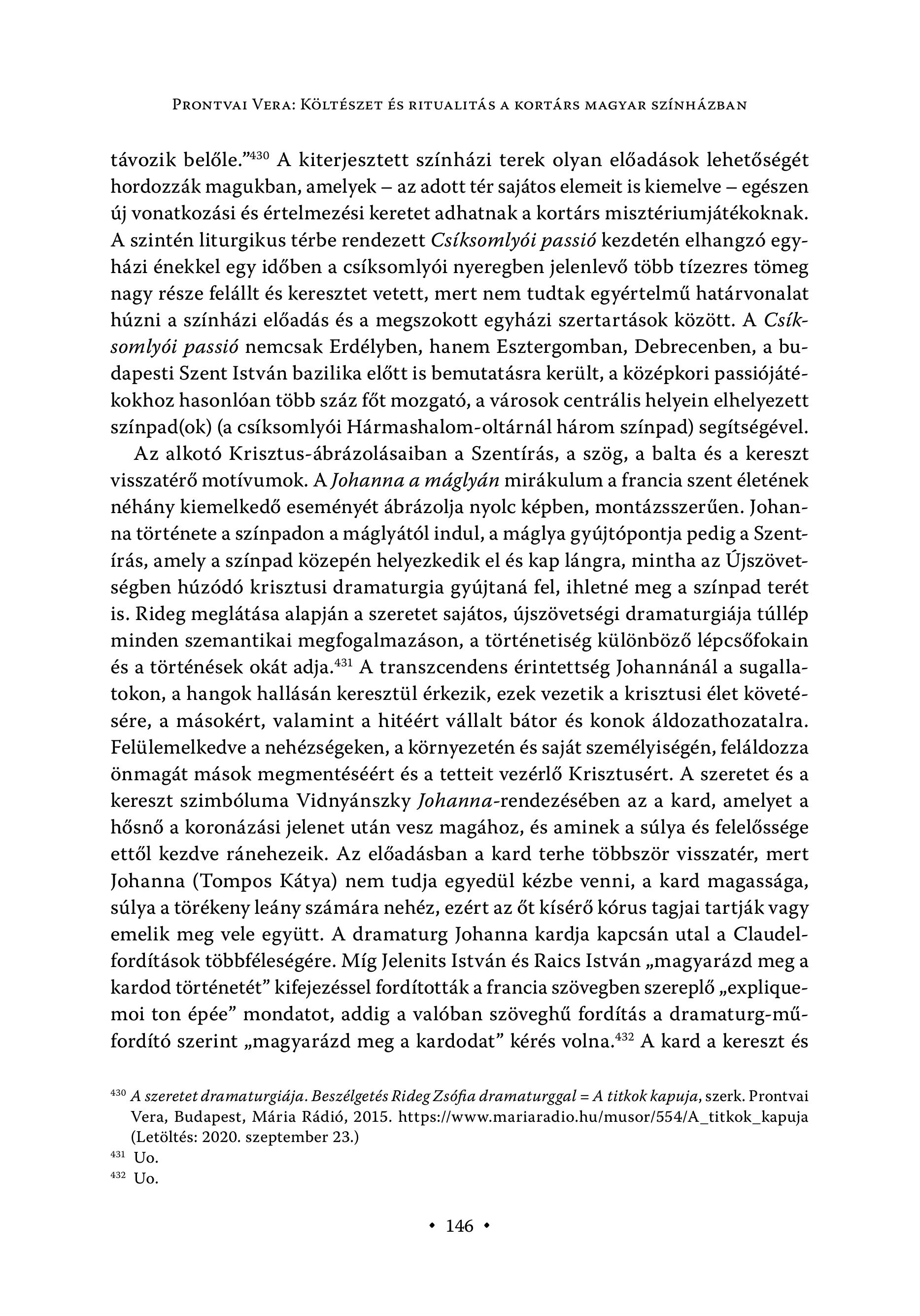 PRONTVAI VERA: KÖLTÉSZET ÉS RITUALITÁS A KORTÁRS MAGYAR SZÍNHÁZBAN távozik belőle." A kiterjesztett színházi terek olyan előadások lehetőségét hordozzák magukban, amelyek - az adott tér sajátos elemeit is kiemelve — egészen új vonatkozási és értelmezési keretet adhatnak a kortárs misztériumjátékoknak. A szintén liturgikus térbe rendezett Csíksomlyói passió kezdetén elhangzó egyházi énekkel egy időben a csíksomlyói nyeregben jelenlevő több tízezres tömeg nagy része felállt és keresztet vetett, mert nem tudtak egyértelmű határvonalat húzni a színházi előadás és a megszokott egyházi szertartások között. A Csíksomlyói passió nemcsak Erdélyben, hanem Esztergomban, Debrecenben, a budapesti Szent István bazilika előtt is bemutatásra került, a középkori passiójátékokhoz hasonlóan több száz főt mozgató, a városok centrális helyein elhelyezett színpad(ok) (a csíksomlyói Hármashalom-oltárnál három színpad) segítségével. Az alkotó Krisztus-ábrázolásaiban a Szentírás, a szög, a balta és a kereszt visszatérő motívumok. A Johanna a máglyán mirákulum a francia szent életének néhány kiemelkedő eseményét ábrázolja nyolc képben, montázsszerűen. Johanna története a színpadon a máglyától indul, a máglya gyújtópontja pedig a Szentírás, amely a színpad közepén helyezkedik el és kap lángra, mintha az Újszövetségben húzódó krisztusi dramaturgia gyújtaná fel, ihletné meg a színpad terét is. Rideg meglátása alapján a szeretet sajátos, újszövetségi dramaturgiája túllép minden szemantikai megfogalmazáson, a történetiség különböző lépcsőfokain és a történések okát adja."! A transzcendens érintettség Johannánál a sugallatokon, a hangok hallásán keresztül érkezik, ezek vezetik a krisztusi élet követésére, a másokért, valamint a hitéért vállalt bátor és konok áldozathozatalra. Felülemelkedve a nehézségeken, a környezetén és saját személyiségén, feláldozza önmagát mások megmentéséért és a tetteit vezérlő Krisztusért. A szeretet és a kereszt szimbóluma Vidnyánszky Johanna-rendezésében az a kard, amelyet a hősnő a koronázási jelenet után vesz magához, és aminek a súlya és felelőssége ettől kezdve ránehezeik. Az előadásban a kard terhe többször visszatér, mert Johanna (Tompos Kátya) nem tudja egyedül kézbe venni, a kard magassága, súlya a törékeny leány számára nehéz, ezért az őt kísérő kórus tagjai tartják vagy emelik meg vele együtt. A dramaturg Johanna kardja kapcsán utal a Claudelforditäsok tobbféleségére. Mig Jelenits Istvan és Raics Istvan ,magyarazd meg a kardod történetét" kifejezéssel fordították a francia szövegben szereplő „expliquemoi ton épée" mondatot, addig a valóban szöveghű fordítás a dramaturg-műfordító szerint , magyarázd meg a kardodat" kérés volna."? A kard a kereszt és 130 A szeretet dramaturgiája. Beszélgetés Rideg Zsófia dramaturggal - A titkok kapuja, szerk. Prontvai Vera, Budapest, Märia Rädiö, 2015. https://www.mariaradio.hu/musor/554/A_titkok_kapuja (Letöltés: 2020. szeptember 23.) 431 Uo. 132 Uo. s 146 "