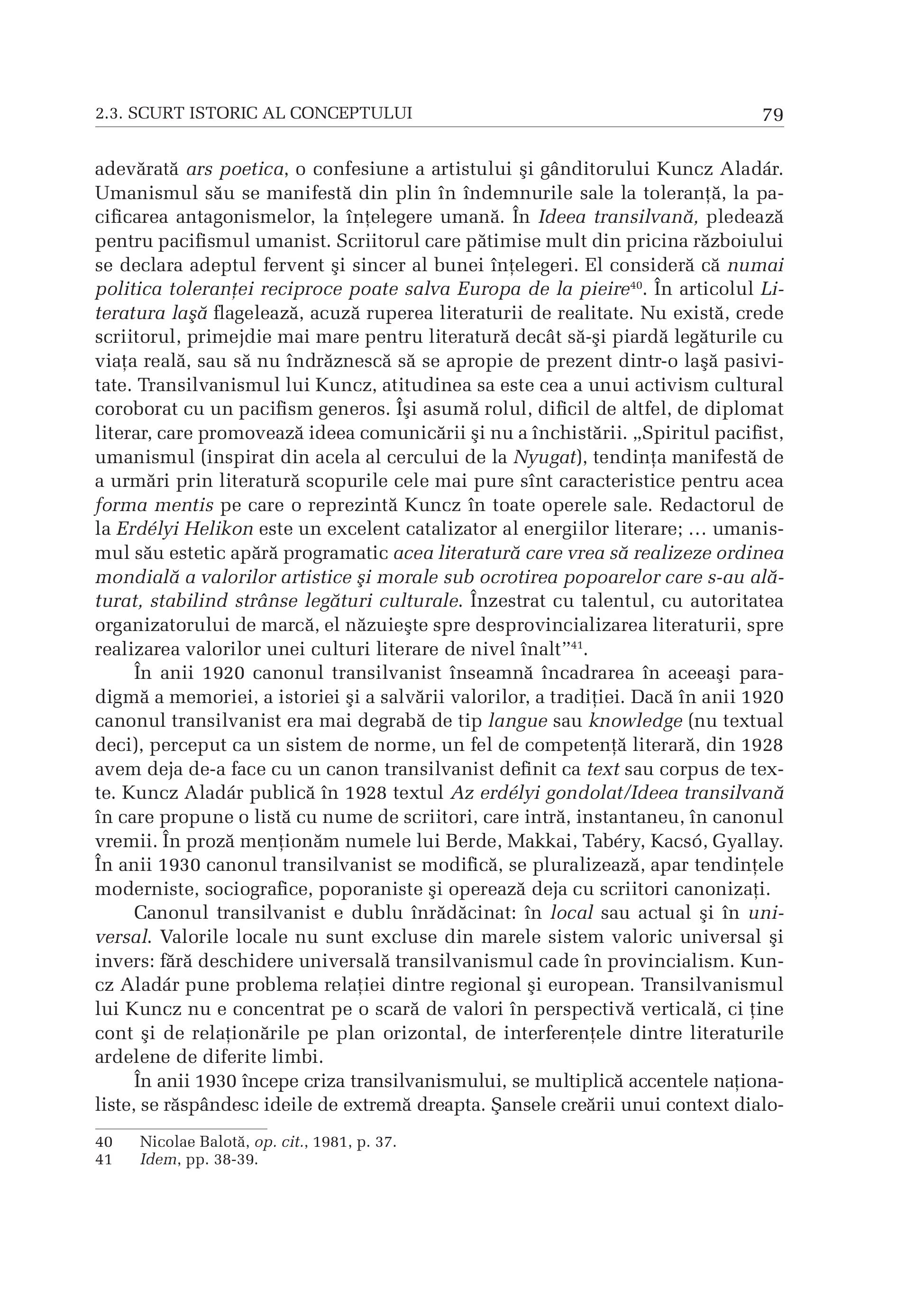 2.3. SCURT ISTORIC AL CONCEPTULUI 79 adeváratá ars poetica, o confesiune a artistului si gánditorului Kuncz Aladár. Umanismul säu se manifestä din plin in indemnurile sale la tolerantä, la pacificarea antagonismelor, la intelegere umanä. In Ideea transilvanä, pledeazä pentru pacifismul umanist. Scriitorul care pätimise mult din pricina räzboiului se declara adeptul fervent si sincer al bunei intelegeri. El considerä cä numai politica tolerantei reciproce poate salva Europa de la pieire*®. In articolul Literatura lasä flageleazä, acuzä ruperea literaturii de realitate. Nu existä, crede scriitorul, primejdie mai mare pentru literaturä decät sä-si piardä legäturile cu viata realä, sau sä nu indräznescä sä se apropie de prezent dintr-o lasä pasivitate. Transilvanismul lui Kuncz, atitudinea sa este cea a unui activism cultural coroborat cu un pacifism generos. Isi asumä rolul, dificil de altfel, de diplomat literar, care promoveazä ideea comunicärii sinu ainchistärii. „Spiritul pacifist, umanismul (inspirat din acela al cercului de la Nyugat), tendinta manifestä de a urmäri prin literaturä scopurile cele mai pure sint caracteristice pentru acea forma mentis pe care o reprezintä Kuncz in toate operele sale. Redactorul de la Erdelyi Helikon este un excelent catalizator al energiilor literare; ... umanismul säu estetic apärä programatic acea literaturä care vrea sä realizeze ordinea mondialä a valorilor artistice si morale sub ocrotirea popoarelor care s-au aläturat, stabilind stränse legäturi culturale. Înzestrat cu talentul, cu autoritatea organizatorului de marcä, el näzuieste spre desprovincializarea literaturii, spre realizarea valorilor unei culturi literare de nivel fnalt”#. In anii 1920 canonul transilvanist înseamnä incadrarea in aceeasi paradigmä a memoriei, a istoriei si a salvärii valorilor, a traditiei. Dacä în anii 1920 canonul transilvanist era mai degrabä de tip Jangue sau knowledge (nu textual deci), perceput ca un sistem de norme, un fel de competenta literara, din 1928 avem deja de-a face cu un canon transilvanist definit ca text sau corpus de texte. Kuncz Aladár publica in 1928 textul Az erdélyi gondolat/Ideea transilvanä in care propune o lista cu nume de scriitori, care intra, instantaneu, in canonul vremii. În prozä mentionäm numele lui Berde, Makkai, Tabéry, Kacs6, Gyallay. In anii 1930 canonul transilvanist se modificä, se pluralizeazä, apar tendintele moderniste, sociografice, poporaniste si opereazä deja cu scriitori canonizati. Canonul transilvanist e dublu inrädäcinat: in local sau actual si in universal. Valorile locale nu sunt excluse din marele sistem valoric universal si invers: färä deschidere universalä transilvanismul cade in provincialism. Kuncz Aladär pune problema relatiei dintre regional si european. Transilvanismul lui Kuncz nu e concentrat pe o scarä de valori in perspectivä verticalä, ci tine cont si de relationärile pe plan orizontal, de interferentele dintre literaturile ardelene de diferite limbi. In anii 1930 incepe criza transilvanismului, se multiplicä accentele nationaliste, se räspändesc ideile de extremä dreapta. Sansele creärii unui context dialo40 Nicolae Balotä, op. cit., 1981, p. 37. 41 Idem, pp. 38-39.