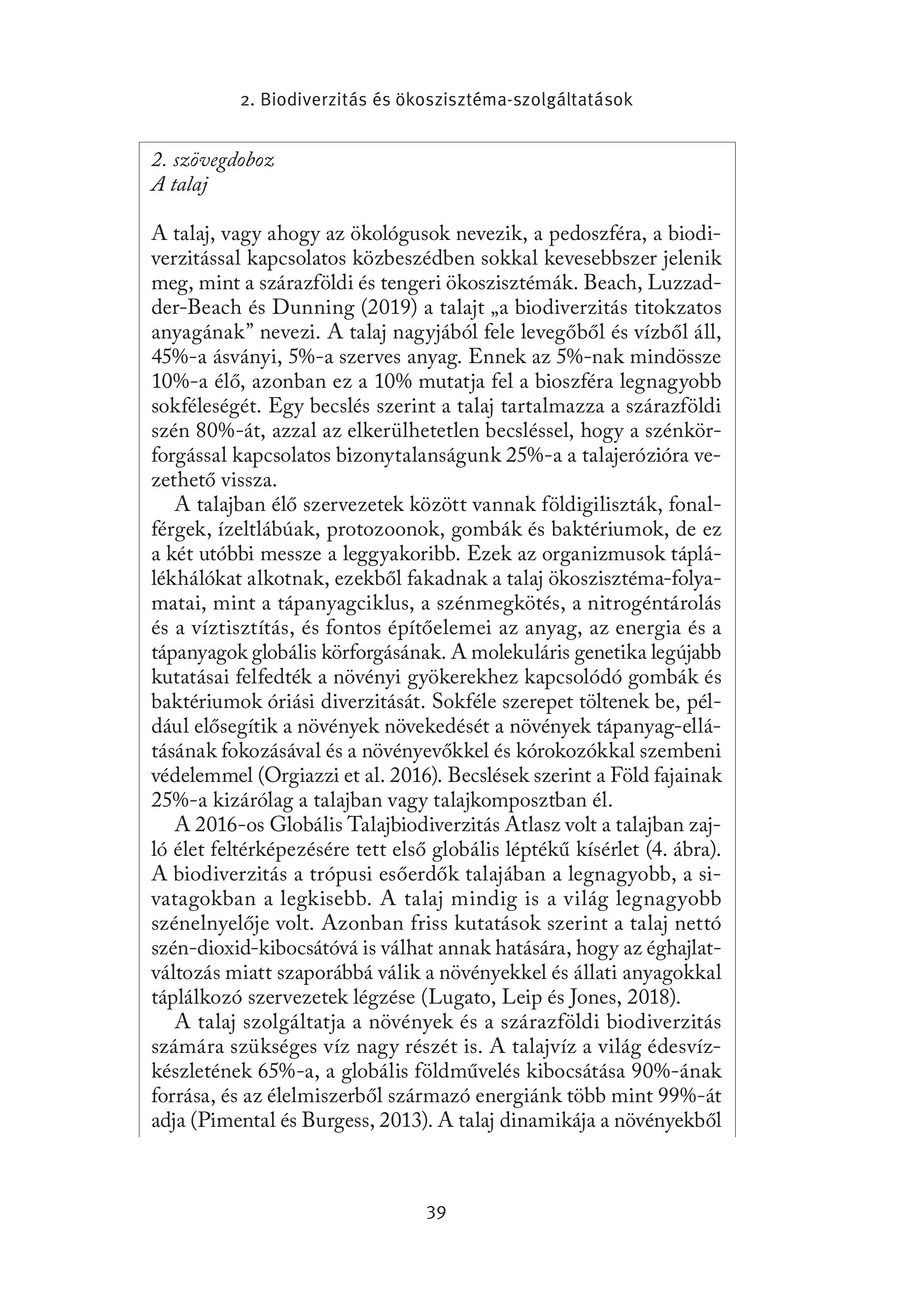 2. Biodiverzitás és ökoszisztéma-szolgáltatások 2. szövegdoboz A talaj A talaj, vagy ahogy az ökológusok nevezik, a pedoszféra, a biodiverzitással kapcsolatos közbeszédben sokkal kevesebbszer jelenik meg, mint a szárazföldi és tengeri ökoszisztémák. Beach, Luzzadder-Beach és Dunning (2019) a talajt ,a biodiverzitás titokzatos anyagának" nevezi. A talaj nagyjából fele levegőből és vízből áll, 45%-a ásványi, 590-a szerves anyag. Ennek az 596-nak mindössze 10%-a élő, azonban ez a 1096 mutatja fel a bioszféra legnagyobb sokféleségét. Egy becslés szerint a talaj tartalmazza a szárazföldi szén 8096-át, azzal az elkerülhetetlen becsléssel, hogy a szénkörforgässal kapcsolatos bizonytalansägunk 25%-a a talajeröziöra vezethetö vissza. A talajban élő szervezetek között vannak földigiliszták, fonalférgek, ízeltlábúak, protozoonok, gombák és baktériumok, de ez a két utóbbi messze a leggyakoribb. Ezek az organizmusok táplálékhálókat alkotnak, ezekből fakadnak a talaj ökoszisztéma-folyamatai, mint a tápanyagciklus, a szénmegkötés, a nitrogéntárolás és a víztisztítás, és fontos építőelemei az anyag, az energia és a tápanyagok globális körforgásának. A molekuláris genetika legújabb kutatásai felfedték a növényi gyökerekhez kapcsolódó gombák és baktériumok óriási diverzitását. Sokféle szerepet töltenek be, például elősegítik a növények növekedését a növények tápanyag-ellátásának fokozásával és a növényevőkkel és kórokozókkal szembeni védelemmel (Orgiazzi et al. 2016). Becslések szerint a Föld fajainak 25%-a kizärölag a talajban vagy talajkomposztban el. A 2016-os Globális Talajbiodiverzitäs Atlasz volt a talajban zajló élet feltérképezésére tett első globális léptékű kísérlet (4. ábra). A biodiverzitás a trópusi esőerdők talajában a legnagyobb, a sivatagokban a legkisebb. A talaj mindig is a világ legnagyobb szénelnyelője volt. Azonban friss kutatások szerint a talaj nettó szén-dioxid-kibocsátóvá is válhat annak hatására, hogy az éghajlatváltozás miatt szaporábbá válik a növényekkel és állati anyagokkal táplálkozó szervezetek légzése (Lugato, Leip és Jones, 2018). A talaj szolgáltatja a növények és a szárazföldi biodiverzitás számára szükséges víz nagy részét is. A talajvíz a világ édesvízkészletének 6596-a, a globális földművelés kibocsátása 90%-änak forrása, és az élelmiszerből származó energiánk több mint 9990-át adja (Pimental és Burgess, 2013). A talaj dinamikája a növényekből 39