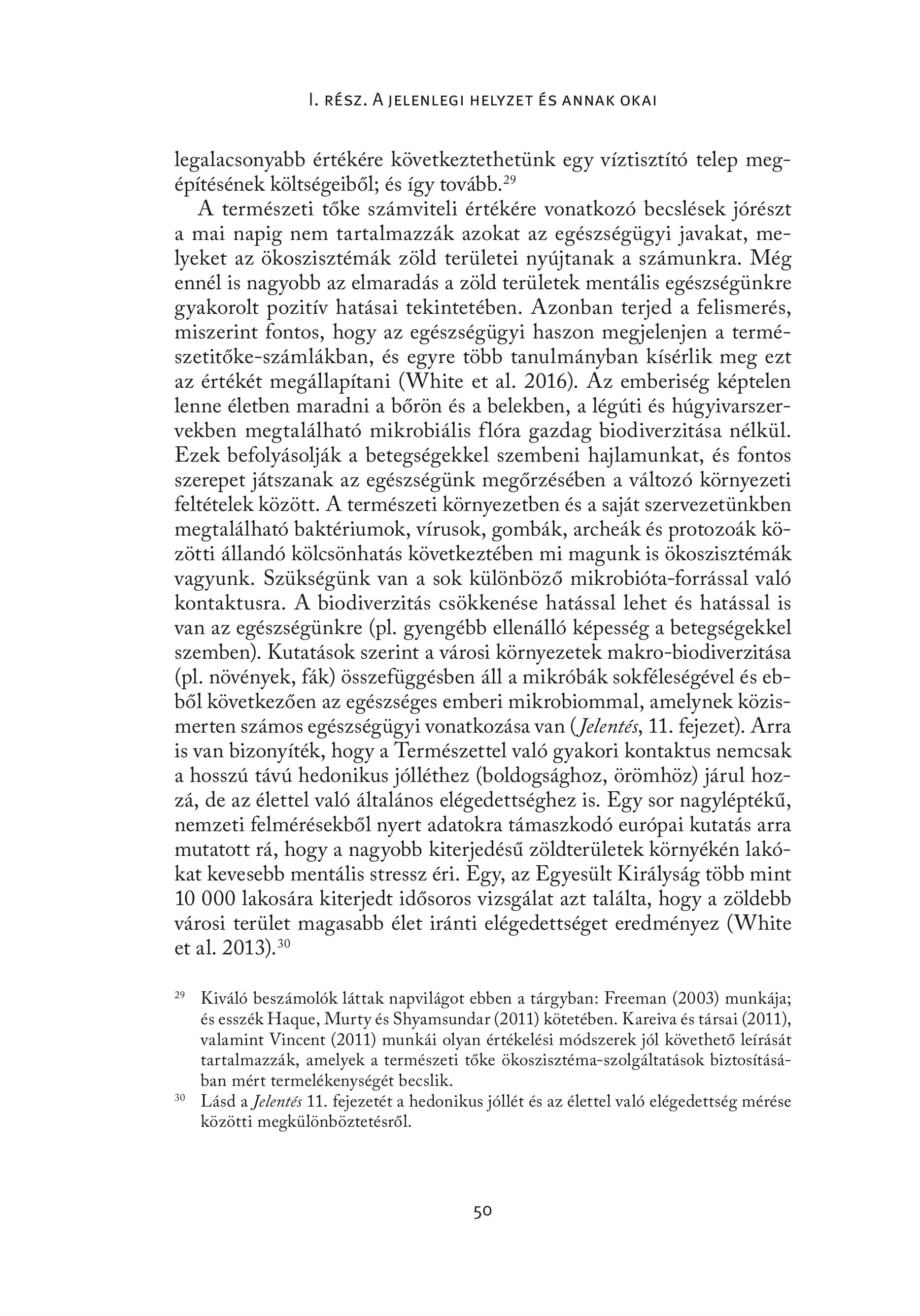 I. RÉSZ. A JELENLEGI HELYZET ÉS ANNAK OKAI legalacsonyabb értékére következtethetünk egy víztisztító telep megépítésének költségeiből; és igy toväbb.?° A természeti tőke számviteli értékére vonatkozó becslések jórészt a mai napig nem tartalmazzák azokat az egészségügyi javakat, melyeket az ökoszisztémák zöld területei nyújtanak a számunkra. Még ennél is nagyobb az elmaradás a zöld területek mentális egészségünkre gyakorolt pozitív hatásai tekintetében. Azonban terjed a felismerés, miszerint fontos, hogy az egészségügyi haszon megjelenjen a természetitőke-számlákban, és egyre több tanulmányban kísérlik meg ezt az értékét megállapítani (White et al. 2016). Az emberiség képtelen lenne életben maradni a bőrön és a belekben, a légúti és húgyivarszervekben megtalálható mikrobiális flóra gazdag biodiverzitása nélkül. Ezek befolyásolják a betegségekkel szembeni hajlamunkat, és fontos szerepet játszanak az egészségünk megőrzésében a változó környezeti feltételek között. A természeti környezetben és a saját szervezetünkben megtalálható baktériumok, vírusok, gombák, archeák és protozoák közötti állandó kölcsönhatás következtében mi magunk is ökoszisztémák vagyunk. Szükségünk van a sok különböző mikrobióta-forrással való kontaktusra. A biodiverzitás csökkenése hatással lehet és hatással is van az egészségünkre (pl. gyengébb ellenálló képesség a betegségekkel szemben). Kutatások szerint a városi környezetek makro-biodiverzitása (pl. növények, fák) összefüggésben áll a mikróbák sokféleségével és ebből következően az egészséges emberi mikrobiommal, amelynek közismerten számos egészségügyi vonatkozása van ( Jelenzés, 11. fejezet). Arra is van bizonyíték, hogy a lermészettel való gyakori kontaktus nemcsak a hosszú távú hedonikus jólléthez (boldogsághoz, örömhöz) járul hozzá, de az élettel való általános elégedettséghez is. Egy sor nagyléptékű, nemzeti felmérésekből nyert adatokra támaszkodó európai kutatás arra mutatott rá, hogy a nagyobb kiterjedésű zöldterületek környékén lakókat kevesebb mentális stressz éri. Egy, az Egyesült Királyság több mint 10 000 lakosára kiterjedt idősoros vizsgálat azt találta, hogy a zöldebb városi terület magasabb élet iránti elégedettséget eredményez (White et al. 2013).? 3 Kiváló beszámolók láttak napvilágot ebben a tárgyban: Freeman (2003) munkája; és esszék Hague, Murty és Shyamsundar (2011) kötetében. Kareiva és társai (2011), valamint Vincent (2011) munkái olyan értékelési módszerek jól követhető leírását tartalmazzák, amelyek a természeti tőke ökoszisztéma-szolgáltatások biztosításában mért termelékenységét becslik. Lásd a Jelentés 11. fejezetét a hedonikus jóllét és az élettel való elégedettség mérése közötti megkülönböztetésről. 30 50