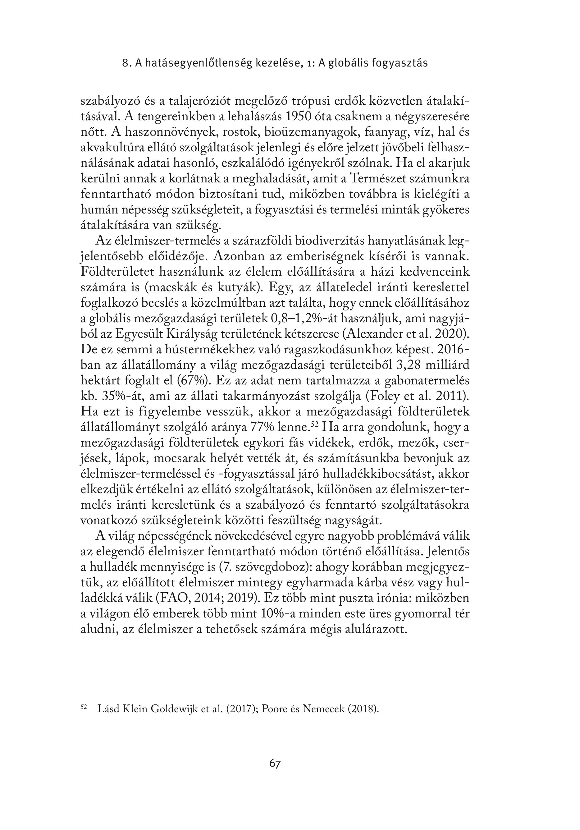 8. A hatásegyenlőtlenség kezelése, 1: A globális fogyasztás szabályozó és a talajeróziót megelőző trópusi erdők közvetlen átalakításával. A tengereinkben a lehalászás 1950 óta csaknem a négyszeresére nőtt. A haszonnövények, rostok, bioüzemanyagok, faanyag, víz, hal és akvakultúra ellátó szolgáltatások jelenlegi és előre jelzett jövőbeli felhasználásának adatai hasonló, eszkalálódó igényekről szólnak. Ha el akarjuk kerülni annak a korlátnak a meghaladását, amit a Természet számunkra fenntartható módon biztosítani tud, miközben továbbra is kielégíti a humán népesség szükségleteit, a fogyasztási és termelési minták gyökeres átalakítására van szükség. Az élelmiszer-termelés a szárazföldi biodiverzitás hanyatlásának legjelentősebb előidézője. Azonban az emberiségnek kísérői is vannak. Földterületet használunk az élelem előállítására a házi kedvenceink számára is (macskák és kutyák). Egy, az állateledel iránti kereslettel foglalkozó becslés a közelmúltban azt találta, hogy ennek előállításához a globális mezőgazdasági területek 0,8—1,290-át használjuk, ami nagyjából az Egyesült Királyság területének kétszerese (Alexander et al. 2020). De ez semmi a hústermékekhez való ragaszkodásunkhoz képest. 2016ban az állatállomány a világ mezőgazdasági területeiből 3,28 milliárd hektárt foglalt el (6790). Ez az adat nem tartalmazza a gabonatermelés kb. 35%-ät, ami az ällati takarmänyozäst szolgälja (Foley et al. 2011). Ha ezt is figyelembe vesszük, akkor a mezögazdasägi földterületek állatállományt szolgáló aránya 7796 lenne.? Ha arra gondolunk, hogy a mezőgazdasági földterületek egykori fás vidékek, erdők, mezők, cserjések, lápok, mocsarak helyét vették át, és számításunkba bevonjuk az élelmiszer-termeléssel és -fogyasztással járó hulladékkibocsátást, akkor elkezdjük értékelni az ellátó szolgáltatások, különösen az élelmiszer-termelés iránti keresletünk és a szabályozó és fenntartó szolgáltatásokra vonatkozó szükségleteink közötti feszültség nagyságát. A világ népességének növekedésével egyre nagyobb problémává válik az elegendő élelmiszer fenntartható módon történő előállítása. Jelentős a hulladék mennyisége is (7. szövegdoboz): ahogy korábban megjegyeztük, az előállított élelmiszer mintegy egyharmada kárba vész vagy hulladékká válik (FAO, 2014; 2019). Ez több mint puszta irónia: miközben a világon élő emberek több mint 10906-a minden este üres gyomorral tér aludni, az élelmiszer a tehetősek számára mégis alulárazott. 52 Lásd Klein Goldewijk et al. (2017); Poore és Nemecek (2018). 67
