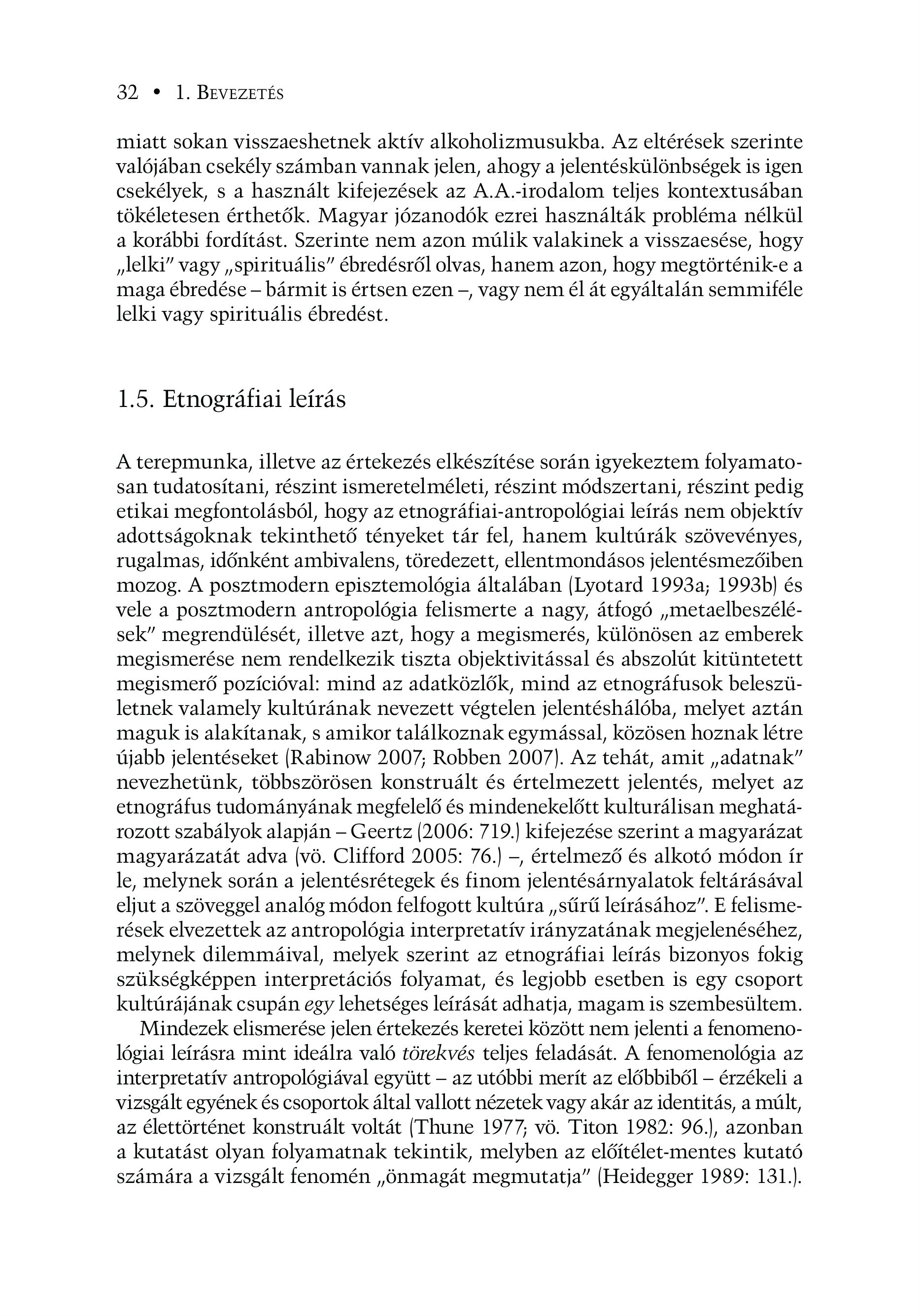 32 " 1. BEVEZETÉS miatt sokan visszaeshetnek aktív alkoholizmusukba. Az eltérések szerinte valójában csekély számban vannak jelen, ahogy a jelentéskülönbségek is igen csekélyek, s a használt kifejezések az A.A.-irodalom teljes kontextusában tökéletesen érthetők. Magyar józanodók ezrei használták probléma nélkül a korábbi fordítást. Szerinte nem azon múlik valakinek a visszaesése, hogy ,lelki" vagy , spirituális" ébredésről olvas, hanem azon, hogy megtörténik-e a maga ébredése - bármit is értsen ezen — vagy nem él át egyáltalán semmiféle lelki vagy spirituális ébredést. 1.5. Etnográfiai leírás A terepmunka, illetve az értekezés elkészítése során igyekeztem folyamatosan tudatosítani, részint ismeretelméleti, részint módszertani, részint pedig etikai megfontolásból, hogy az etnográfiai-antropológiai leírás nem objektív adottságoknak tekinthető tényeket tár fel, hanem kultúrák szövevényes, rugalmas, időnként ambivalens, töredezett, ellentmondásos jelentésmezőiben mozog. A posztmodern episztemológia általában (Lyotard 1993a; 1993b) és vele a posztmodern antropológia felismerte a nagy, átfogó , metaelbeszélések" megrendülését, illetve azt, hogy a megismerés, különösen az emberek megismerése nem rendelkezik tiszta objektivitással és abszolút kitüntetett megismerő pozícióval: mind az adatközlők, mind az etnográfusok beleszületnek valamely kultúrának nevezett végtelen jelentéshálóba, melyet aztán maguk is alakítanak, s amikor találkoznak egymással, közösen hoznak létre újabb jelentéseket (Rabinow 2007; Robben 2007]. Az tehát, amit , adatnak" nevezhetünk, többszörösen konstruált és értelmezett jelentés, melyet az etnográfus tudományának megfelelő és mindenekelőtt kulturálisan meghatározott szabályok alapján — Geertz (2006: 719.) kifejezése szerint a magyarázat magyarázatát adva (vö. Clifford 2005: 76.) —, értelmező és alkotó módon ír le, melynek során a jelentésrétegek és finom jelentésárnyalatok feltárásával eljut a szöveggel analóg módon felfogott kultúra , sűrű leírásához". E felismerések elvezettek az antropológia interpretatív irányzatának megjelenéséhez, melynek dilemmáival, melyek szerint az etnográfiai leírás bizonyos fokig szükségképpen interpretációs folyamat, és legjobb esetben is egy csoport kultúrájának csupán egy lehetséges leírását adhatja, magam is szembesültem. Mindezek elismerése jelen értekezés keretei között nem jelenti a fenomenológiai leírásra mint ideálra való törekvés teljes feladását. A fenomenológia az interpretatív antropológiával együtt — az utóbbi merít az előbbiből — érzékeli a vizsgált egyének és csoportok által vallott nézetek vagy akár az identitás, a múlt, az élettérténet konstruält voltät (Thune 1977; vö. Titon 1982: 96.), azonban a kutatást olyan folyamatnak tekintik, melyben az előítélet-mentes kutató számára a vizsgált fenomén , önmagát megmutatja" (Heidegger 1989: 131.).