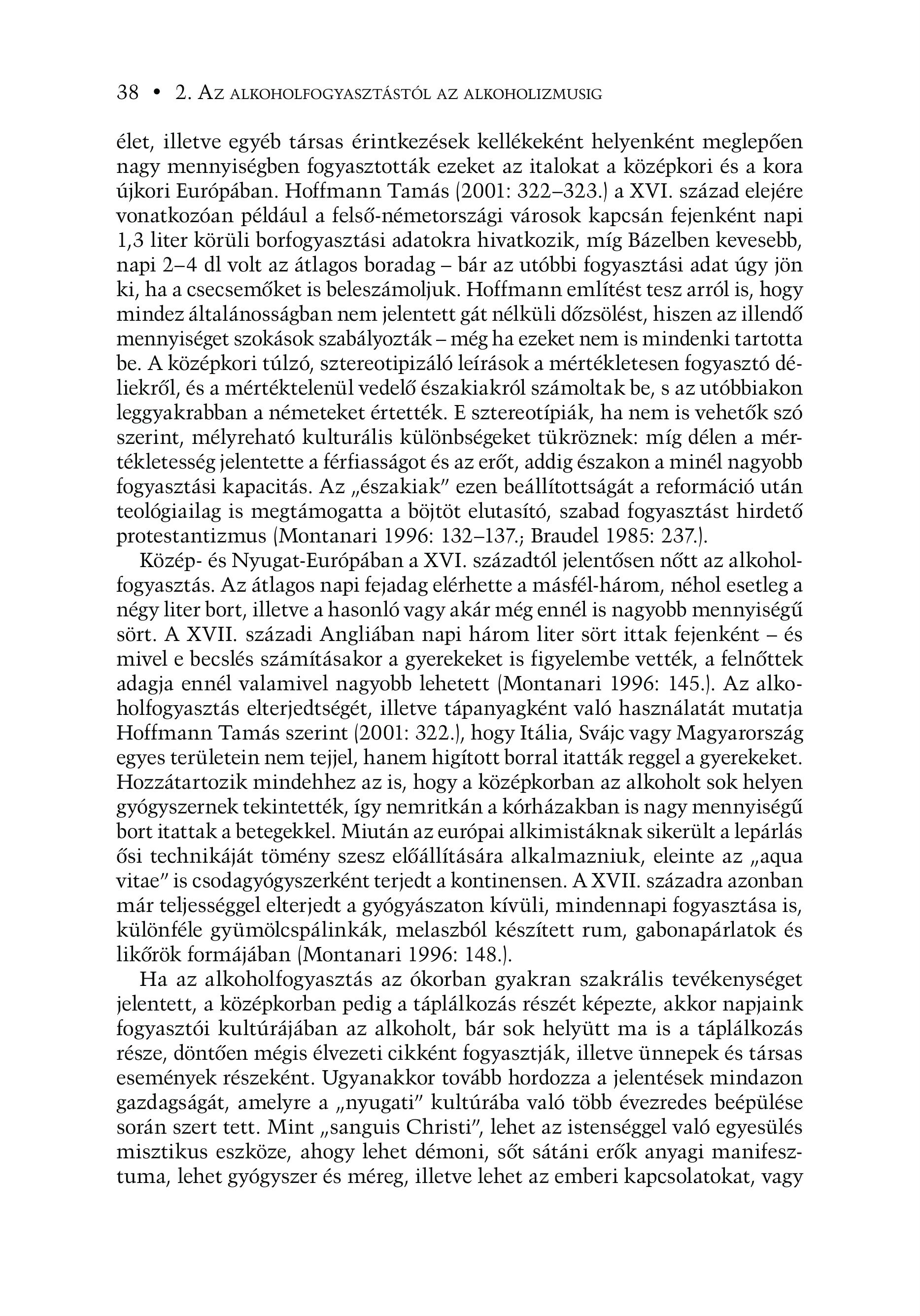 38 s 2. AZ ALKOHOLFOGYASZTÁSTÓL AZ ALKOHOLIZMUSIG élet, illetve egyéb társas érintkezések kellékeként helyenként meglepően nagy mennyiségben fogyasztották ezeket az italokat a középkori és a kora újkori Európában. Hoffmann Tamás (2001: 322—323.) a XVI. század elejére vonatkozóan például a felső-németországi városok kapcsán fejenként napi 1,3 liter körüli borfogyasztási adatokra hivatkozik, míg Bázelben kevesebb, napi 2-4 dl volt az ätlagos boradag - bár az utóbbi fogyasztási adat úgy jön ki, ha a csecsemőket is beleszámoljuk. Hoffmann említést tesz arról is, hogy mindez általánosságban nem jelentett gát nélküli dőzsölést, hiszen az illendő mennyiséget szokások szabályozták — még ha ezeket nem is mindenki tartotta be. A középkori túlzó, sztereotipizáló leírások a mértékletesen fogyasztó déliekről, és a mértéktelenül vedelő északiakról számoltak be, s az utóbbiakon leggyakrabban a németeket értették. E sztereotípiák, ha nem is vehetők szó szerint, mélyreható kulturális különbségeket tükröznek: míg délen a mértékletesség jelentette a férfiasságot és az erőt, addig északon a minél nagyobb fogyasztási kapacitás. Az ,északiak" ezen beállítottságát a reformáció után teológiailag is megtámogatta a böjtöt elutasító, szabad fogyasztást hirdető protestantizmus (Montanari 1996: 132-137.; Braudel 1985: 237.). Közep- és Nyugat-Európában a XVI. századtól jelentősen nőtt az alkoholfogyasztás. Az átlagos napi fejadag elérhette a másfél-három, néhol esetleg a négy liter bort, illetve a hasonló vagy akár még ennél is nagyobb mennyiségű sört. A XVII. századi Angliában napi három liter sört ittak fejenként — és mivel e becslés számításakor a gyerekeket is figyelembe vették, a felnőttek adagja ennél valamivel nagyobb lehetett (Montanari 1996: 145.). Az alkoholfogyasztas elterjedtségét, illetve tápanyagként való használatát mutatja Hoffmann Tamas szerint (2001: 322.), hogy Itália, Svájc vagy Magyarország egyes tertiletein nem tejjel, hanem higitott borral itattak reggel a gyerekeket. Hozzátartozik mindehhez az is, hogy a középkorban az alkoholt sok helyen gyógyszernek tekintették, így nemritkán a kórházakban is nagy mennyiségű bort itattak a betegekkel. Miután az európai alkimistáknak sikerült a lepárlás ősi technikáját tömény szesz előállítására alkalmazniuk, eleinte az , agua vitae" is csodagyógyszerként terjedt a kontinensen. A XVII. századra azonban már teljességgel elterjedt a gyógyászaton kívüli, mindennapi fogyasztása is, különféle gyümölcspálinkák, melaszból készített rum, gabonapárlatok és likőrök formájában (Montanari 1996: 148.). Ha az alkoholfogyasztás az ókorban gyakran szakrális tevékenységet jelentett, a középkorban pedig a táplálkozás részét képezte, akkor napjaink fogyasztói kultúrájában az alkoholt, bár sok helyütt ma is a táplálkozás része, döntően mégis élvezeti cikként fogyasztják, illetve ünnepek és társas események részeként. Ugyanakkor tovább hordozza a jelentések mindazon gazdagságát, amelyre a , nyugati" kultúrába való több évezredes beépülése során szert tett. Mint , sanguis Christi", lehet az istenséggel való egyesülés misztikus eszköze, ahogy lehet démoni, sőt sátáni erők anyagi manifesztuma, lehet gyógyszer és méreg, illetve lehet az emberi kapcsolatokat, vagy