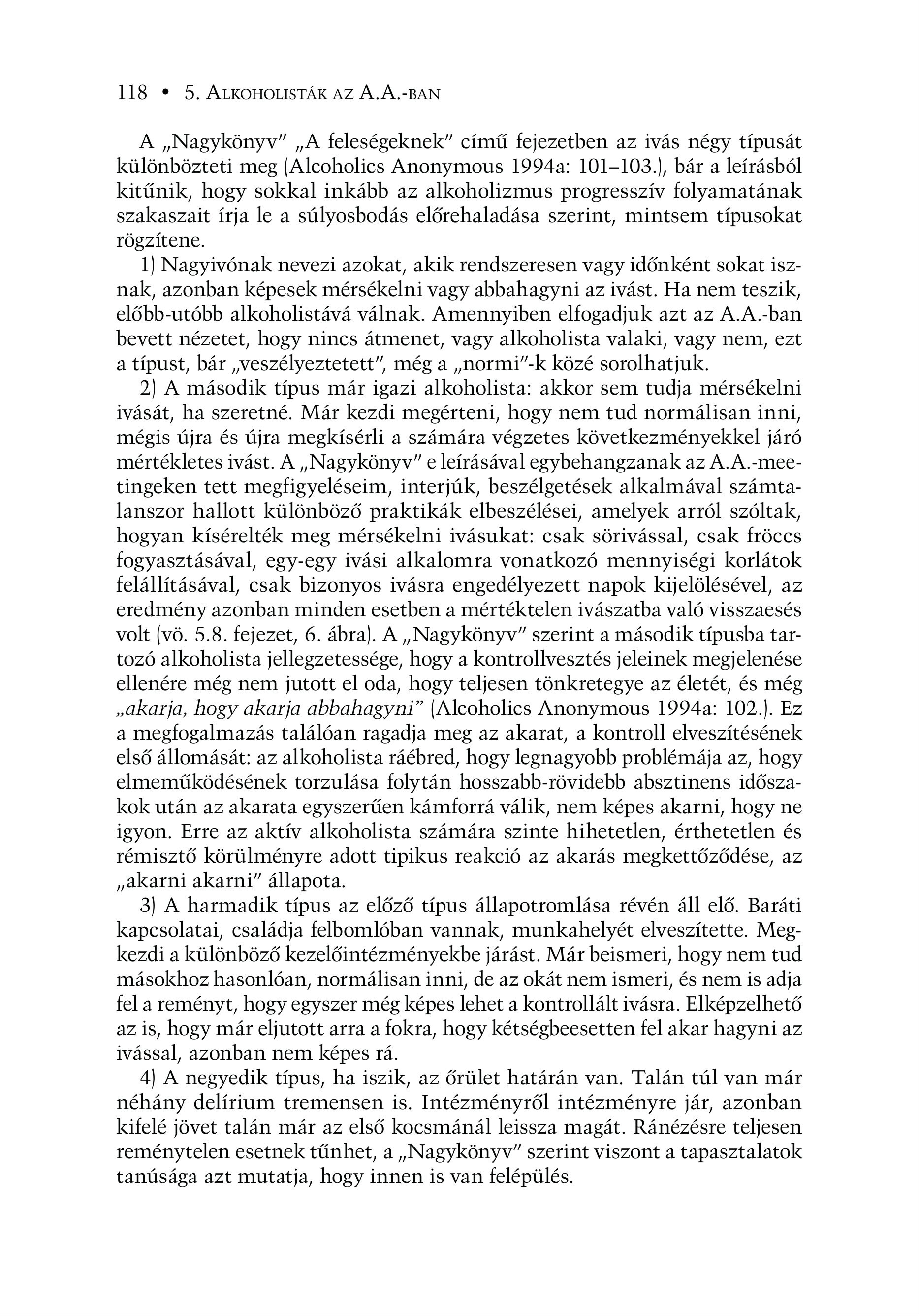 118 ¢ 5. ALKOHOLISTÁK AZ A.A.-BAN A „Nagykönyv” „A feleségeknek" című fejezetben az ivás négy típusát különbözteti meg (Alcoholics Anonymous 1994a: 101-103.), bär a leiräsböl kitünik, hogy sokkal inkäbb az alkoholizmus progressziv folyamatänak szakaszait irja le a sülyosbodäs elörehaladäsa szerint, mintsem tipusokat rögzitene. 1) Nagyivönak nevezi azokat, akik rendszeresen vagy időnként sokat isznak, azonban képesek mérsékelni vagy abbahagyni az ivást. Ha nem teszik, előbb-utóbb alkoholistává válnak. Amennyiben elfogadjuk azt az A.A.-ban bevett nézetet, hogy nincs átmenet, vagy alkoholista valaki, vagy nem, ezt a típust, bár , veszélyeztetett", még a , normi"-k közé sorolhatjuk. 2) A második típus már igazi alkoholista: akkor sem tudja mérsékelni ivását, ha szeretné. Már kezdi megérteni, hogy nem tud normálisan inni, mégis újra és újra megkísérli a számára végzetes következményekkel járó mértékletes ivást. A , Nagykönyv" e leírásával egybehangzanak az A.A.-meetingeken tett megfigyeléseim, interjúk, beszélgetések alkalmával számtalanszor hallott különböző praktikák elbeszélései, amelyek arról szóltak, hogyan kísérelték meg mérsékelni ivásukat: csak sörivással, csak fröccs fogyasztásával, egy-egy ivási alkalomra vonatkozó mennyiségi korlátok felállításával, csak bizonyos ivásra engedélyezett napok kijelölésével, az eredmény azonban minden esetben a mértéktelen ivászatba való visszaesés volt (vö. 5.8. fejezet, 6. ábra). A , Nagykönyv" szerint a második típusba tartozó alkoholista jellegzetessége, hogy a kontrollvesztés jeleinek megjelenése ellenére még nem jutott el oda, hogy teljesen tönkretegye az életét, és még , akarja, hogy akarja abbahagyni” (Alcoholics Anonymous 1994a: 102.). Ez a megfogalmazás találóan ragadja meg az akarat, a kontroll elveszítésének első állomását: az alkoholista ráébred, hogy legnagyobb problémája az, hogy elmeműködésének torzulása folytán hosszabb-rövidebb absztinens időszakok után az akarata egyszerűen kámforrá válik, nem képes akarni, hogy ne igyon. Erre az aktív alkoholista számára szinte hihetetlen, érthetetlen és rémisztő körülményre adott tipikus reakció az akarás megkettőződése, az akarni akarni" állapota. 3) A harmadik típus az előző típus állapotromlása révén áll elő. Baráti kapcsolatai, családja felbomlóban vannak, munkahelyét elveszítette. Megkezdi a különböző kezelőintézményekbe járást. Már beismeri, hogy nem tud másokhoz hasonlóan, normálisan inni, de az okát nem ismeri, és nem is adja fel a reményt, hogy egyszer még képes lehet a kontrollált ivásra. Elképzelhető az is, hogy már eljutott arra a fokra, hogy kétségbeesetten fel akar hagyni az ivással, azonban nem képes rá. 4) A negyedik típus, ha iszik, az őrület határán van. Talán túl van már néhány delírium tremensen is. Intézményről intézményre jár, azonban kifelé jövet talán már az első kocsmánál leissza magát. Ránézésre teljesen reménytelen esetnek tűnhet, a , Nagykönyv" szerint viszont a tapasztalatok tanúsága azt mutatja, hogy innen is van felépülés.