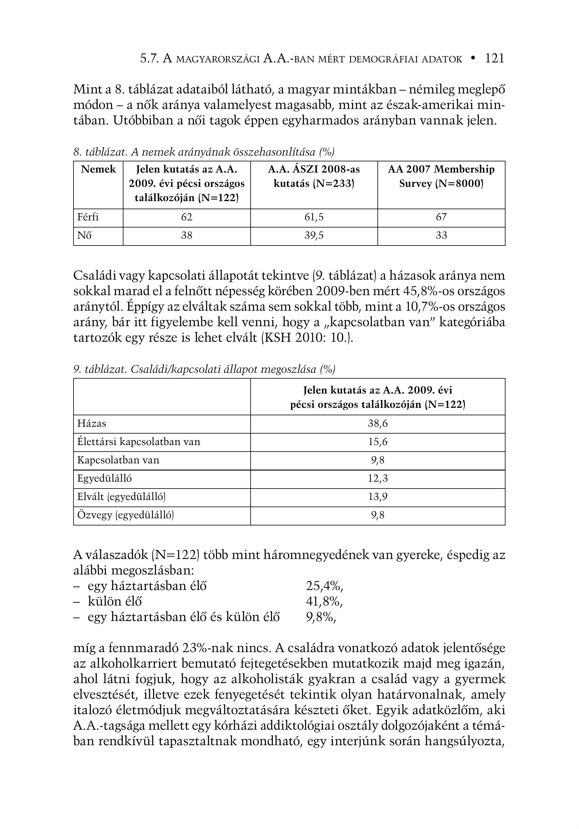 5.7. A MAGYARORSZÁGI A. A.-BAN MÉRT DEMOGRÁFIAI ADATOK ® 121 Mint a 8. táblázat adataiból látható, a magyar mintákban — némileg meglepő módon - a nők aránya valamelyest magasabb, mint az észak-amerikai mintában. Utóbbiban a női tagok éppen egyharmados arányban vannak jelen. 8. táblázat. A nemek arányának összehasonlítása (99) Nemek | Jelen kutatás az A.A. A.A. ÁSZI 2008-as AA 2007 Membership 2009. évi pécsi országos kutatäs (N=233) Survey (N=8000) talälkozöjan (N=122) Ferfi 62 61,5 67 Nő 38 39,5 33 Családi vagy kapcsolati állapotát tekintve (9. táblázat) a házasok aránya nem sokkal marad el a felnőtt népesség körében 2009-ben mért 45,896-os országos aránytól. Éppígy az elváltak száma sem sokkal több, mint a 10,799-os országos arány, bár itt figyelembe kell venni, hogy a , kapcsolatban van" kategóriába tartozók egy része is lehet elvált (KSH 2010: 10.). 9. táblázat. Családi/kapcsolati állapot megoszlása (99) Jelen kutatás az A.A. 2009. évi pécsi országos találkozóján (N-—122) Házas 38,6 Élettársi kapcsolatban van 15,6 Kapcsolatban van 9,8 Egyedülálló 12,3 Elvält (egyedülällö) 13,9 Özvegy legyedülálló) 9,8 A välaszadök (N=122) több mint häromnegyedenek van gyereke, Espedig az aläbbi megoszläsban: - egy háztartásban élő 25,4%, — külôn élé 41,8%, - egy háztartásban élő és külön élő 9,8%, míg a fennmarad6 23%-nak nincs. A családra vonatkozó adatok jelentősége az alkoholkarriert bemutató fejtegetésekben mutatkozik majd meg igazán, ahol látni fogjuk, hogy az alkoholisták gyakran a család vagy a gyermek elvesztését, illetve ezek fenyegetését tekintik olyan határvonalnak, amely italozó életmódjuk megváltoztatására készteti őket. Egyik adatközlőm, aki A.A.-tagsága mellett egy kórházi addiktológiai osztály dolgozójaként a témában rendkívül tapasztaltnak mondható, egy interjúnk során hangsúlyozta,