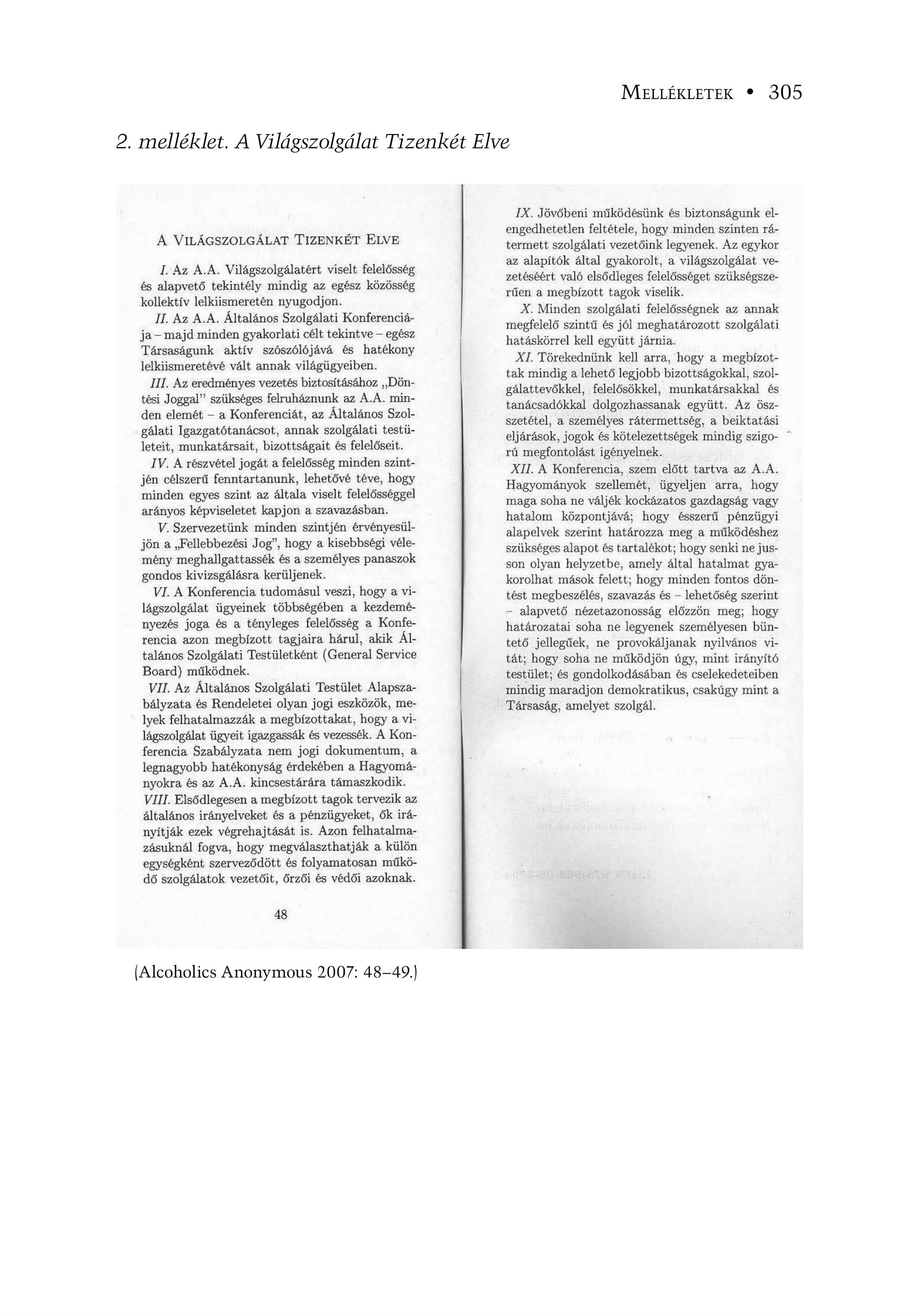 A VILÁGSZOLGÁLAT TIZENKÉT ELVE I. Az A.A. Világszolgálatért viselt felelősség és alapvető tekintély mindig az egész közösség kollektív lelkiismeretén nyugodjon. II. Az A.A. Általános Szolgálati Konferenciája— majd minden gyakorlati célt tekintve — egész Társaságunk aktív szószólójává és hatékony lelkiismeretévé vált annak világügyeiben. III. Az eredményes vezetés biztosításához ,,Döntési Joggal" szükséges felruháznunk az A.A. minden elemét — a Konferenciát, az Általános Szolgálati Igazgatótanácsot, annak szolgálati testületeit, munkatársait, bizottságait és felelőseit. IV. A részvétel jogát a felelősség minden szintjén célszerű fenntartanunk, lehetővé téve, hogy minden egyes szint az általa viselt felelősséggel arányos képviseletet kapjon a szavazásban. V. Szervezetünk minden szintjén érvényesüljön a , Fellebbezési Jog", hogy a kisebbségi vélemény meghallgattassék és a személyes panaszok gondos kivizsgálásra kerüljenek. VI. A Konferencia tudomásul veszi, hogy a világszolgálat ügyeinek többségében a kezdeményezés joga és a tényleges felelősség a Konferencia azon megbízott tagjáira hárul, akik ÄL talános Szolgálati Testületként (General Service Board) működnek. VII. Az Általános Szolgálati Testület Alapszabályzata és Rendeletei olyan jogi eszközök, melyek felhatalmazzák a megbízottakat, hogy a világszolgálat ügyeit igazgassák és vezessék. A Konferencia Szabályzata nem jogi dokumentum, a legnagyobb hatékonyság érdekében a Hagyományokra és az A.A. kincsestárára támaszkodik. VIII. Elsődlegesen a megbízott tagok tervezik az általános irányelveket és a pénzügyeket, ők irányítják ezek végrehajtását is. Azon felhatalmazásuknál fogva, hogy megválaszthatják a külön egységként szerveződött és folyamatosan működő szolgálatok vezetőit, őrzői és védői azoknak. 48 (Alcoholics Anonymous 2.007: 48-49.) IX. Jövőbeni működésünk és biztonságunk elengedhetetlen feltétele, hogy minden szinten rátermett szolgálati vezetőink legyenek. Az egykor az alapítók által gyakorolt, a világszolgálat vezetéséért való elsődleges felelősséget szükségszerűen a megbízott tagok viselik. X. Minden szolgálati felelősségnek az annak megfelelő szintű és jól meghatározott szolgálati hatáskörrel kell együtt járnia. XI. Törekednünk kell arra, hogy a megbízottak mindig a lehető legjobb bizottságokkal, szolgálattevőkkel, felelősökkel, munkatársakkal és tanácsadókkal dolgozhassanak együtt. Az öszszetétel, a személyes rátermettség, a beiktatási eljárások, jogok és kötelezettségek mindig szigo- ” rú megfontolást igényelnek. XII. A Konferencia, szem előtt tartva az A.A. Hagyományok szellemét, ügyeljen arra, hogy maga soha ne váljék kockázatos gazdagság vagy hatalom központjává; hogy ésszerű pénzügyi alapelvek szerint határozza meg a működéshez szükséges alapot és tartalékot; hogy senki ne jusson olyan helyzetbe, amely által hatalmat gyakorolhat mások felett; hogy minden fontos döntést megbeszélés, szavazás és — lehetőség szerint - alapvető nézetazonosság előzzön meg; hogy határozatai soha ne legyenek személyesen büntető jellegűek, ne provokáljanak nyilvános vitát; hogy soha ne működjön úgy, mint irányító testület; és gondolkodásában és cselekedeteiben mindig maradjon demokratikus, csakúgy mint a Társaság, amelyet szolgál.