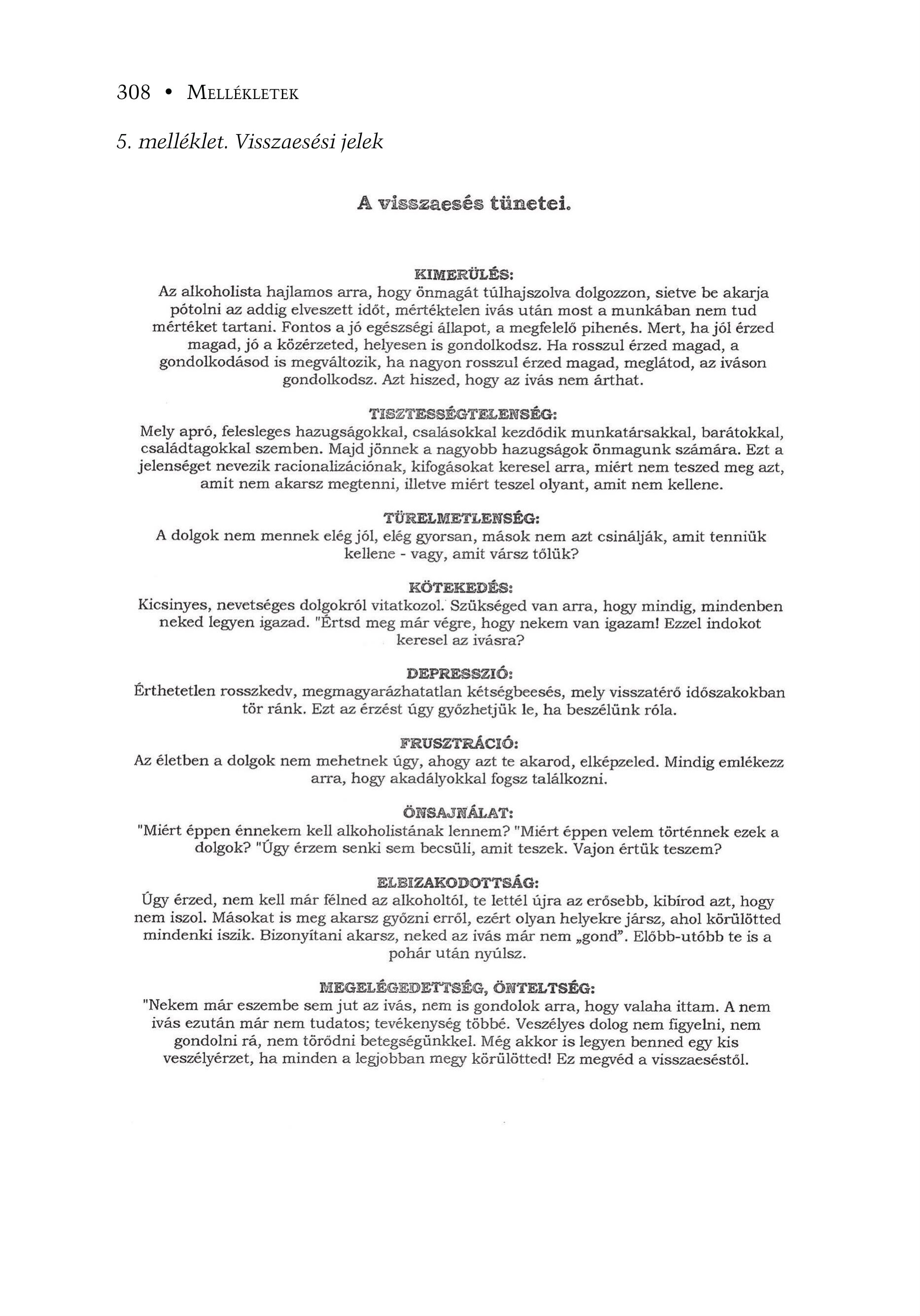 308 " MELLÉKLETEK 5. melléklet. Visszaesési jelek A visszaesés tünetei, KIMERULES: Az alkoholista hajlamos arra, hogy önmagát túlhajszolva dolgozzon, sietve be akarja pótolni az addig elveszett időt, mértéktelen ivás után most a munkában nem tud mértéket tartani. Fontos a jó egészségi állapot, a megfelelő pihenés. Mert, ha jól érzed magad, jó a közérzeted, helyesen is gondolkodsz. Ha rosszul érzed magad, a gondolkodásod is megváltozik, ha nagyon rosszul érzed magad, meglátod, az iváson gondolkodsz. Azt hiszed, hogy az ivás nem árthat. TISZTESSÉGTELENSÉG: Mely apró, felesleges hazugságokkal, csalásokkal kezdődik munkatársakkal, barátokkal, családtagokkal szemben. Majd jönnek a nagyobb hazugságok önmagunk számára. Ezt a jelenséget nevezik racionalizációnak, kifogásokat keresel arra, miért nem teszed meg azt, amit nem akarsz megtenni, illetve miért teszel olyant, amit nem kellene. TÜRELMETLENSÉG: A dolgok nem mennek elég jól, elég gyorsan, mások nem azt csinálják, amit tenniük kellene - vagy, amit vársz tőlük? KÖTEKEDÉS: Kicsinyes, nevetséges dolgokról vitatkozol. Szükséged van arra, hogy mindig, mindenben neked legyen igazad. "Értsd meg már végre, hogy nekem van igazam! Ezzel indokot keresel az ivásra? DEPRESSZIÓ: Érthetetlen rosszkedv, megmagyarázhatatlan kétségbeesés, mely visszatérő időszakokban tör ránk. Ezt az érzést úgy győzhetjük le, ha beszélünk róla. FRUSZTRÁCIÓ: Az életben a dolgok nem mehetnek úgy, ahogy azt te akarod, elképzeled. Mindig emlékezz arra, hogy akadályokkal fogsz találkozni. ÖNSAJNÁLAT: "Miért éppen énnekem kell alkoholistának lennem? "Miért éppen velem történnek ezek a dolgok? "Úgy érzem senki sem becsüli, amit teszek. Vajon értük teszem? ELBIZAKODOTTSÁG: Úgy érzed, nem kell már félned az alkoholtól, te lettél újra az erősebb, kibírod azt, hogy nem iszol. Másokat is meg akarsz győzni erről, ezért olyan helyekre jársz, ahol körülötted mindenki iszik. Bizonyítani akarsz, neked az ivás már nem , gond". Előbb-utóbb te is a pohár után nyúlsz. MEGELÉGEDETTSÉG, ÖNTELTSÉG: "Nekem már eszembe sem jut az ivás, nem is gondolok arra, hogy valaha ittam. A nem ivás ezután már nem tudatos; tevékenység többé. Veszélyes dolog nem figyelni, nem gondolni rá, nem törődni betegségünkkel. Még akkor is legyen benned egy kis veszélyérzet, ha minden a legjobban megy körülötted! Ez megvéd a visszaeséstől.