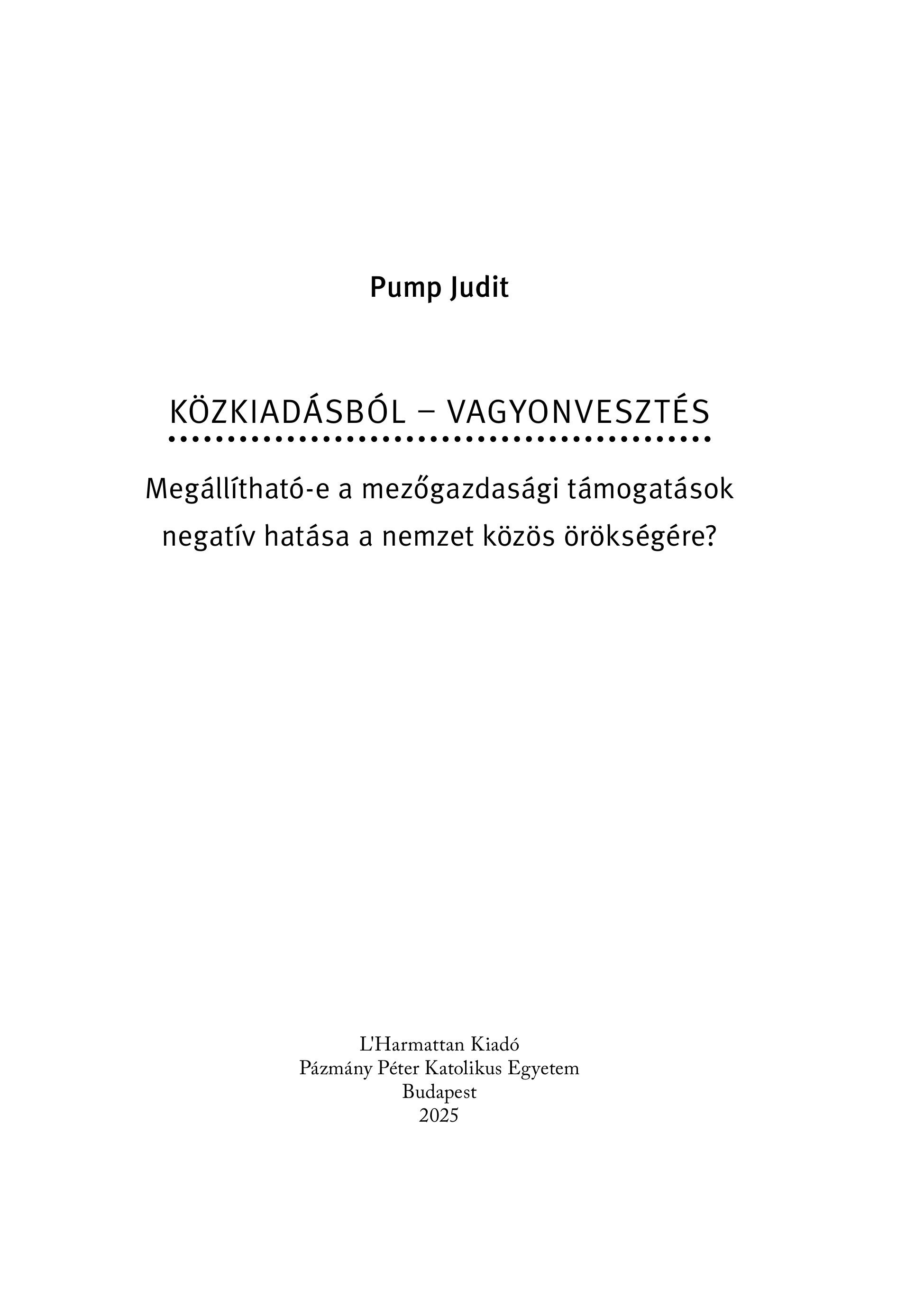 Pump Judit KÖZKIADÄSBÖL - VAGYONVESZTES Megállítható-e a mezőgazdasági támogatások negatív hatása a nemzet közös örökségére? L'Harmattan Kiadó Pázmány Péter Katolikus Egyetem Budapest 2025