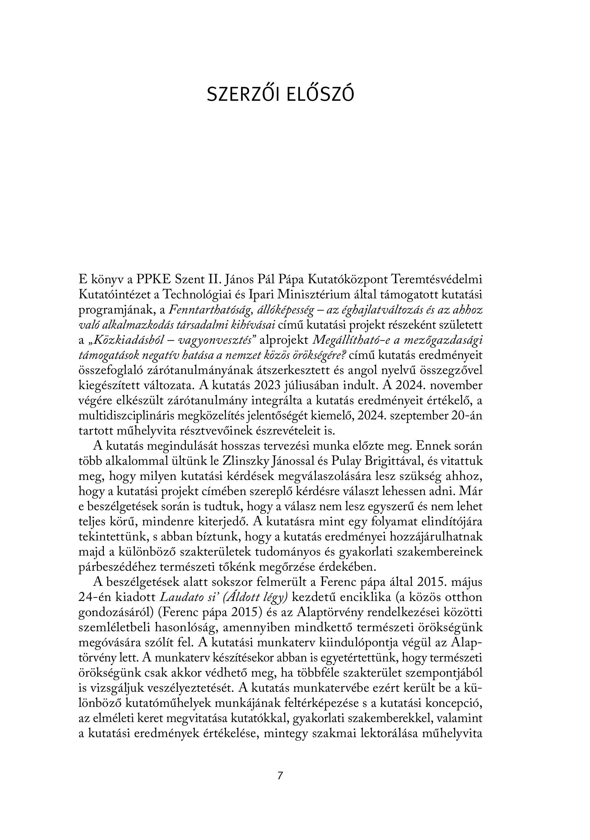 SZERZŐI ELŐSZÓ E könyv a PPKE Szent II. Janos Pal Papa Kutatöközpont Teremtesvedelmi Kutatóintézet a Technológiai és Ipari Minisztérium által támogatott kutatási programjának, a Fenntarthatóság, állóképesség — az éghajlatváltozás és az ahhoz való alkalmazkodás társadalmi kihívásai című kutatási projekt részeként született a , Közkiadásból — vagyonvesztés" alprojekt Megállítható-e a mezőgazdasági támogatások negatív hatása a nemzet közös örökségére? című kutatás eredményeit összefoglaló zárótanulmányának átszerkesztett és angol nyelvű összegzővel kiegészített változata. A kutatás 2023 júliusában indult. A 2024. november végére elkészült zárótanulmány integrálta a kutatás eredményeit értékelő, a multidiszciplináris megközelítés jelentőségét kiemelő, 2024. szeptember 20-án tartott műhelyvita résztvevőinek észrevételeit is. A kutatás megindulását hosszas tervezési munka előzte meg. Ennek során több alkalommal ültünk le Zlinszky Jánossal és Pulay Brigittával, és vitattuk meg, hogy milyen kutatási kérdések megválaszolására lesz szükség ahhoz, hogy a kutatási projekt címében szereplő kérdésre választ lehessen adni. Már e beszélgetések során is tudtuk, hogy a válasz nem lesz egyszerű és nem lehet teljes körű, mindenre kiterjedő. A kutatásra mint egy folyamat elindítójára tekintettünk, s abban bíztunk, hogy a kutatás eredményei hozzájárulhatnak majd a különböző szakterületek tudományos és gyakorlati szakembereinek párbeszédéhez természeti tőkénk megőrzése érdekében. A beszélgetések alatt sokszor felmerült a Ferenc pápa által 2015. május 24-én kiadott Laudato si" (Áldott légy) kezdetű enciklika (a közös otthon gondozásáról) (Ferenc pápa 2015) és az Alaptörvény rendelkezései közötti szemléletbeli hasonlóság, amennyiben mindkettő természeti örökségünk megóvására szólít fel. A kutatási munkaterv kiindulópontja végül az Alaptörvény lett. A munkaterv készítésekor abban is egyetértettünk, hogy természeti örökségünk csak akkor védhető meg, ha többféle szakterület szempontjából is vizsgáljuk veszélyeztetését. A kutatás munkatervébe ezért került be a különböző kutatóműhelyek munkájának feltérképezése s a kutatási koncepció, az elméleti keret megvitatása kutatókkal, gyakorlati szakemberekkel, valamint a kutatási eredmények értékelése, mintegy szakmai lektorálása műhelyvita